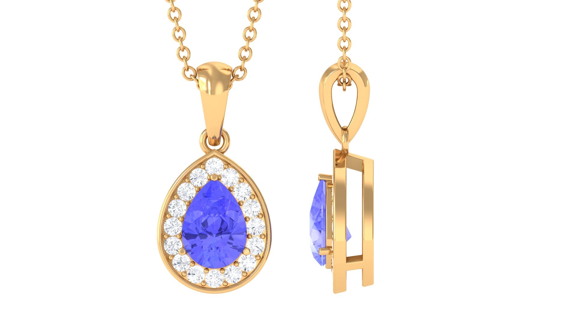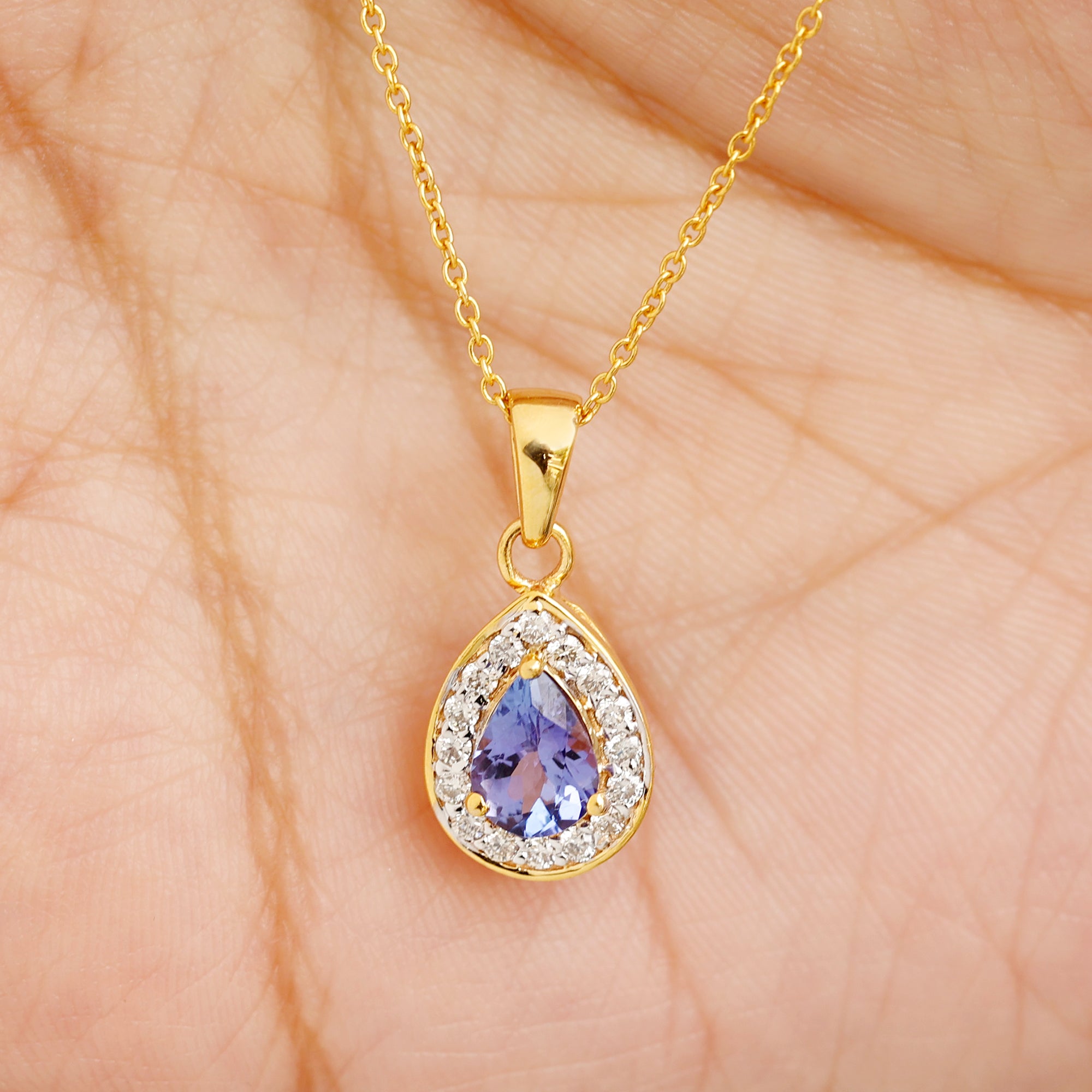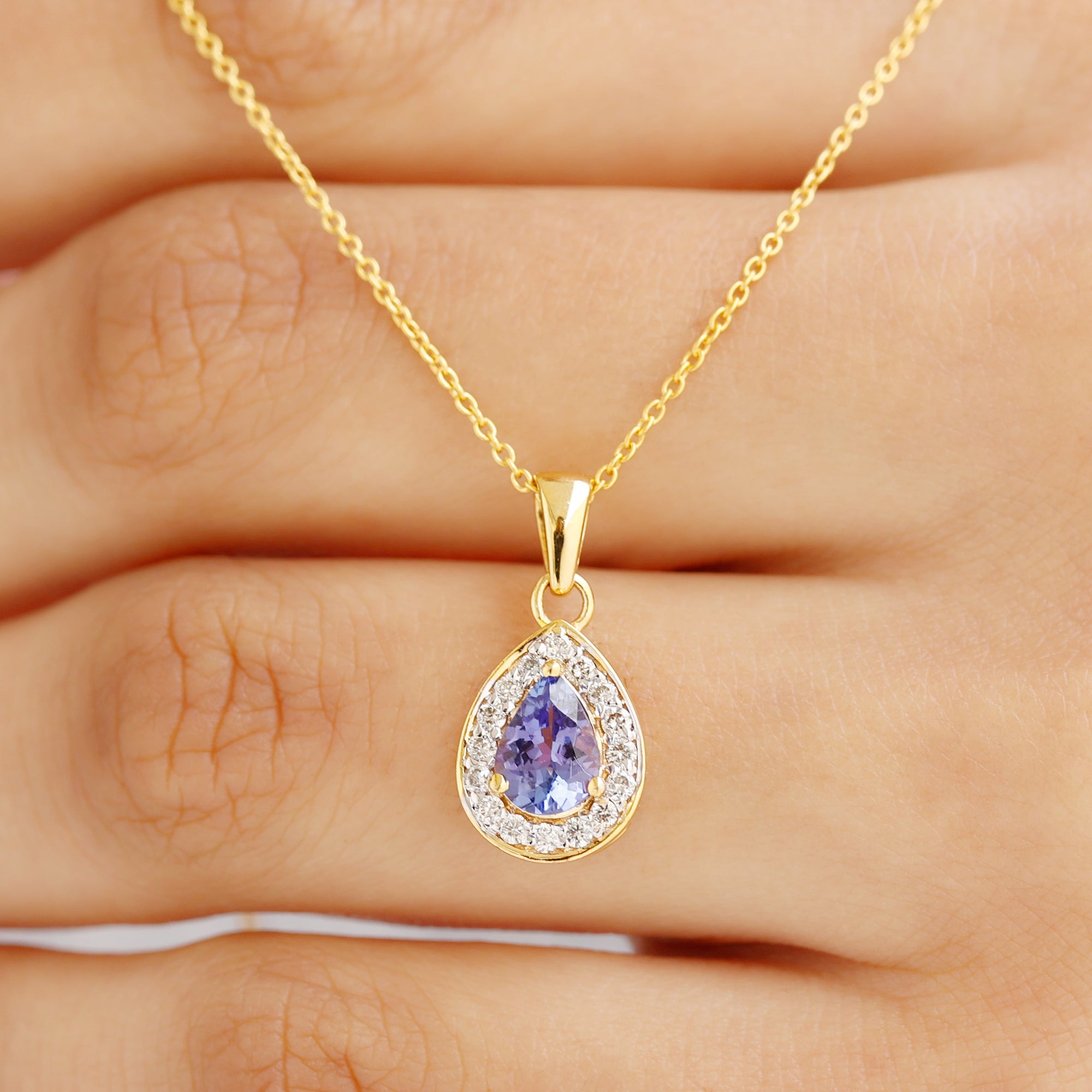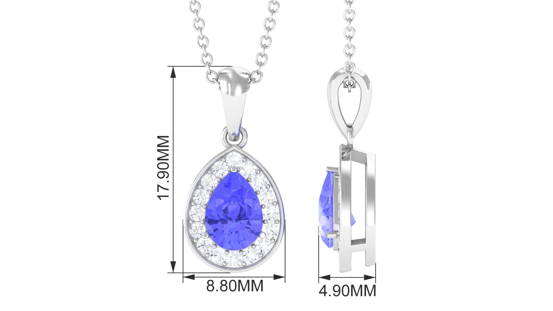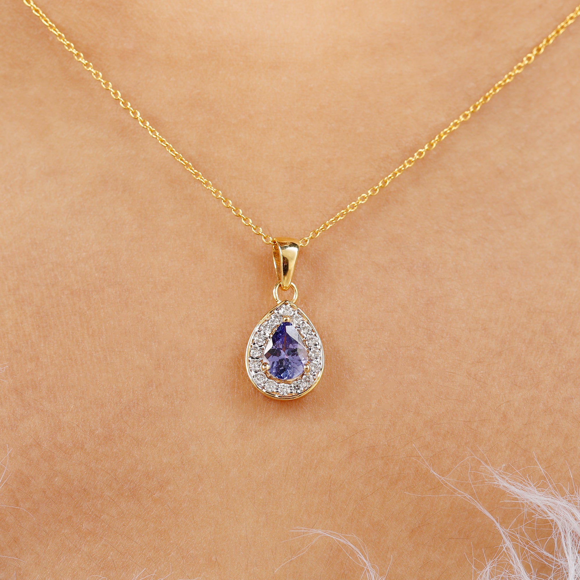 Explore the beauty of Tanzanite with this elegant pendant featuring pear-shaped tanzanite wrapped in a halo frame of diamond creating a sophisticated look. Adorn your neckline with this tanzanite pendant exuding elegance and charm on this Teardrop Pendant Necklace. Elevate your sense of style effortlessly from casual to formal with this drop pendant a timeless expression of refined elegance for any occasion.