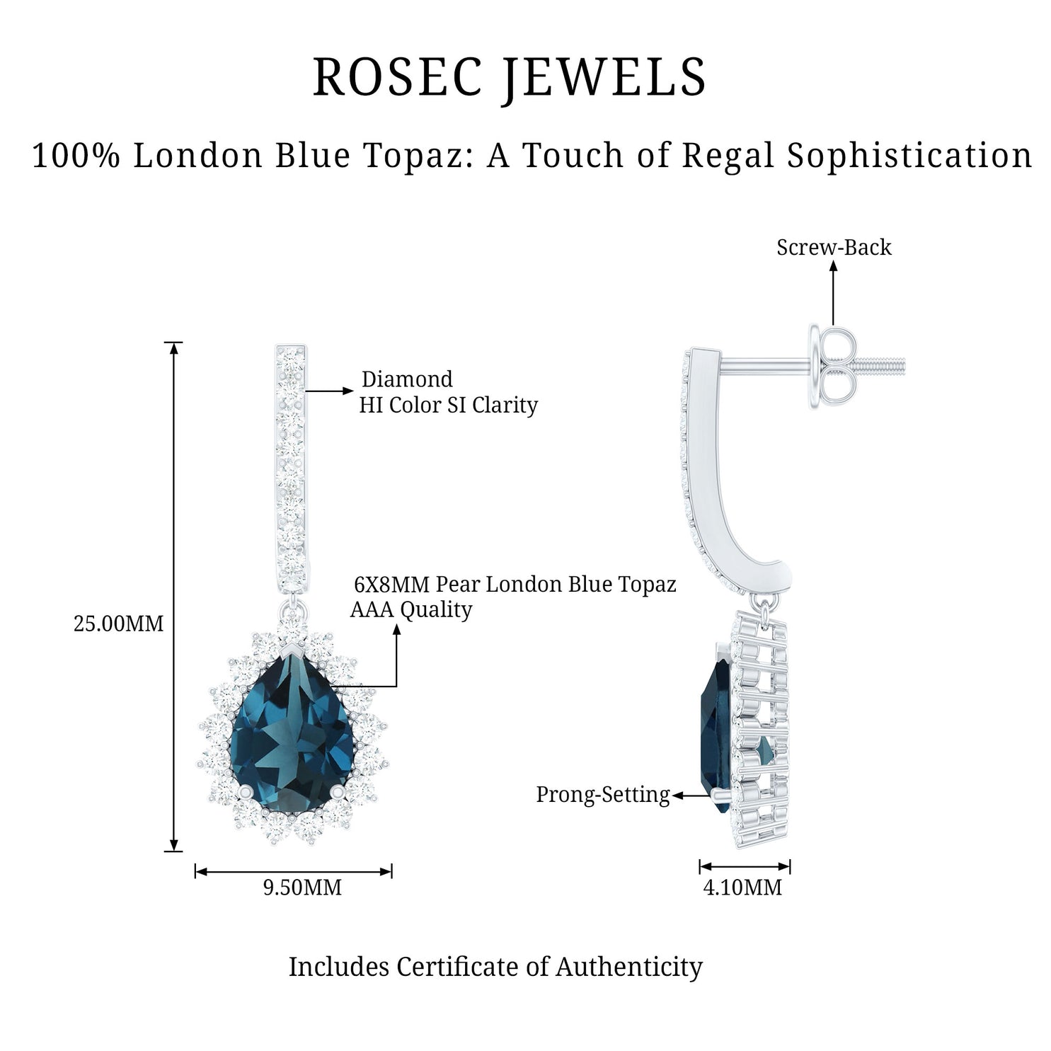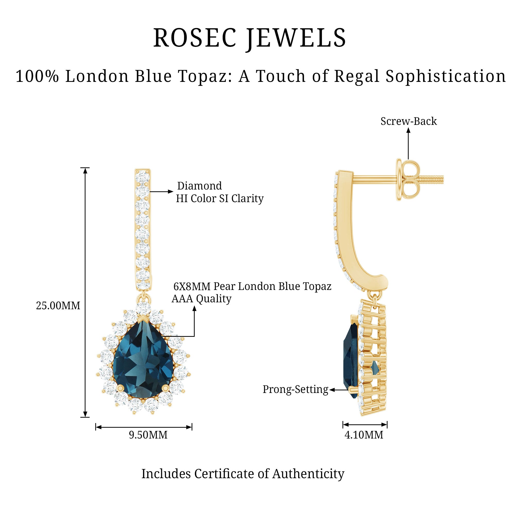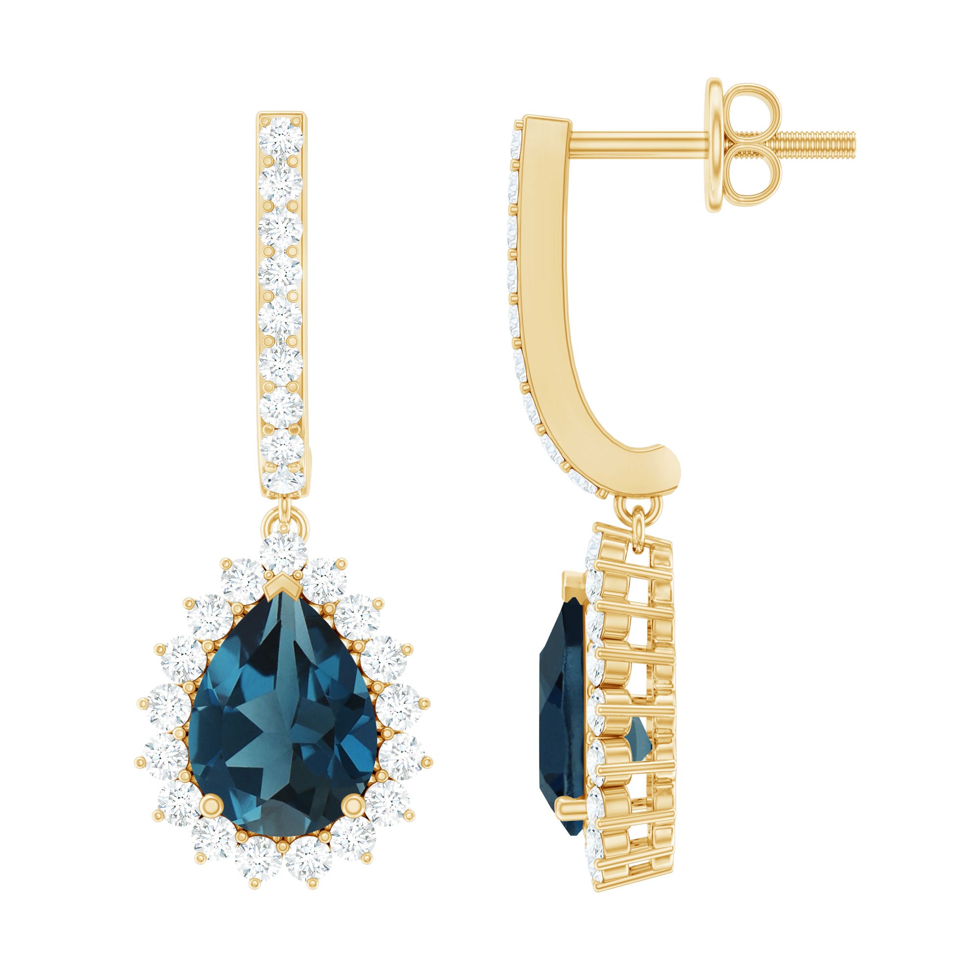 Step into effortless style with these London Blue Topaz Hoop Earrings, designed to bring sophistication and sparkle to any occasion. Designed with a 6X8 MM pear cut London Blue Topaz at the center, surrounded by a halo of round cut diamonds that add brilliance to the design. The vivid blue stone stands out beautifully, while the diamonds enhance its glow with a touch of refined luxury. The teardrop shape hangs from a sleek J-hoop, which is also adorned with small diamonds for an added shimmer. This thoughtful detail gives the Blue Topaz and Diamond Earrings an elegant finish that feels both modern and classic. With secure screw back closures, they stay comfortable and safe for all-day wear. Each gemstone is carefully selected for quality and clarity, ensuring a look that feels special yet easy to wear. Perfect for weddings, anniversaries, or personal milestones, these Pear Shaped Earrings are designed to capture attention while keeping their charm understated. Presented in a beautiful jewelry box, they are ready to gift or add to your own collection. The Blue Topaz Drop Earrings reflect style, confidence, and grace, offering a piece that shines with meaning and beauty for years to come.
