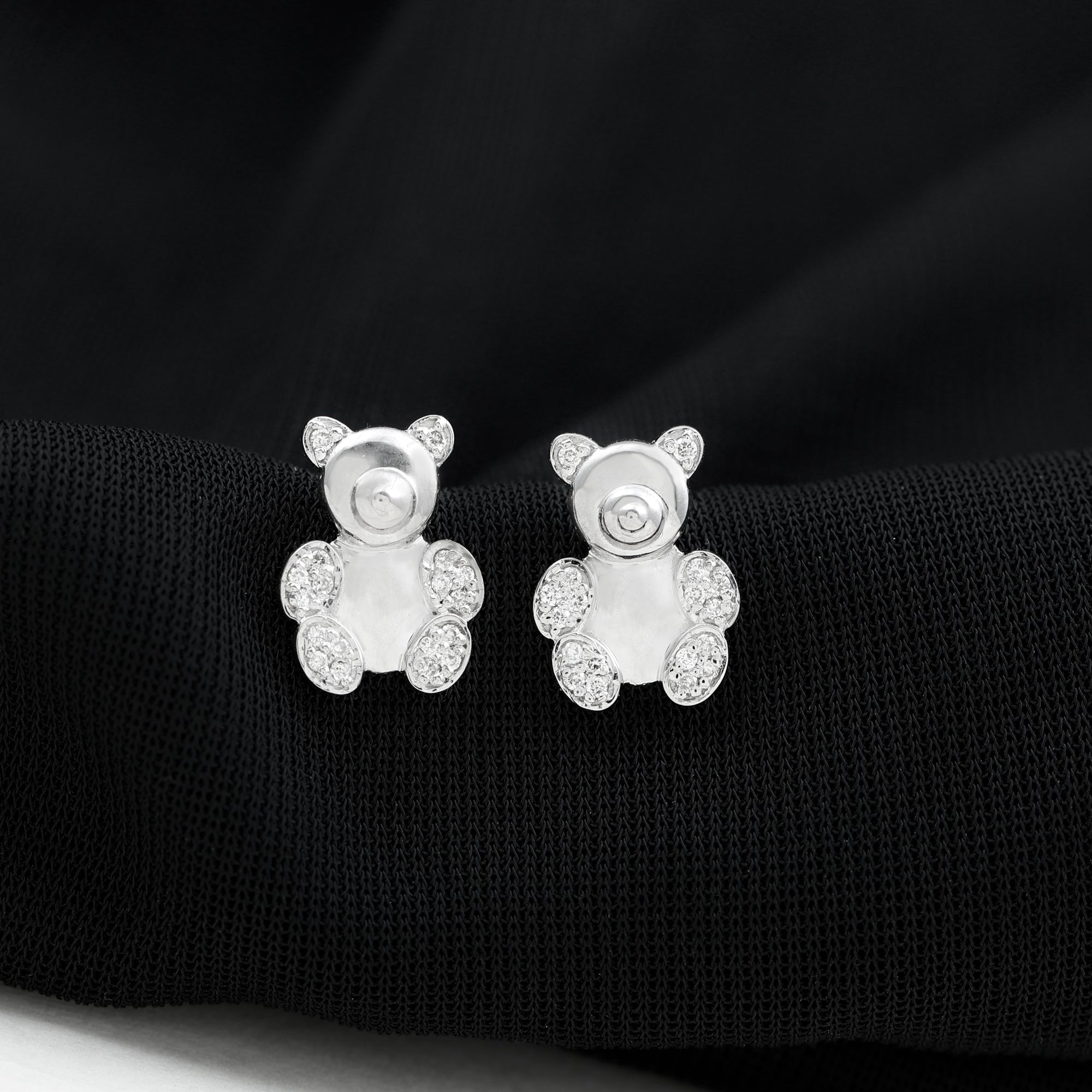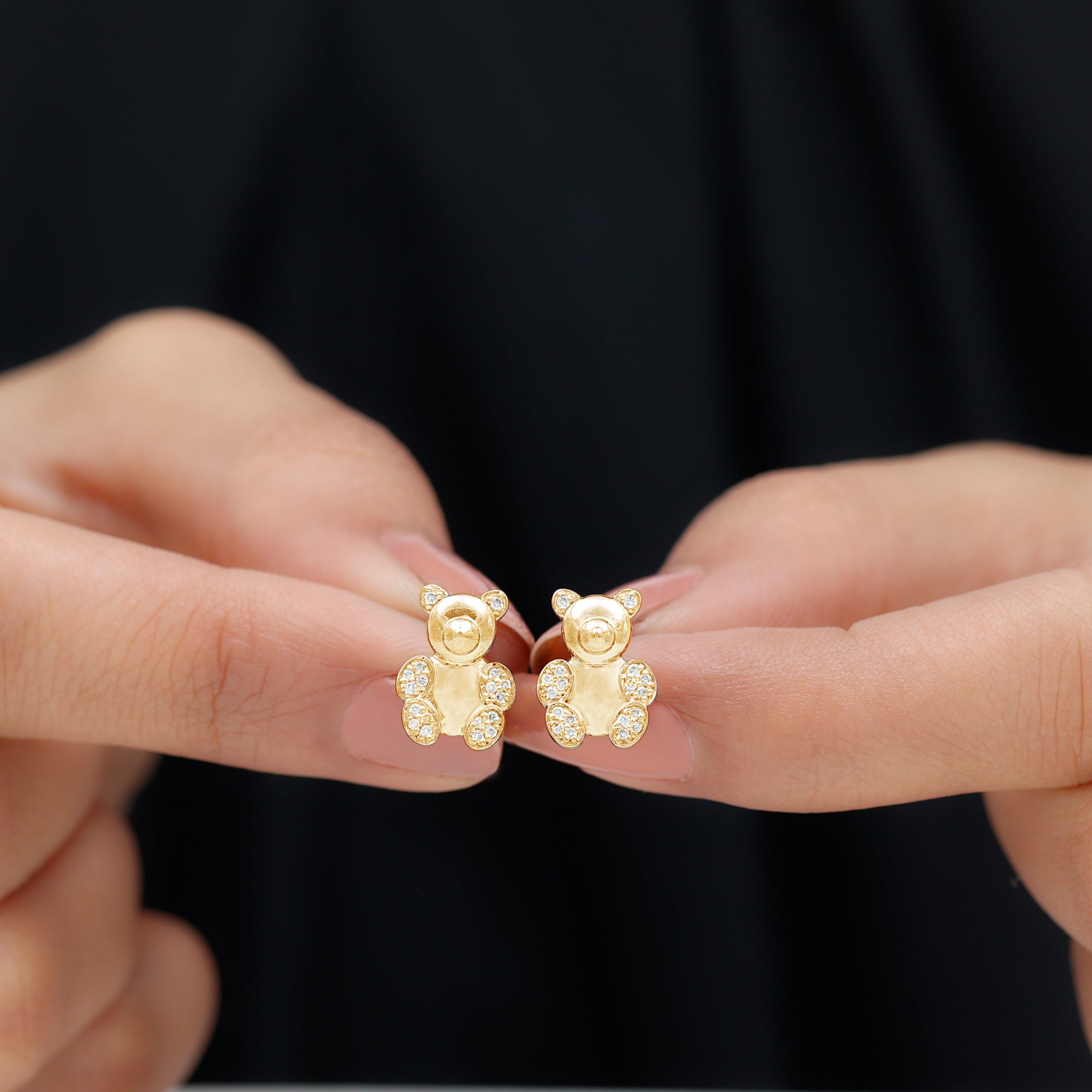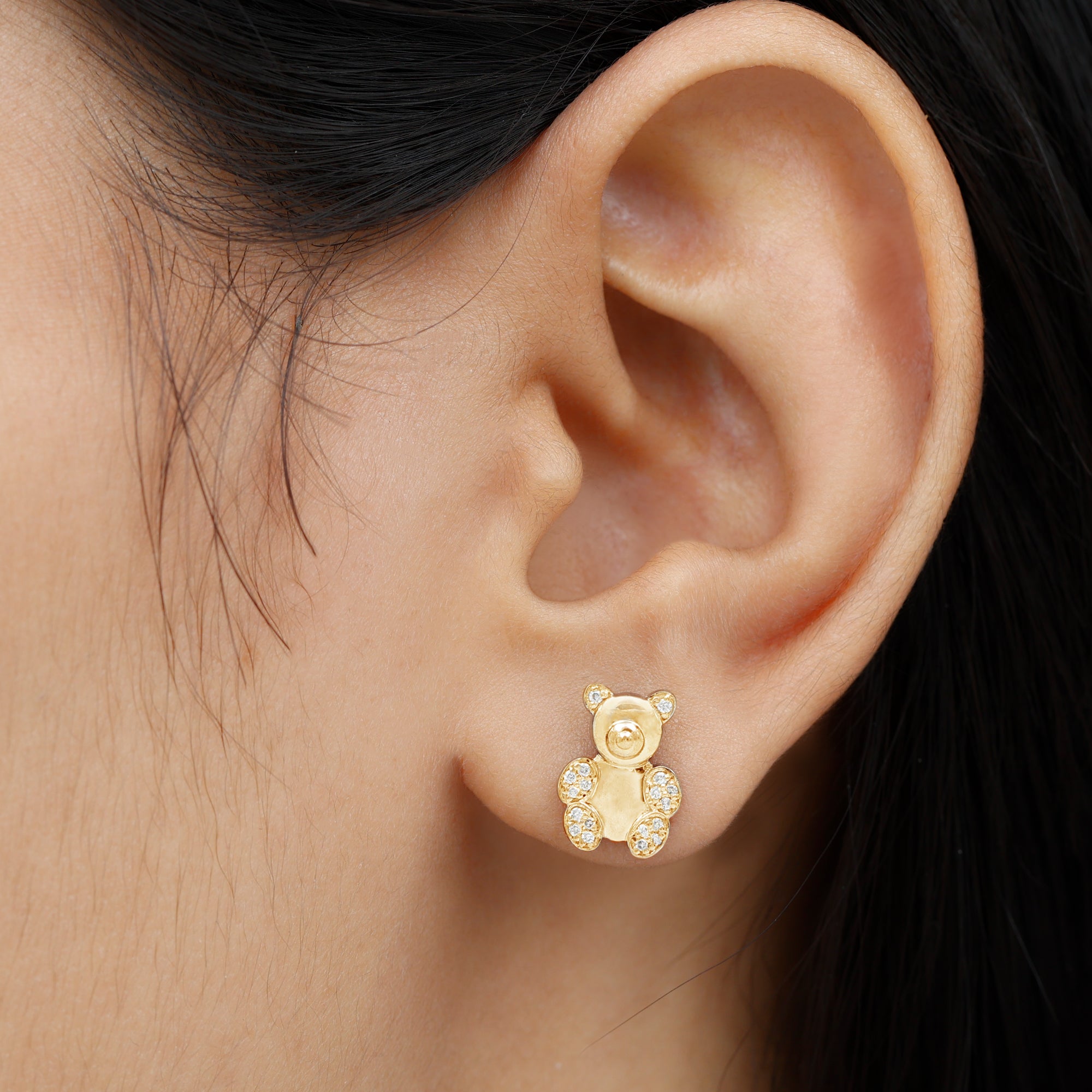 This Cute Teddy Bear Stud Earrings embellished with small Round Shape Diamonds are set in a Prong Setting, crafted in a Solid Gold Metal.