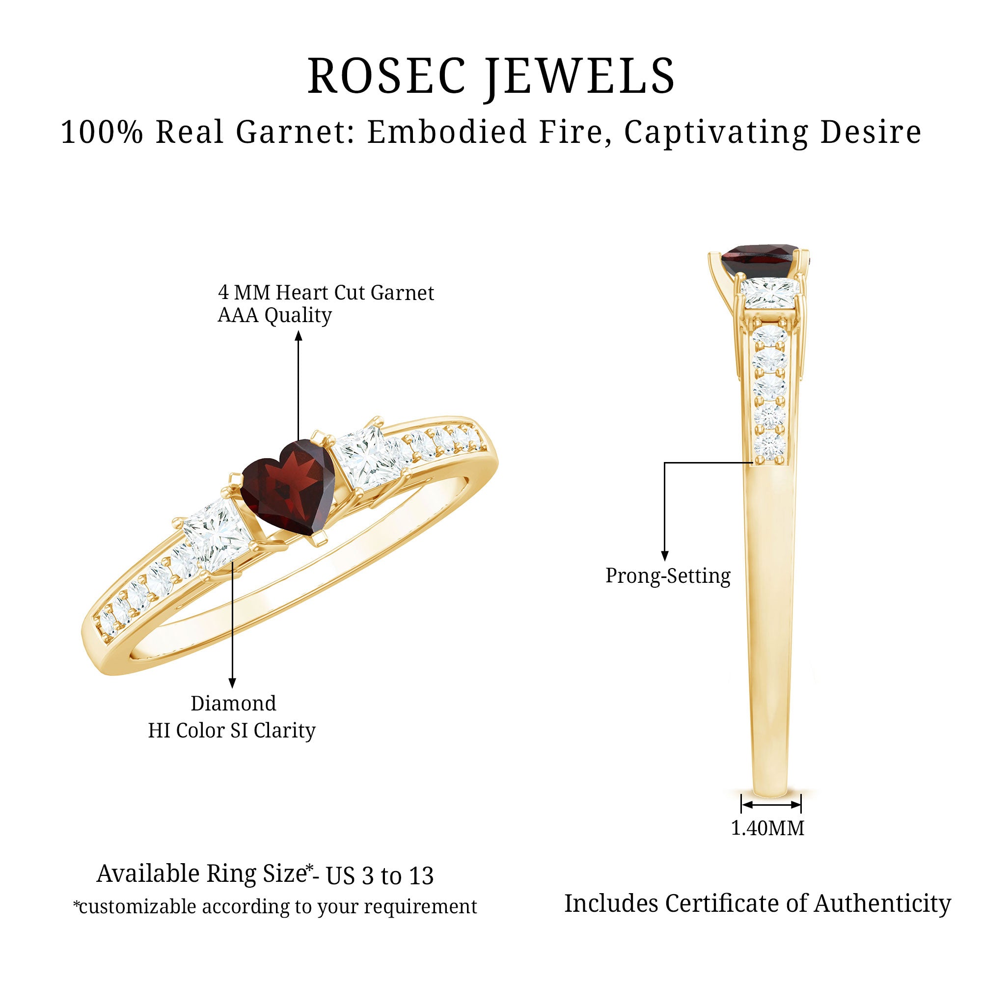 A heartfelt piece of jewelry, this Heart Promise Ring is a beautiful expression of love and devotion. The centerpiece is a stunning 4 mm Heart Shape Garnet set in Prong Setting, its deep red color evoking the warmth and passion of a truly unforgettable connection. On either side, a sparkling Princess Diamond adds a touch of elegance and timeless beauty, while the band is adorned with delicate round Diamond stones, creating a harmonious balance of light and sophistication. Every detail of this Garnet Diamond Ring is designed to capture the essence of a love that is pure, enduring, and full of promise. Whether you are marking a special milestone or committing to forever, this Garnet Heart Ring is the perfect symbol of your feelings. Its unique heart shape represents the depth of emotion, while the Diamond stones reflect the strength and brilliance of your bond. Presented in a signature jewelry box, this Red Garnet Ring comes in various sizes to ensure the perfect fit for your loved one.