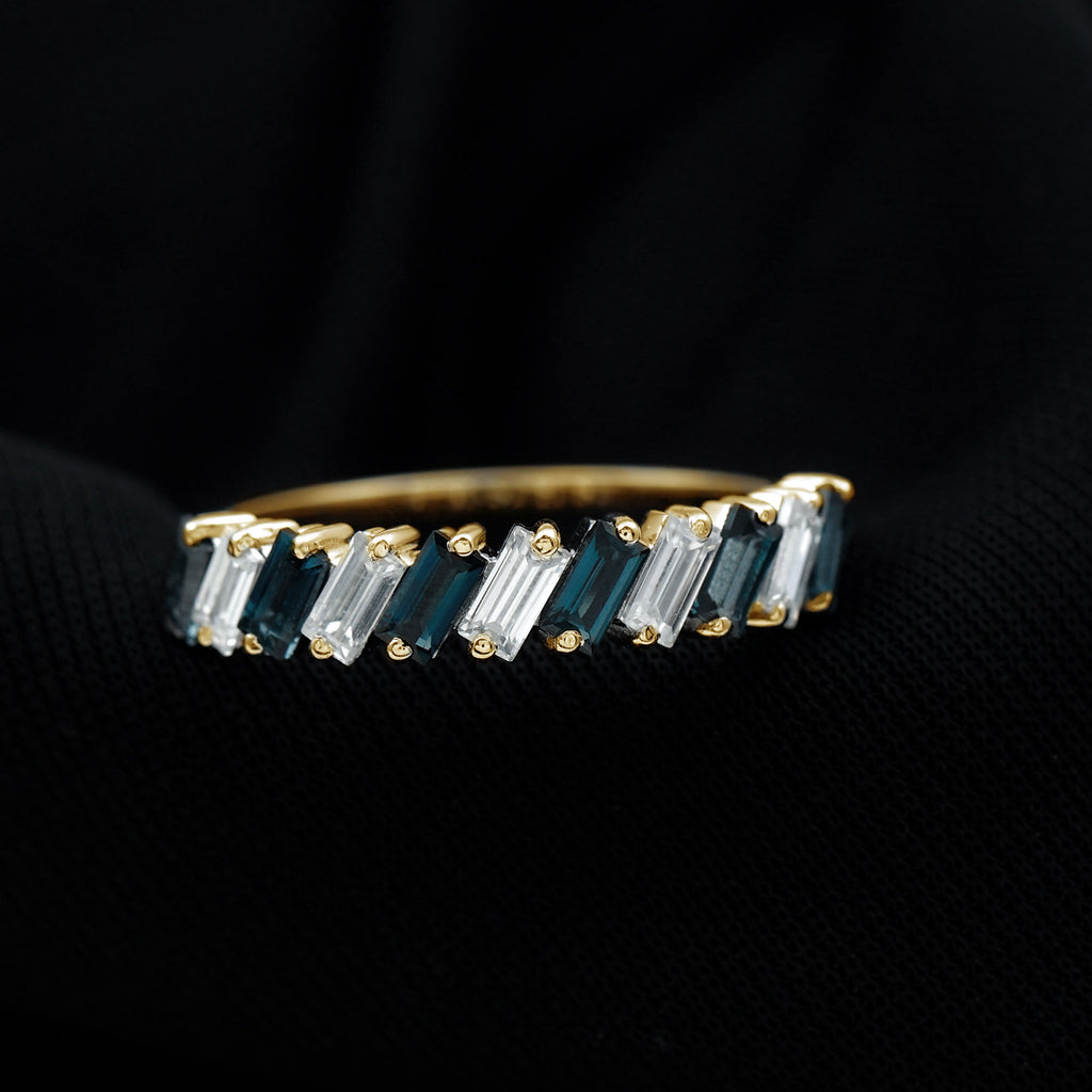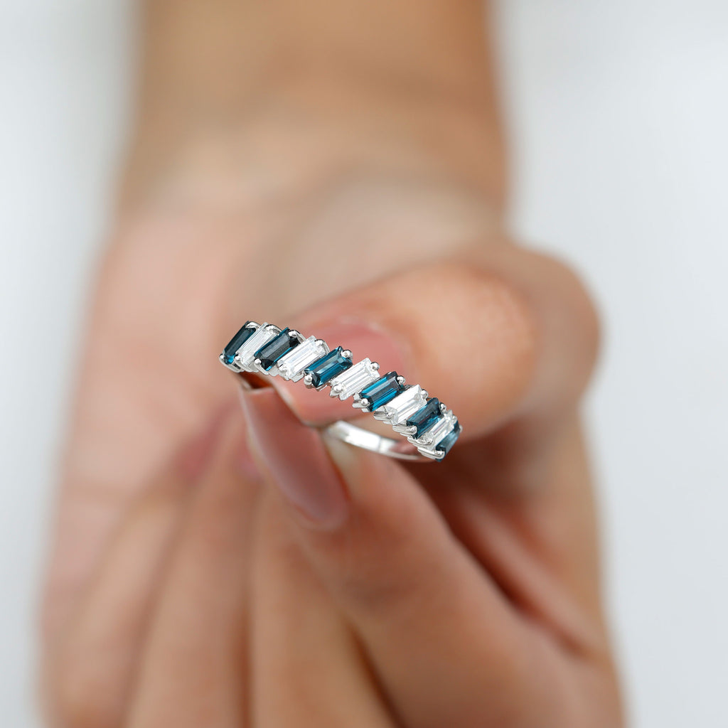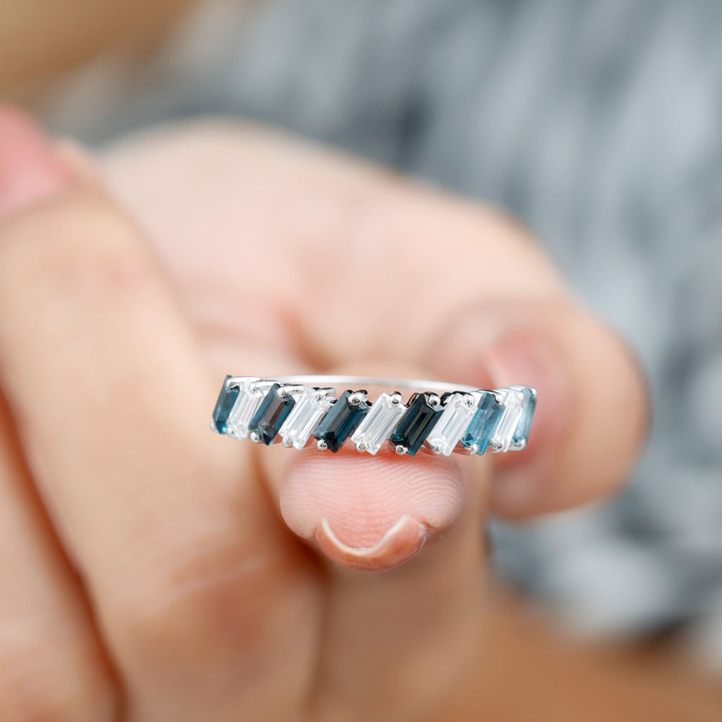 Exuding understated elegance, this London Blue Topaz Ring represents the ultimate declaration of love with its simple yet stylish design. The Baguette Shape London Blue Topaz, set in 2 prong setting alongside Moissanite as a Half Eternity Ring, signifies eternal love, artfully arranged in a tilted orientation. Its adaptable design renders it a refined piece of jewelry for your significant other. Serving as a representation of lasting love and romantic gestures, this Eternity Band for Women boasts unparalleled brilliance and sparkle, meticulously crafted to enhance the allure of each stone. It can be paired with other wedding bands or worn alone for a minimalist aesthetic. Its elegant design symbolizes everlasting love, making it an essential addition to any jewelry collection. Create unforgettable moments with this exquisitely designed Real Blue Topaz Eternity Ring. Its elegant design and striking hue make this Blue Topaz Wedding Band a distinctive addition to your most cherished occasions. This design is both straightforward and visually appealing, ideal for those who appreciate a classic aesthetic with a touch of boldness. Perfect for commemorating love, commitment, or personal achievements, this Eternity Stackable Ring serves as a considerate gift for birthdays, anniversaries, or simply as a thoughtful gesture. As the birthstone for December, london blue topaz also represents a significant gift for individuals born in that month. Whether worn alone or combined with other rings, this half eternity band provides both versatility and enduring style. The comfortable fit and polished finish ensure it can be worn daily. Made with AAA quality london blue topaz and premium metal, this Wedding Anniversary Ring is designed to endure and shine through every phase of life.