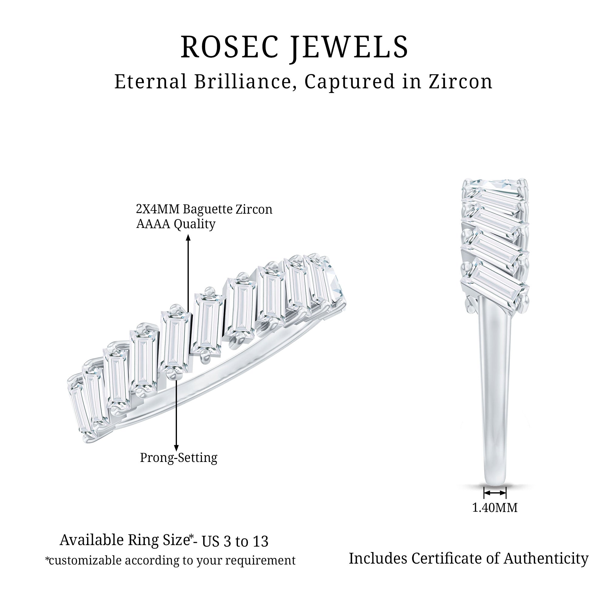 This half eternity ring features tilted baguette cut zircon stones set in 2 prong setting. The unique and modern design of the tilted baguette stones creates an eye-catching and sophisticated look. The zircon stones sparkle brilliantly, adding a touch of luxury and elegance to the ring. This ring is perfect for someone who appreciates a contemporary and bold design, with a hint of femininity. Its a beautiful accessory that can be worn on any occasion and is sure to make a statement.
