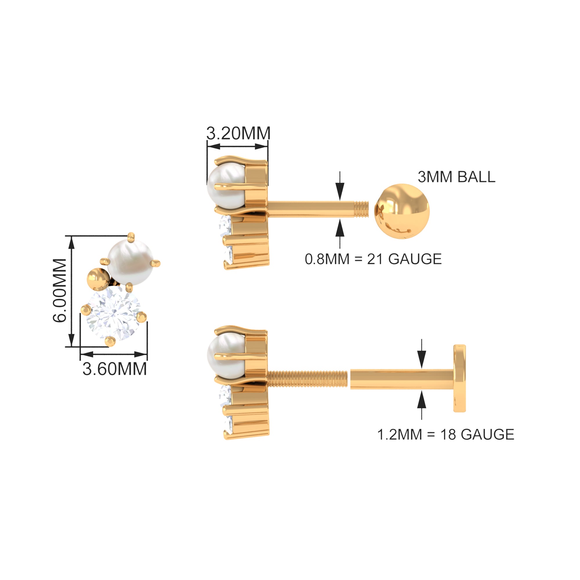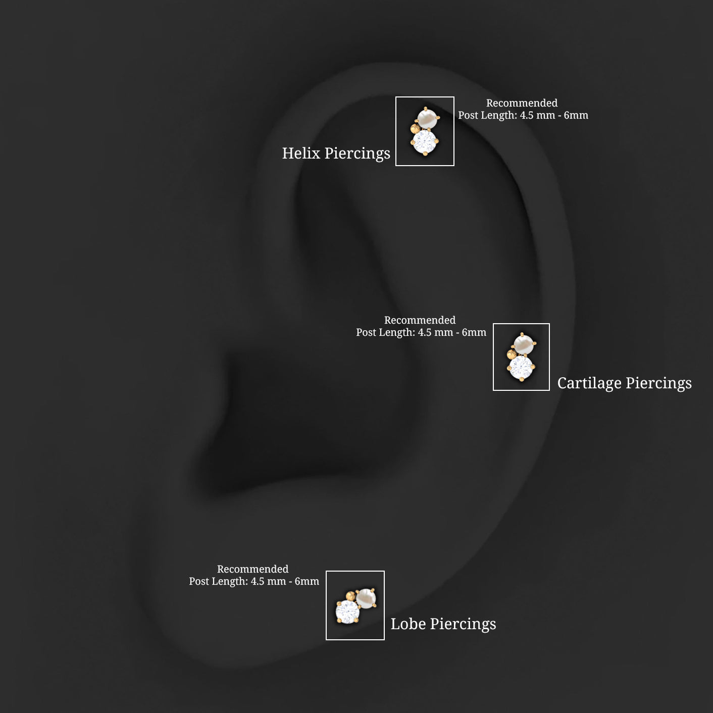 Make your heart smile with our cute and dainty Two Stone Earring. Featuring a Round Shape Freshwater Pearl and a Round Cut Moissanite in a Prong Setting, along with a small Gold bead, crafted in stunning Gold for a shiny appearance. This Two Stone Earring is perfect for multiple piercings, including Helix, Cartilage, Conch, Tragus, or Upper Lobe Piercings.