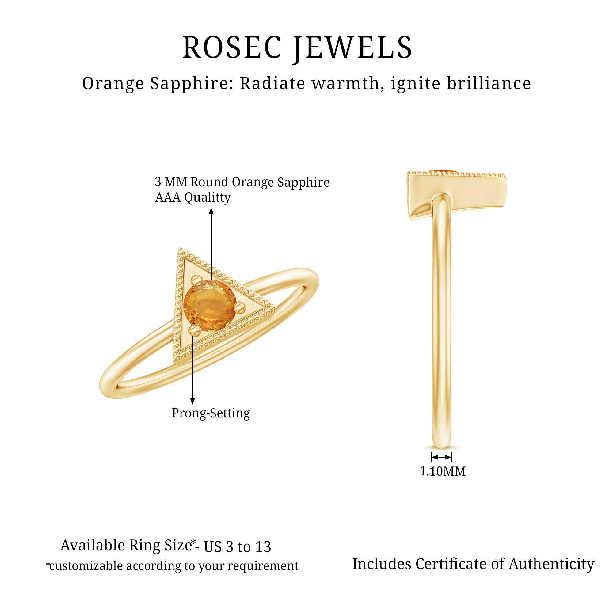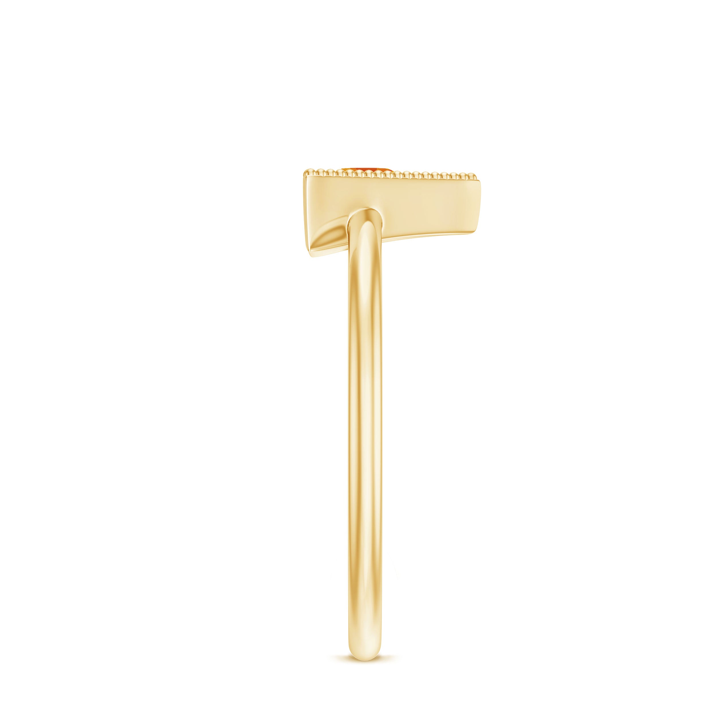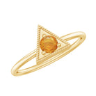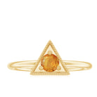 This Valentines day make surprise your beloved by gifting this Gold Triangle Shape Ring embellished with Round Shape Orange Sapphire Gemstone is set at the center in Triangle Frame in a Prong Setting with Milgrain Detailing, crafted in a Solid Gold Metal.