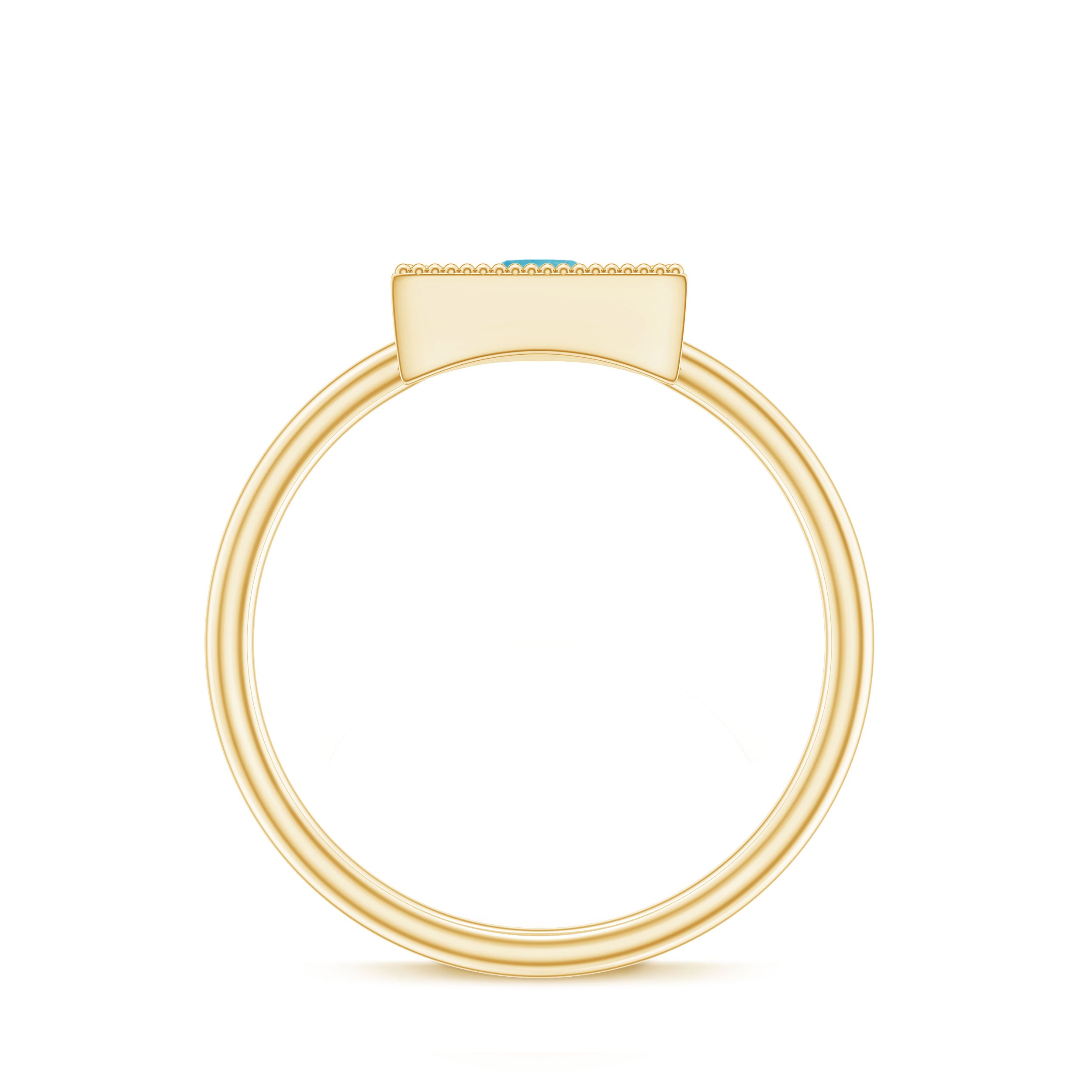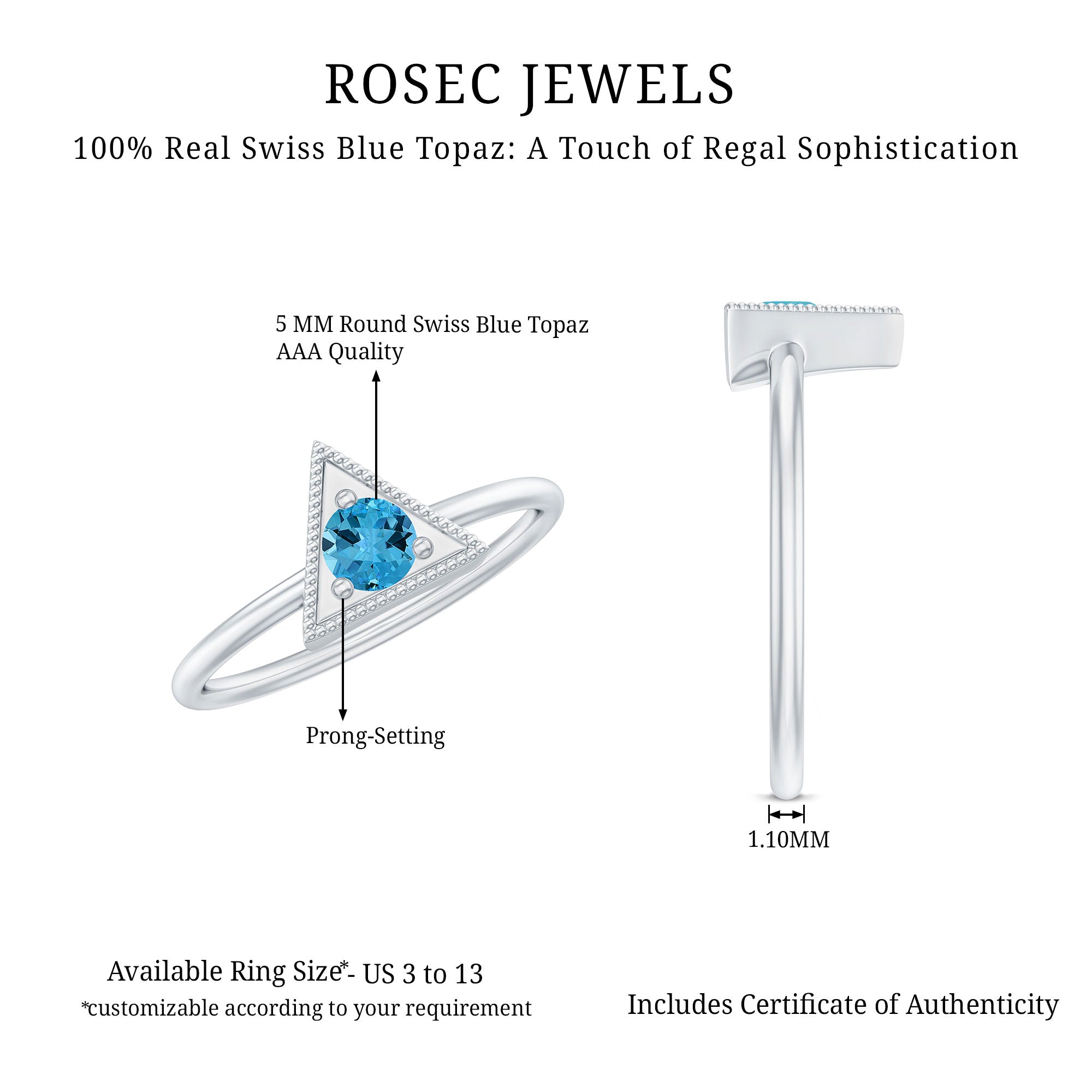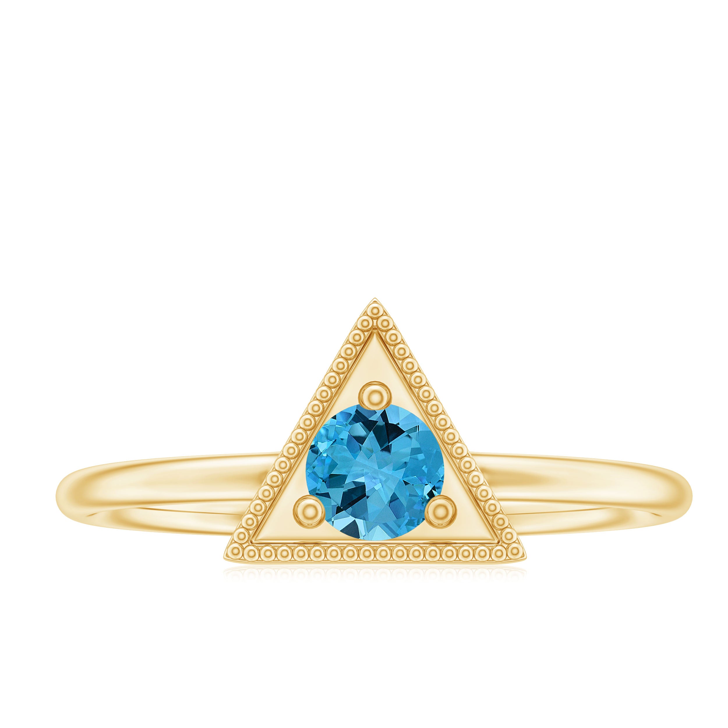 This Valentines day make surprise your beloved by gifting this Gold Triangle Shape Ring embellished with Round Shape Swiss Blue Topaz Gemstone is set at the center in Triangle Frame in a Prong Setting with Milgrain Detailing, crafted in a Solid Gold Metal.