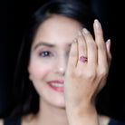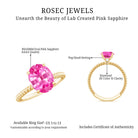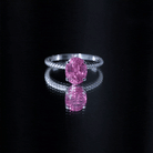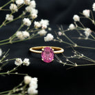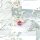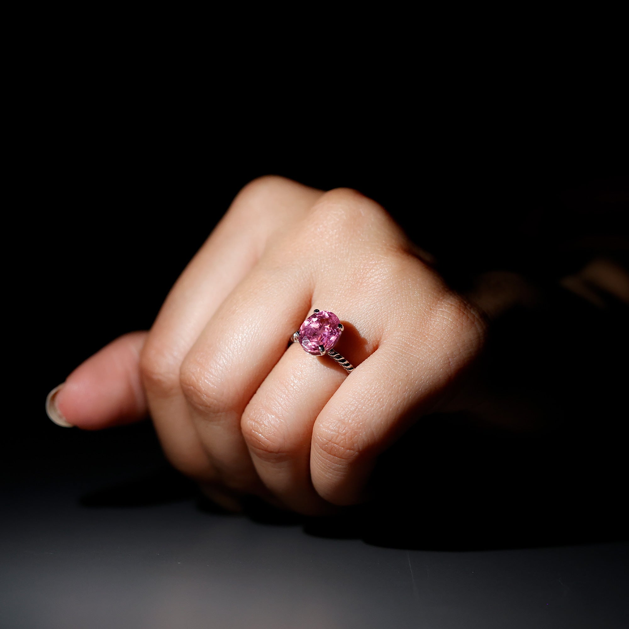 Embrace the allure of this Oval Created Pink Sapphire Solitaire Ring, featuring a hidden surprise-brilliant round Diamond nestled discreetly within the design. The twisted rope shank adds a touch of elegance to this captivating piece, making it a perfect choice for those seeking understated sophistication.