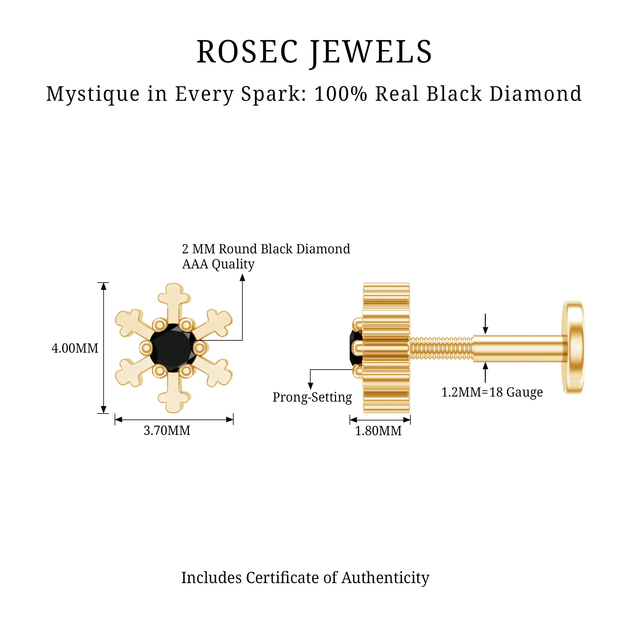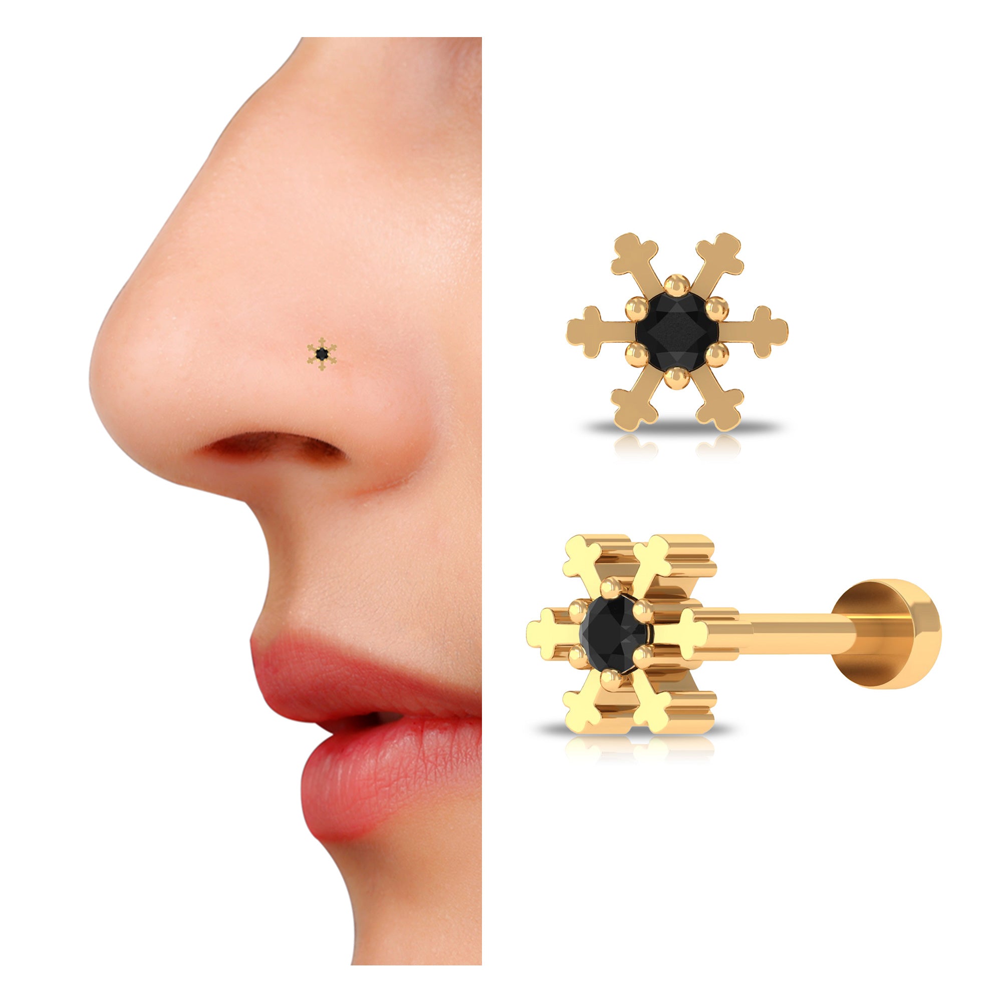 Elevate your fashion game with the addition of this Nose Ring Stud, which is designed to instantly add style to any outfit. The snowflake design features a dainty yet dazzling Round Cut Black Diamond at its center, and is meticulously crafted with Gold Metal.