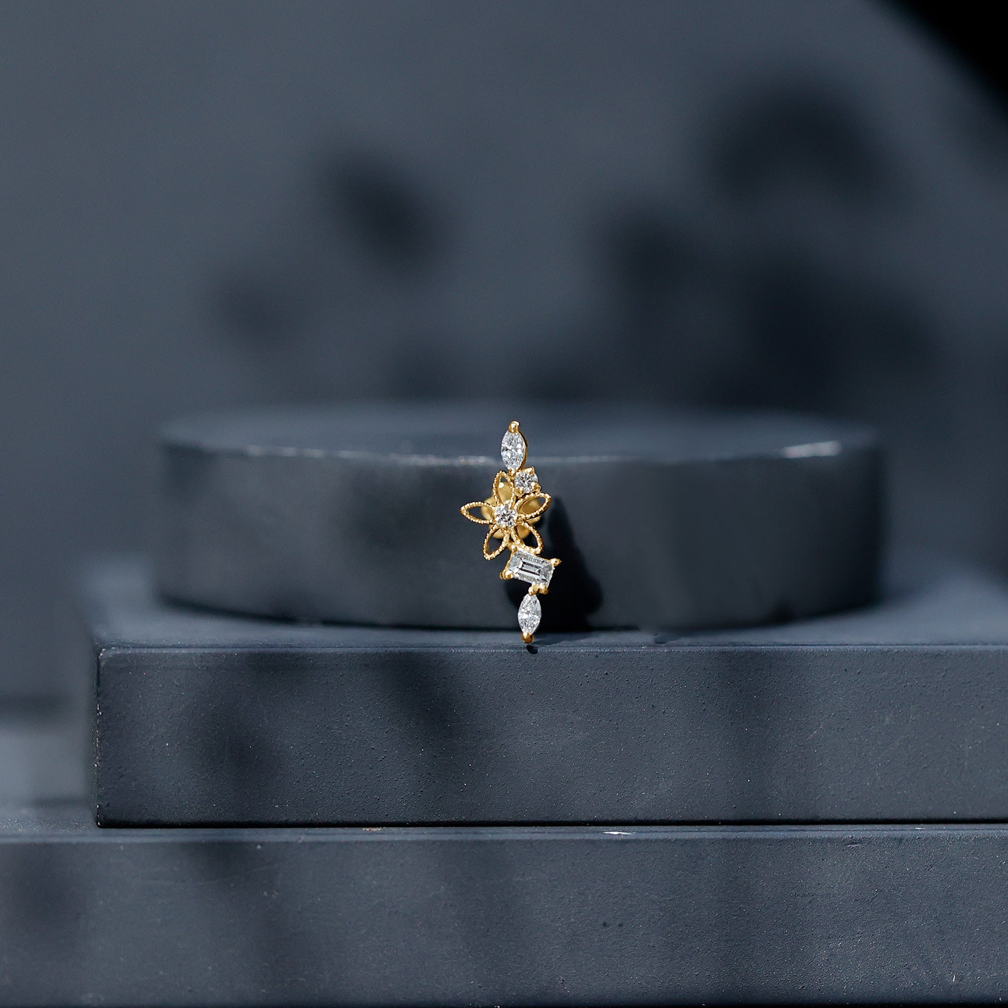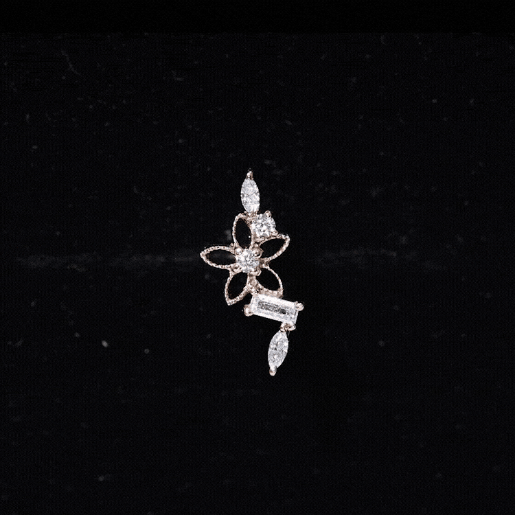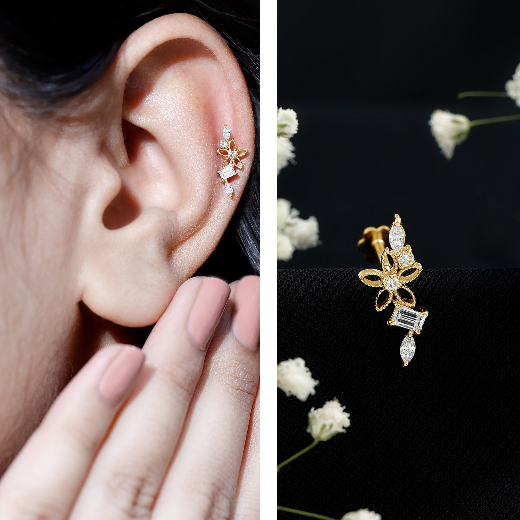 Artful design and graceful sparkle come together in a Moissanite Crawler Earring that transforms ear styling into a statement of elegance. Featuring a delicate beaded flower motif at its center, this Cartilage Earring is thoughtfully accented with a mix of baguette, marquise, and round cut moissanites. Each stone is secured in prong setting, allowing exceptional brilliance. Designed for versatility, this piece is ideal for helix, upper lobe, or cartilage piercings, adding movement without overwhelming your look. The floral detailing introduces a romantic touch, while the varied stone shapes lend modern sophistication and visual interest. Finished with a flat back closure, the Flower Helix Earring offers a secure and comfortable fit, making it suitable for extended wear during special occasions or stylish everyday moments. Perfect for those who appreciate distinctive body jewelry, this Moissanite Flower Earring pairs beautifully with minimalist studs or layered ear stacks for a fashion-forward aesthetic.
