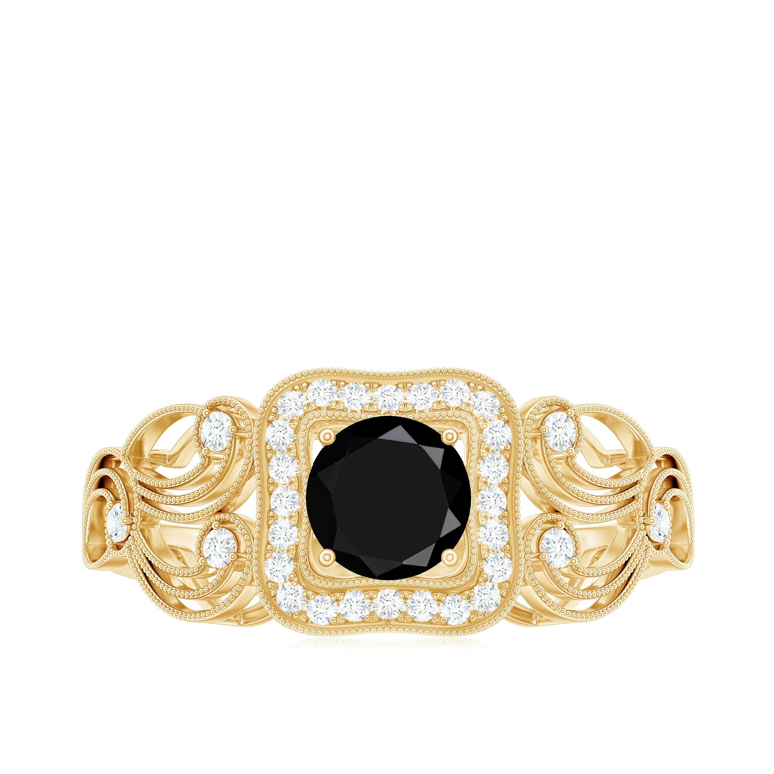 An Amazing and Fabulous Vintage Engagement Ring is a perfect gift for your lady. This Engagement Ring is decorated with Round Shape Created Black Diamond in the center and a Round Diamond in a halo and side stone style. The milgrain floral design set with Diamond stones magnifies the piece. This Created Black Diamond Engagement Ring is mounted in Gold Metal.