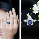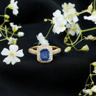 The Vintage Engagement Ring feels like a dream featuring an Octagon Cut Created Blue Sapphire Solitaire beautifully accompanied by a Halo of Diamond. Its gorgeous band is delicately adorned with Diamond and Gold Migraines which enhances will shine of the solitaire making it an excellent choice of fine jewelry for your better half.