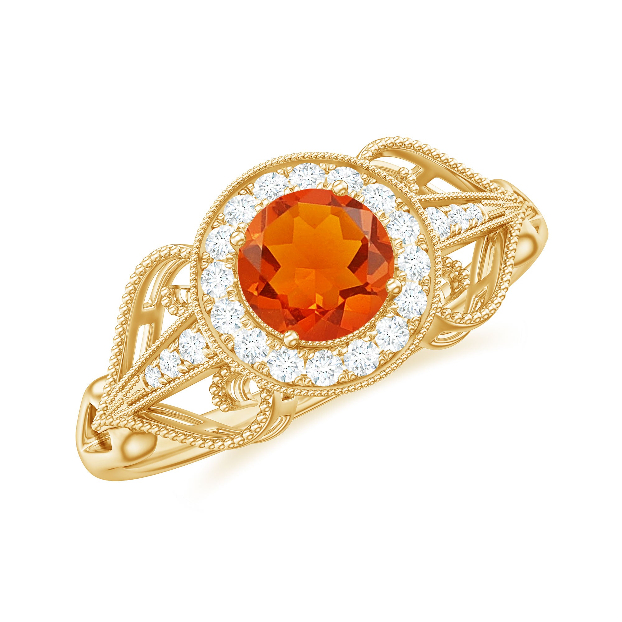 The brightness of Fire Opal makes this vintage ring more appealing. The Fire Opal Engagement Ring is embellished with Round Diamond Accent, glistening on the shank beautifully. The Fire Opal Diamond Engagement Ring is accentuated with Beaded Gold, make your significant feel more precious with this Fire Opal Gold Ring.