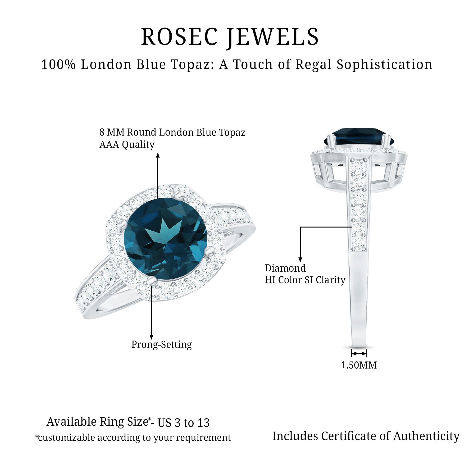 She is going to fall in love the moment she sees this vintage inspired London Blue Topaz Engagement Ring. It is embellished with a bold 8 MM round cut London Blue Topaz, held securely in strong prong setting that lets the gem shine bright and catch the light from every angle. Surrounding it is a sparkling halo of tiny diamonds. The sparkle does not stop there, the band is also lined with more round diamonds on each side, giving the Vintage Blue Topaz Ring a lovely and elegant shine. This piece is made for someone who loves a mix of old-school charm and everyday elegance. It is not just beautiful, it is made to be comfortable, so this Blue Topaz and Diamond Engagement Ring can be worn every day with ease. If you are looking for a ring that is eye-catching, meaningful, and full of character, this is a perfect pick. It is available in a range of sizes to get the perfect fit, and it also comes with a certificate of authenticity for the gemstone, so you can feel confident knowing it is the real deal. This Halo Engagement Ring is a timeless piece, ready to be part of your forever story.