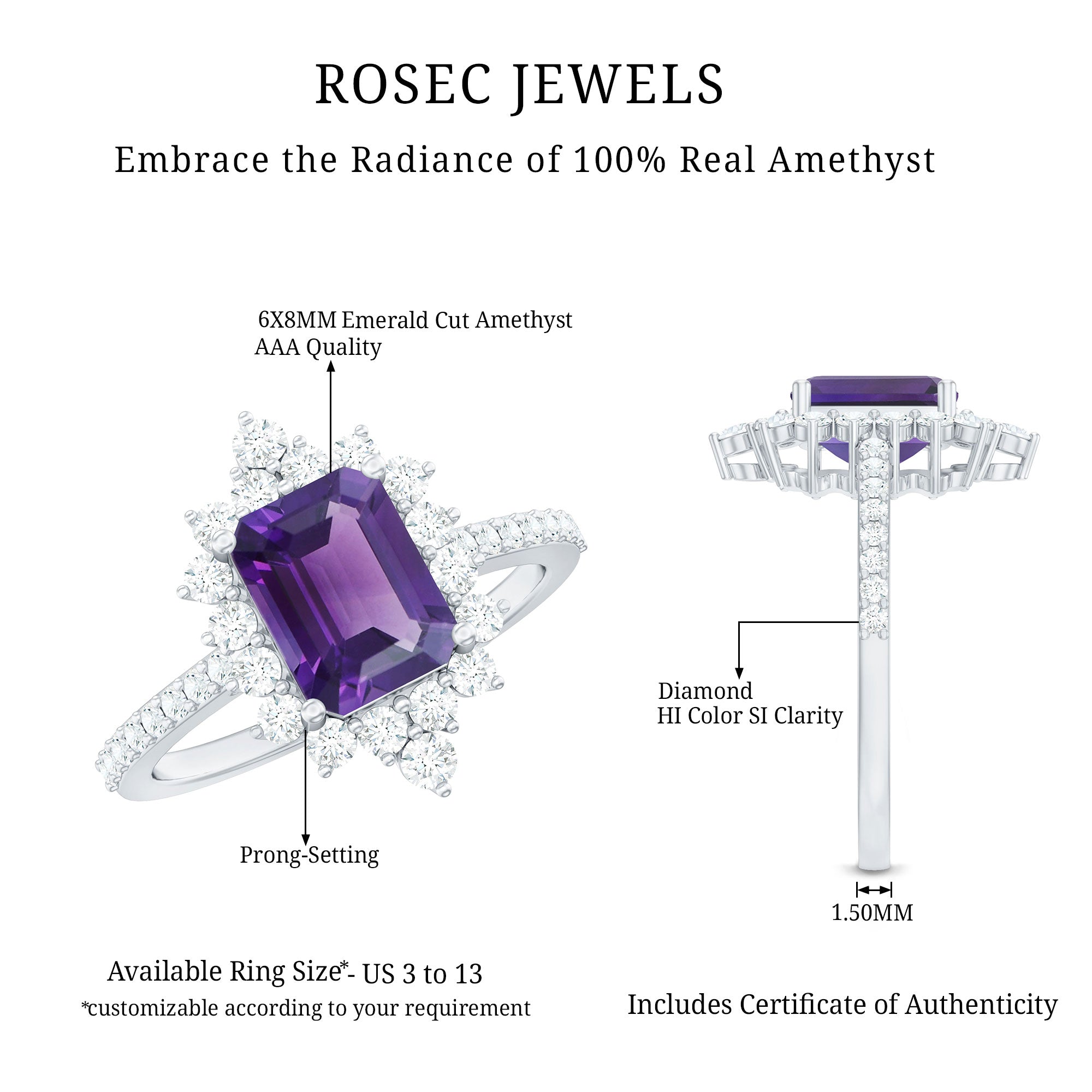 Get ready for the party look with this beautiful Vintage Inspired Engagement Ring. This Halo Engagement Ring is embellished with 4X6 MM Octagon Cut Amethyst in the center with Round Diamond set in a halo and Side Stones. This Amethyst Engagement Ring is crafted in Gold Metal.