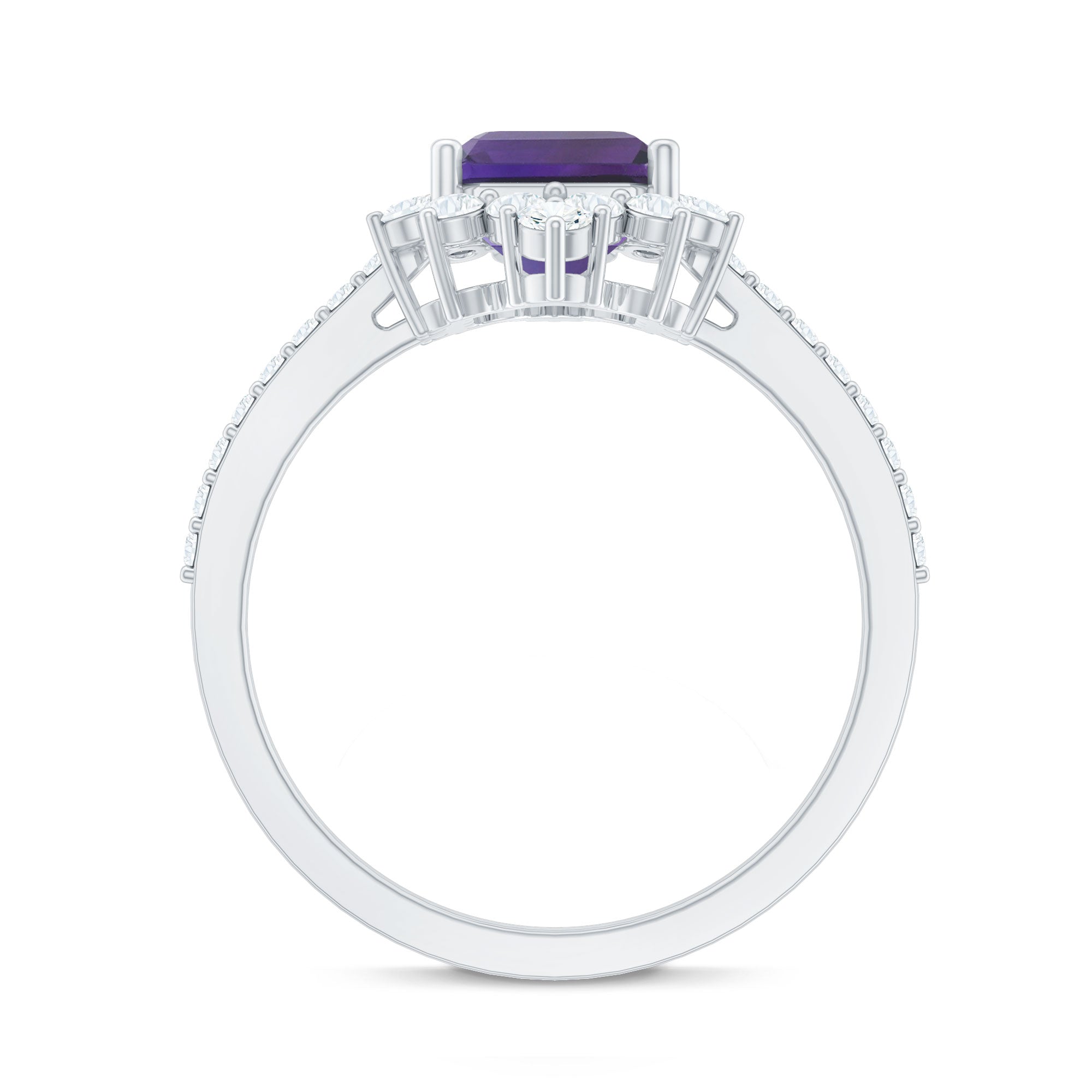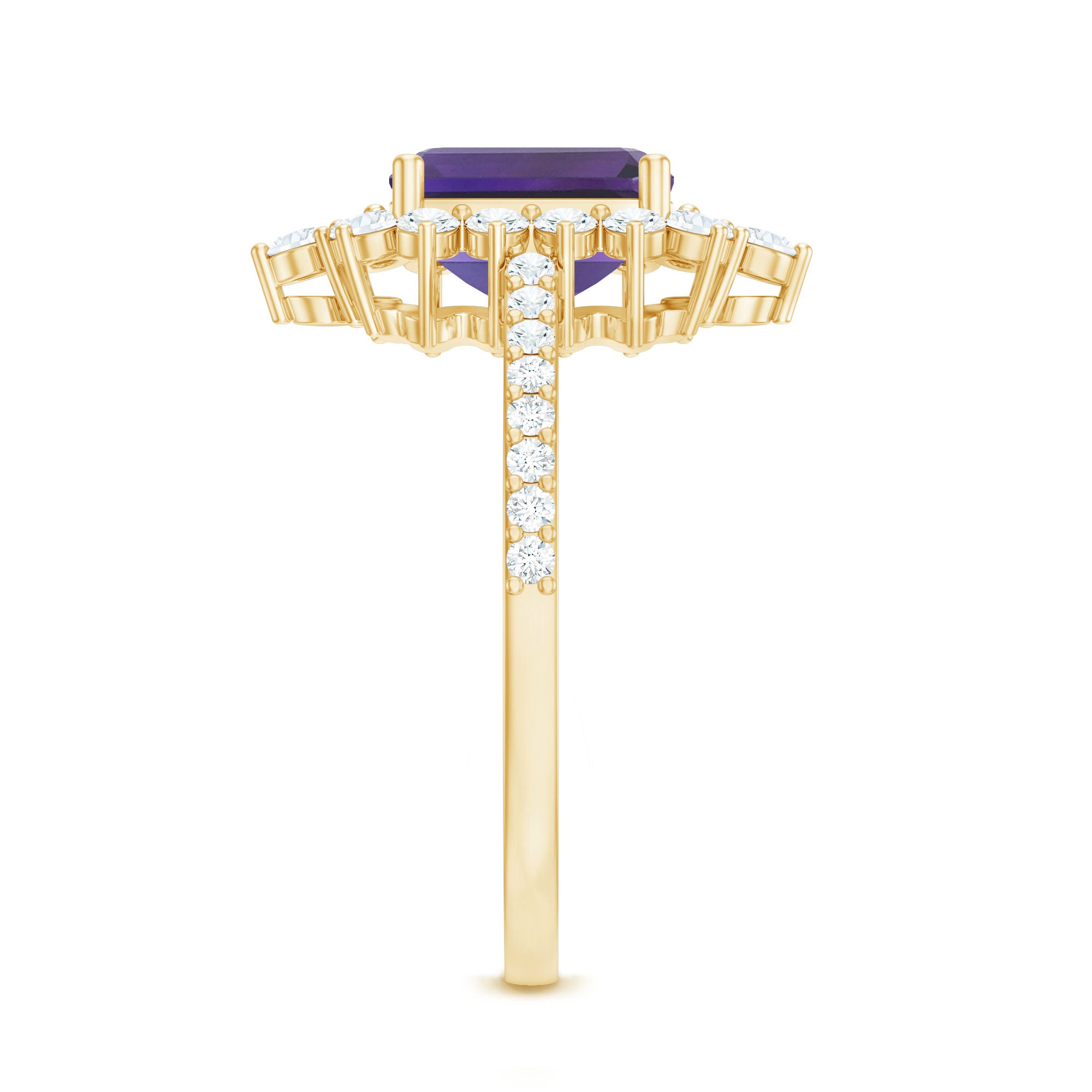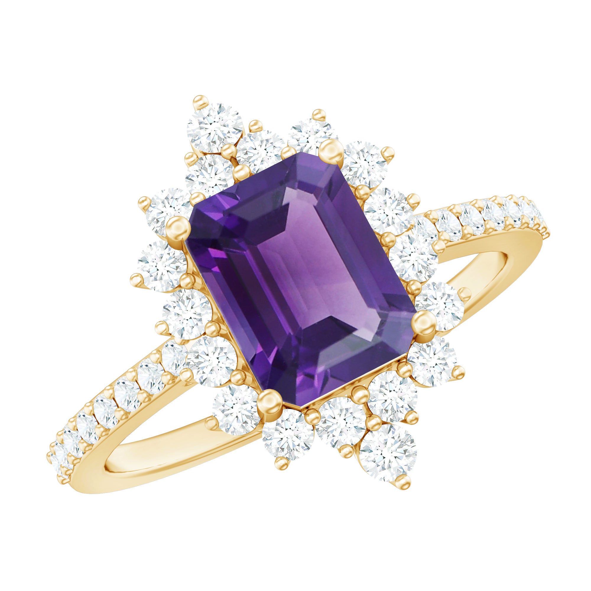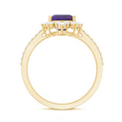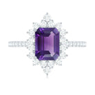 Get ready for the party look with this beautiful Vintage Inspired Engagement Ring. This Halo Engagement Ring is embellished with 4X6 MM Octagon Cut Amethyst in the center with Round Diamond set in a halo and Side Stones. This Amethyst Engagement Ring is crafted in Gold Metal.