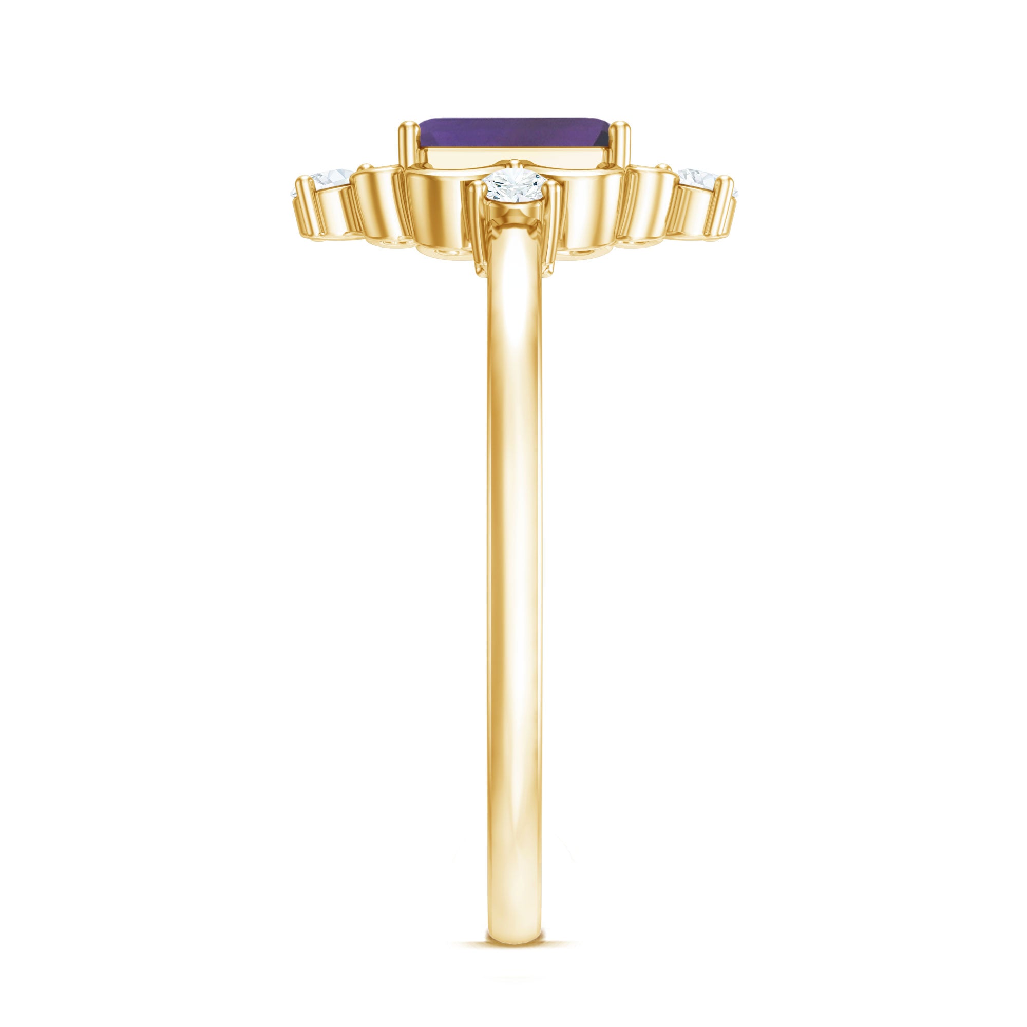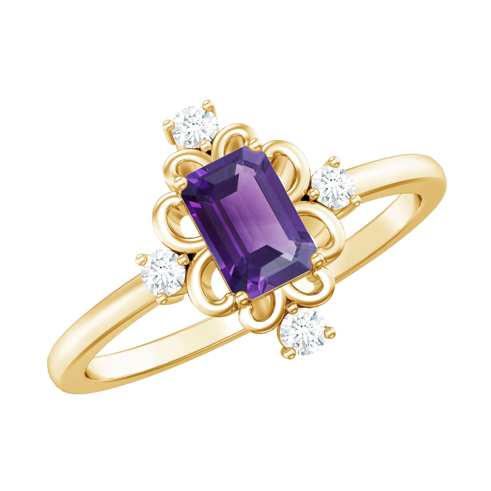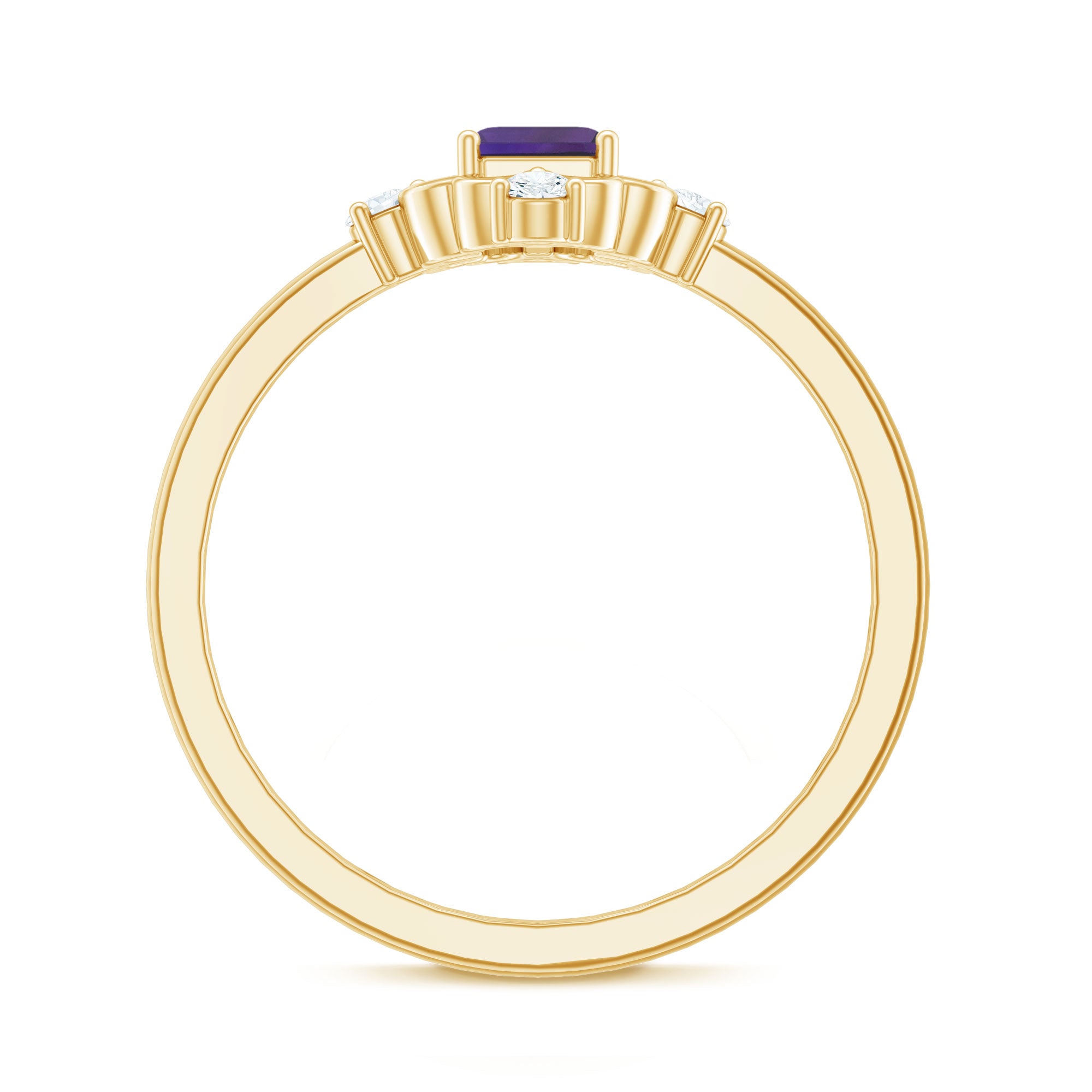 This Solitaire Engagement Ring will captivate everyones attention as it is embellished with stunning Emerald Cut Amethyst secured in 4 Prong Setting while Round Shape Diamond studded on the unique design. . The Amethyst Ring is gracefully crafted with Hallmarked Metal. This Vintage Ring will make your every moment magical and worth celebrating. She will find reasons to wear this Amethyst Ring again and again.