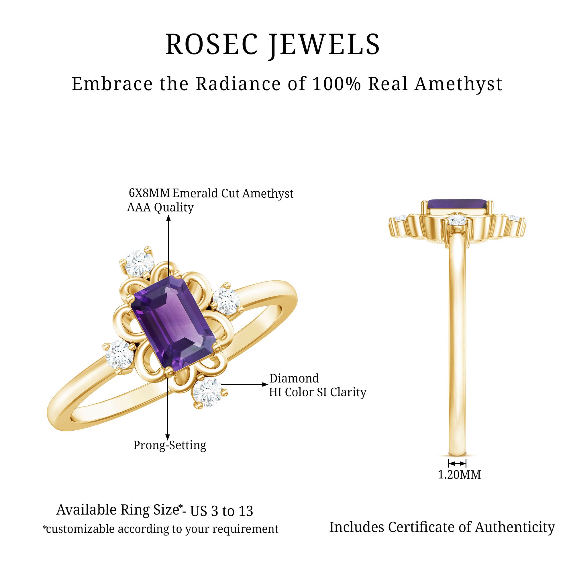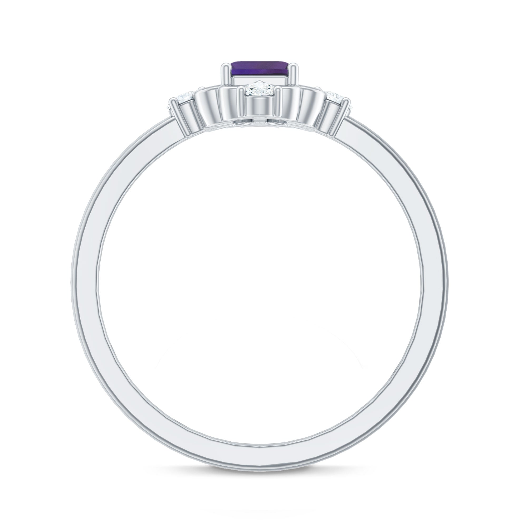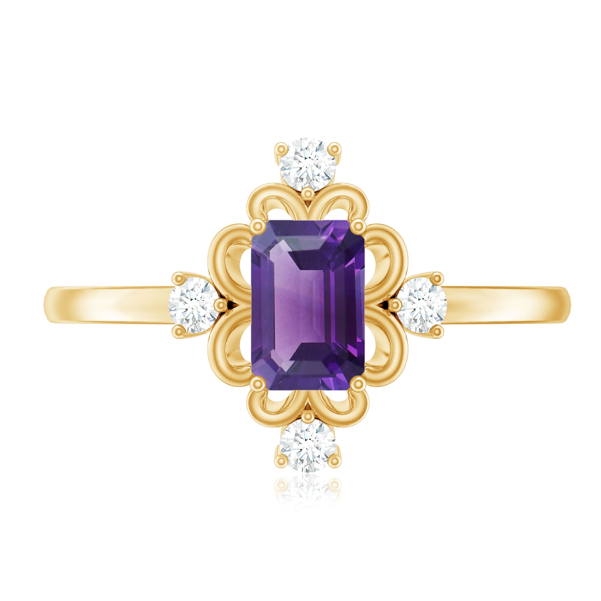 This Solitaire Engagement Ring will captivate everyones attention as it is embellished with stunning Emerald Cut Amethyst secured in 4 Prong Setting while Round Shape Diamond studded on the unique design. . The Amethyst Ring is gracefully crafted with Hallmarked Metal. This Vintage Ring will make your every moment magical and worth celebrating. She will find reasons to wear this Amethyst Ring again and again.