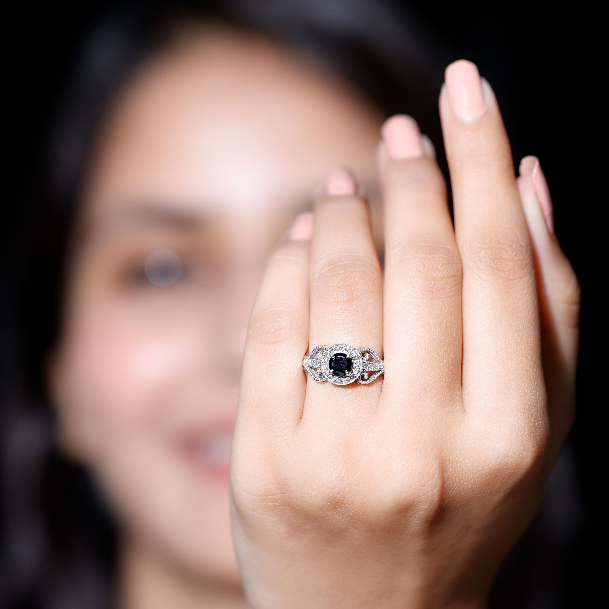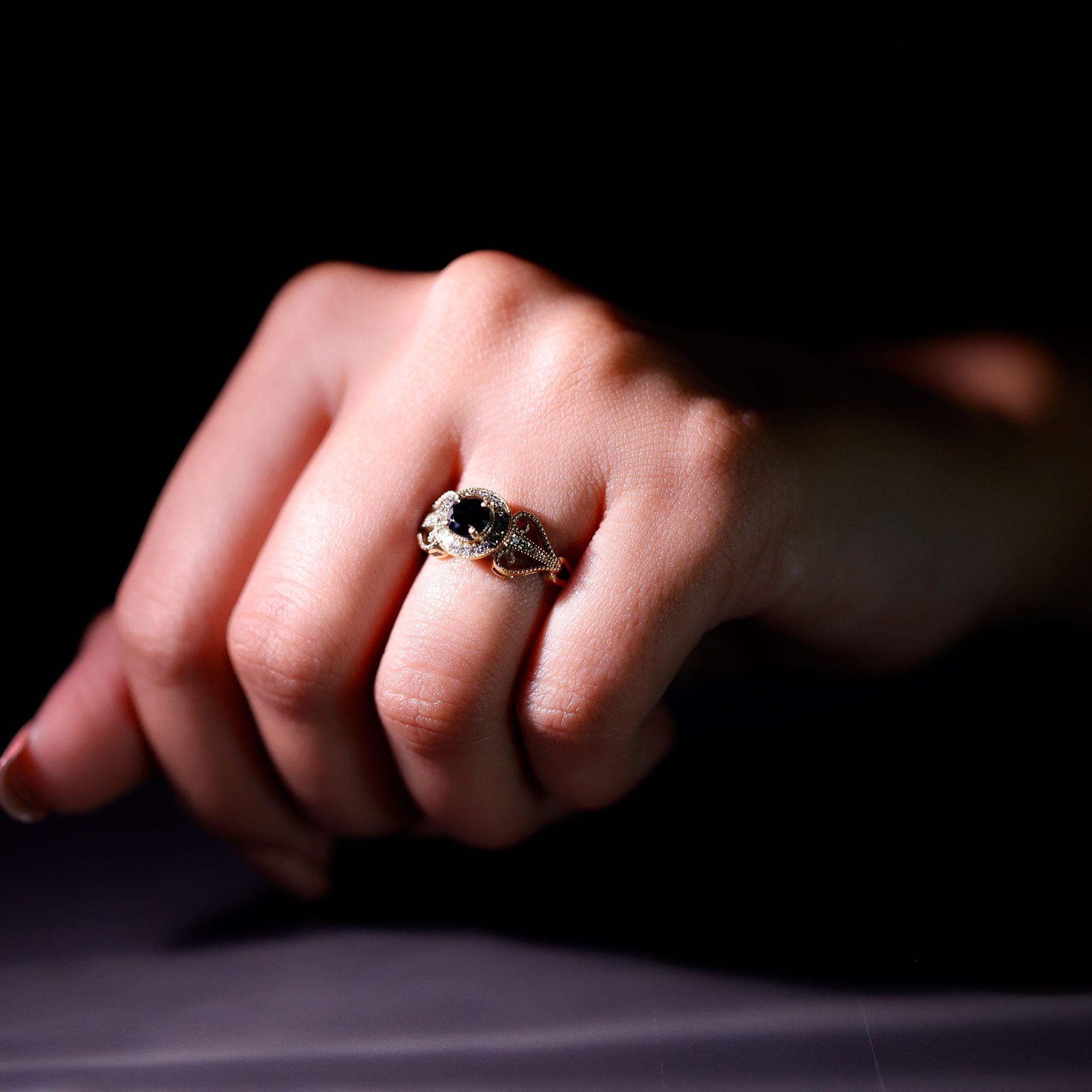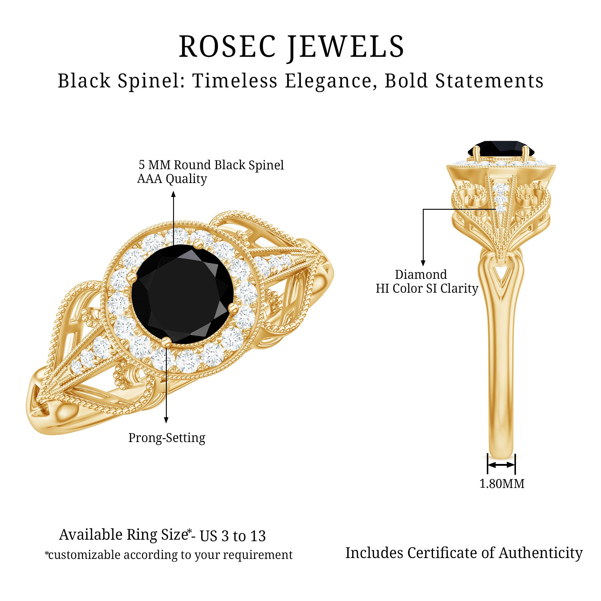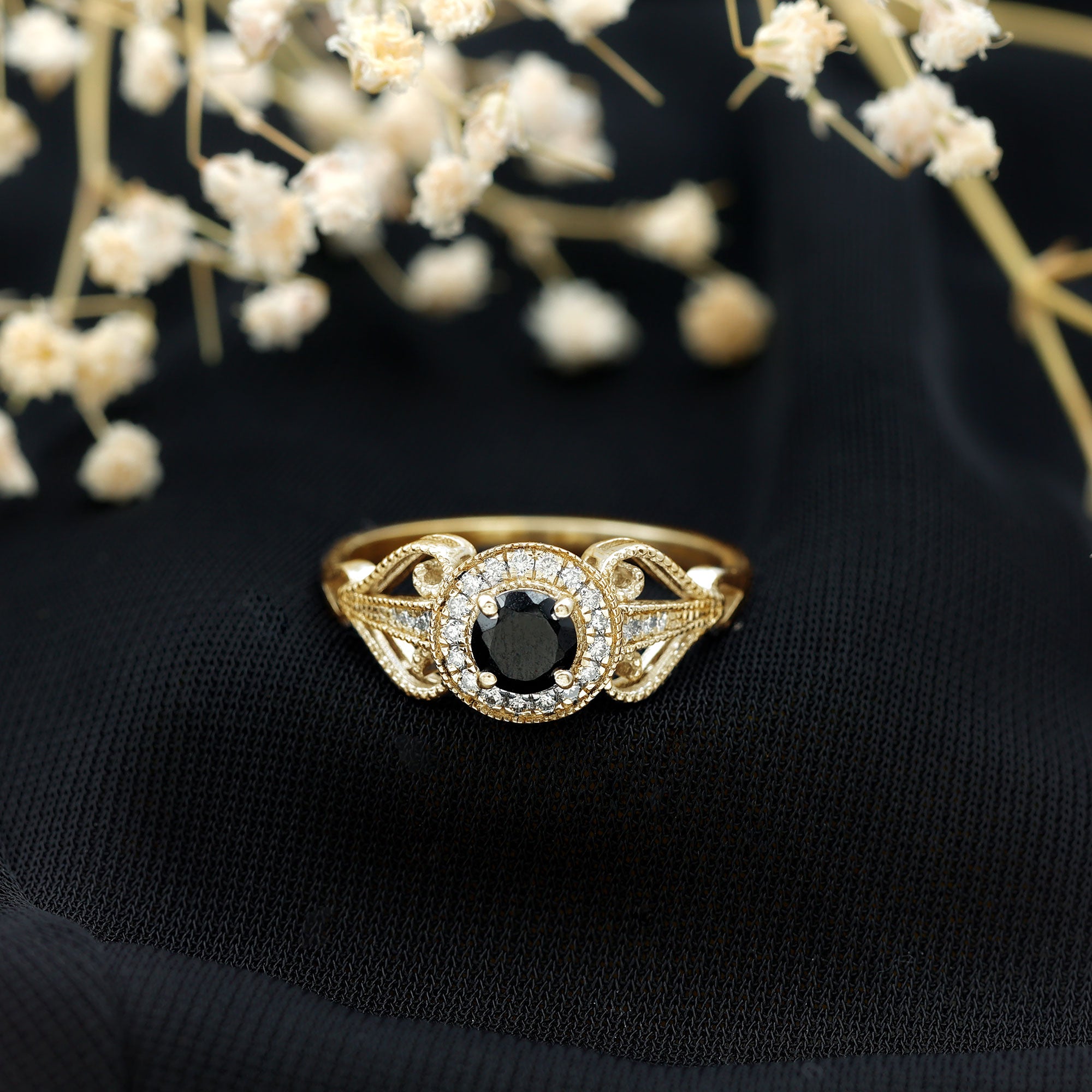 Step into royalty with this stunning Black Spinel Solitaire Engagement Ring. Adorned with Diamond stones on the beaded metal and a round-cut black spinel surrounded by additional Diamond stones, this ring is a timeless treasure. Made from solid gold, this designer piece will make you feel like a true queen every time you wear it.