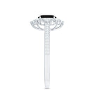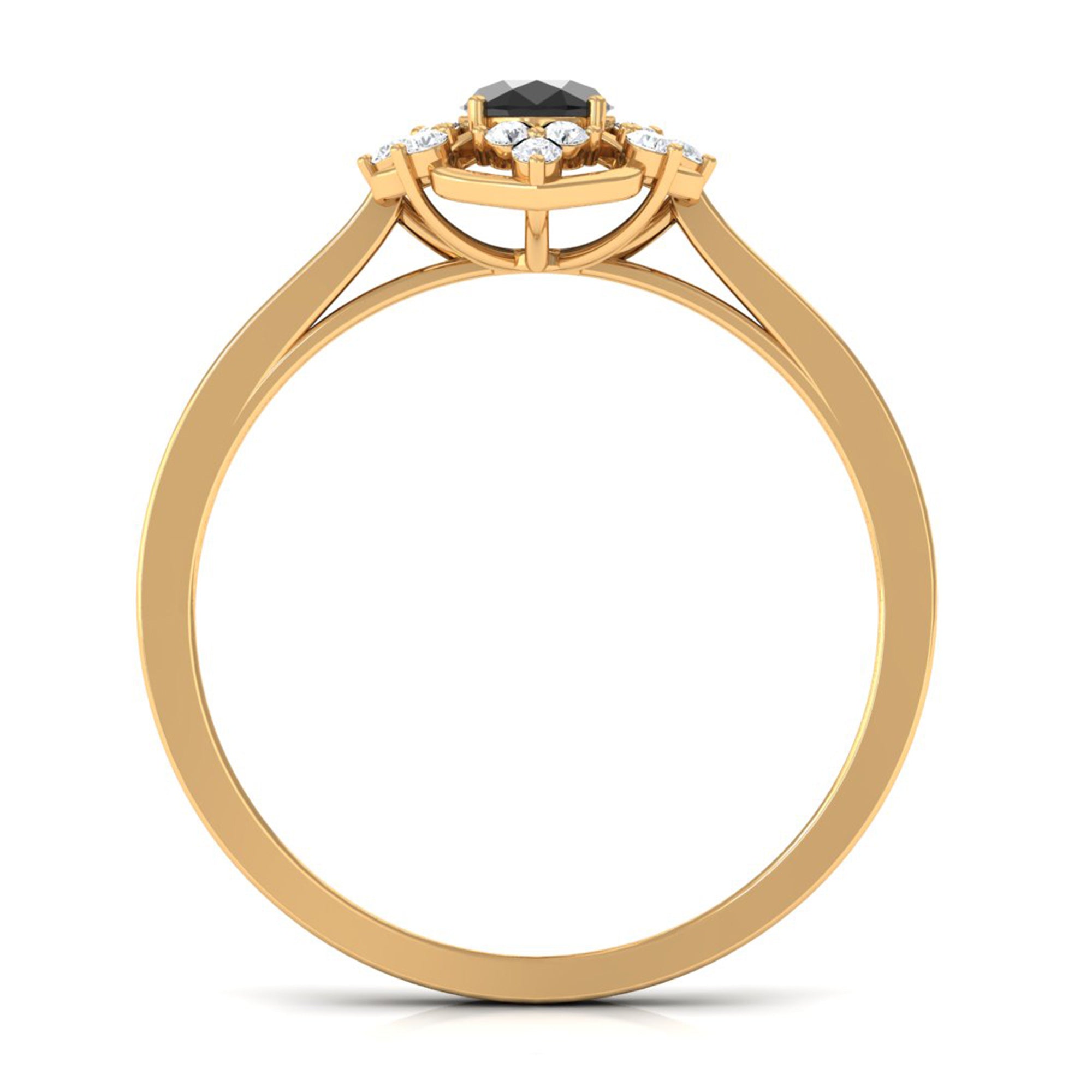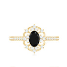Revisit the bygone eras with this stunning oval black spinel engagement ring. The ring emulates a delicate blossom that radiates its beauty to far off lands. Round Diamond surrounds the black spinel in a way that gives the illusion of a bigger ring. The shank is intricately embellished with pave set round Diamond for an extra dose of sparkle. Go down on the knee and pop the question with this impressive ring that is anything less than perfect.