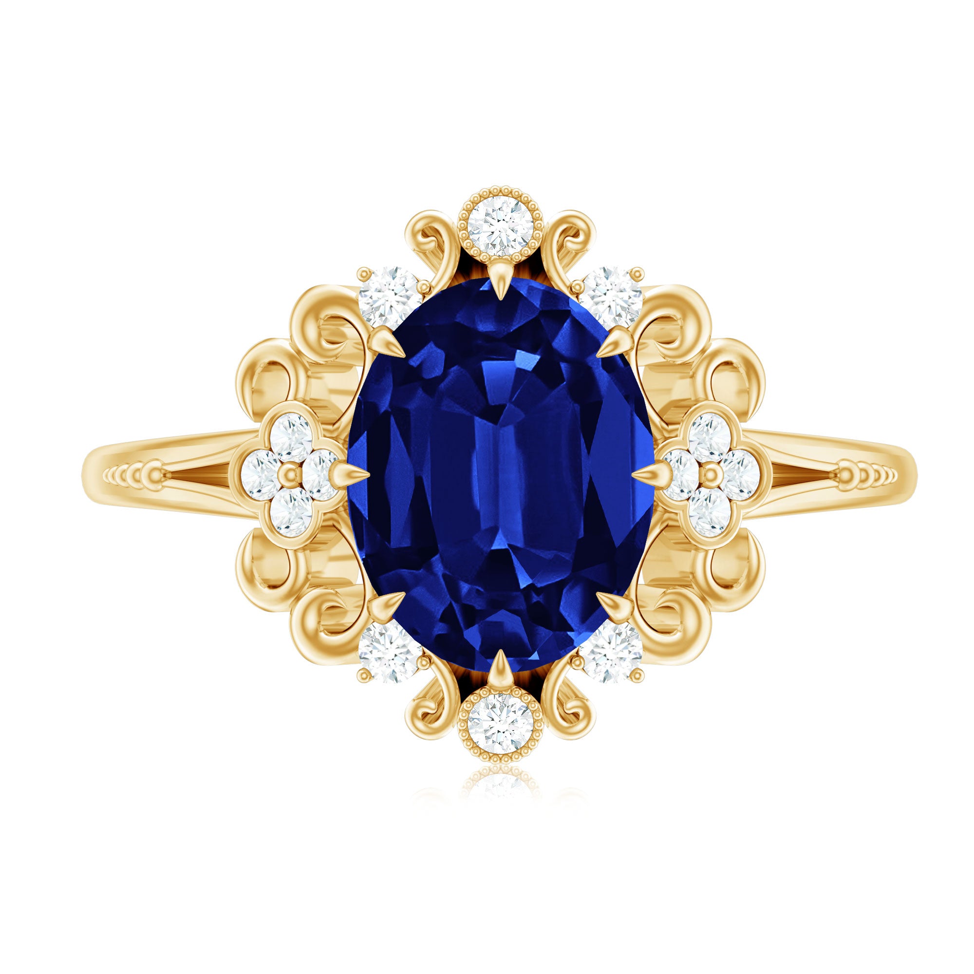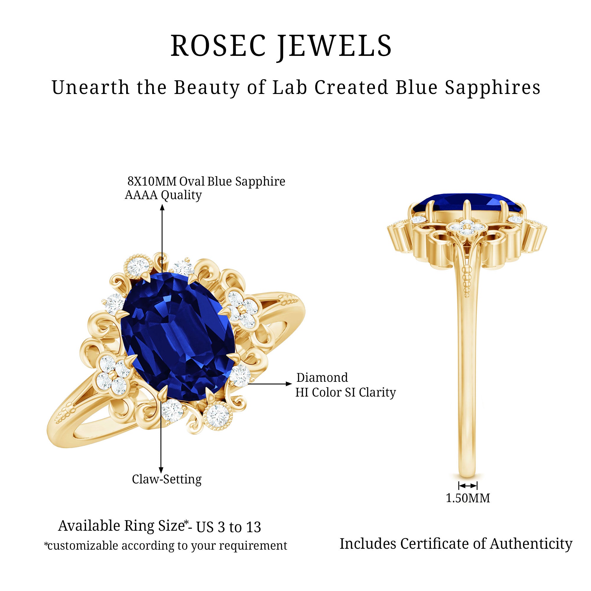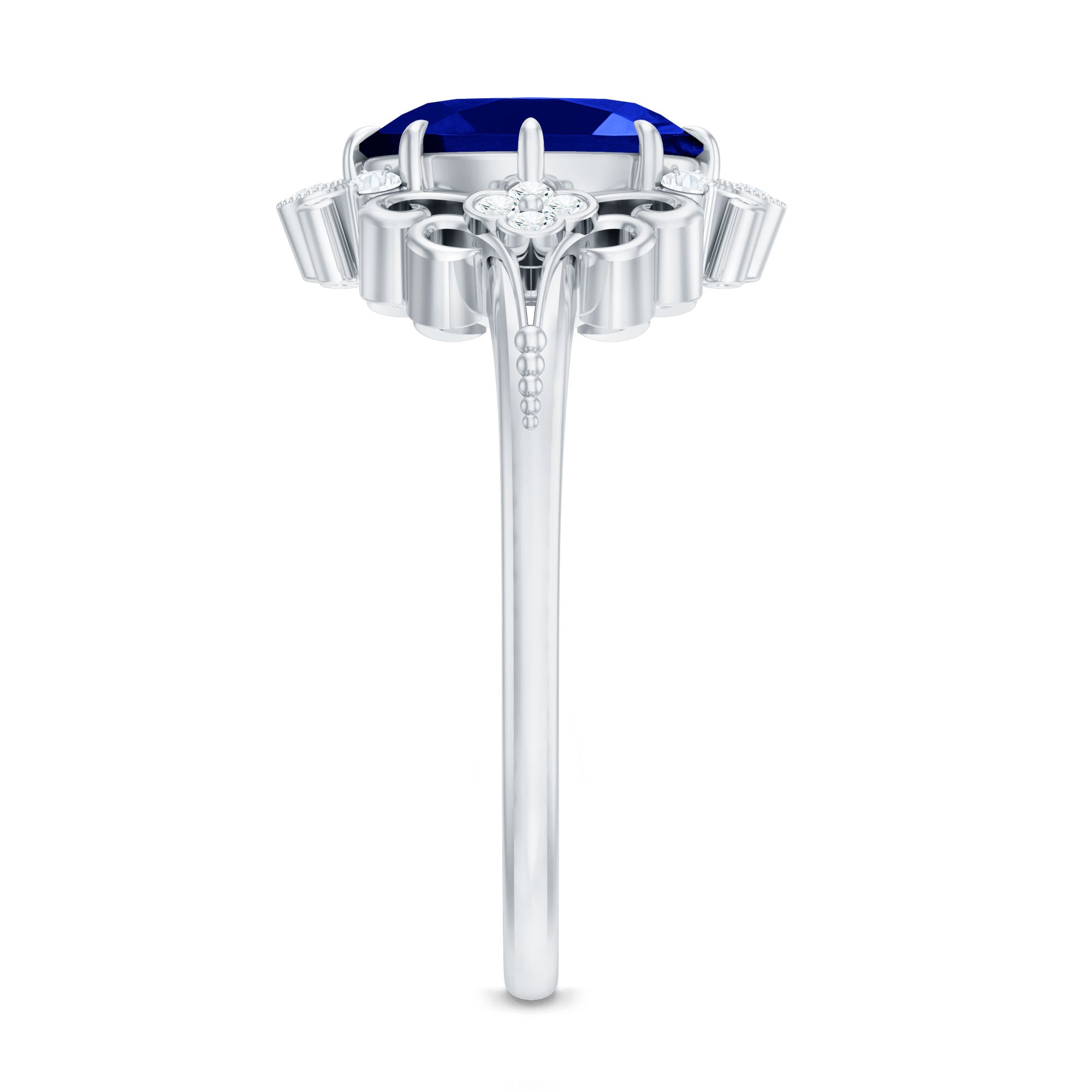 This exquisite engagement ring features a striking oval cut Created Blue Sapphire set in a claw setting, complemented by shimmering Diamond stones. Whether youre looking to make a statement at a special event or add a vintage touch to your jewelry collection, this piece is sure to impress. With a total weight of 4.25 carats and AAAA clarity, the Created Blue Sapphire gemstone is of exceptional quality, and all our gemstones undergo strict certification and quality checks. Celebrate your next chapter in style with this stunning Created Blue Sapphire engagement ring.