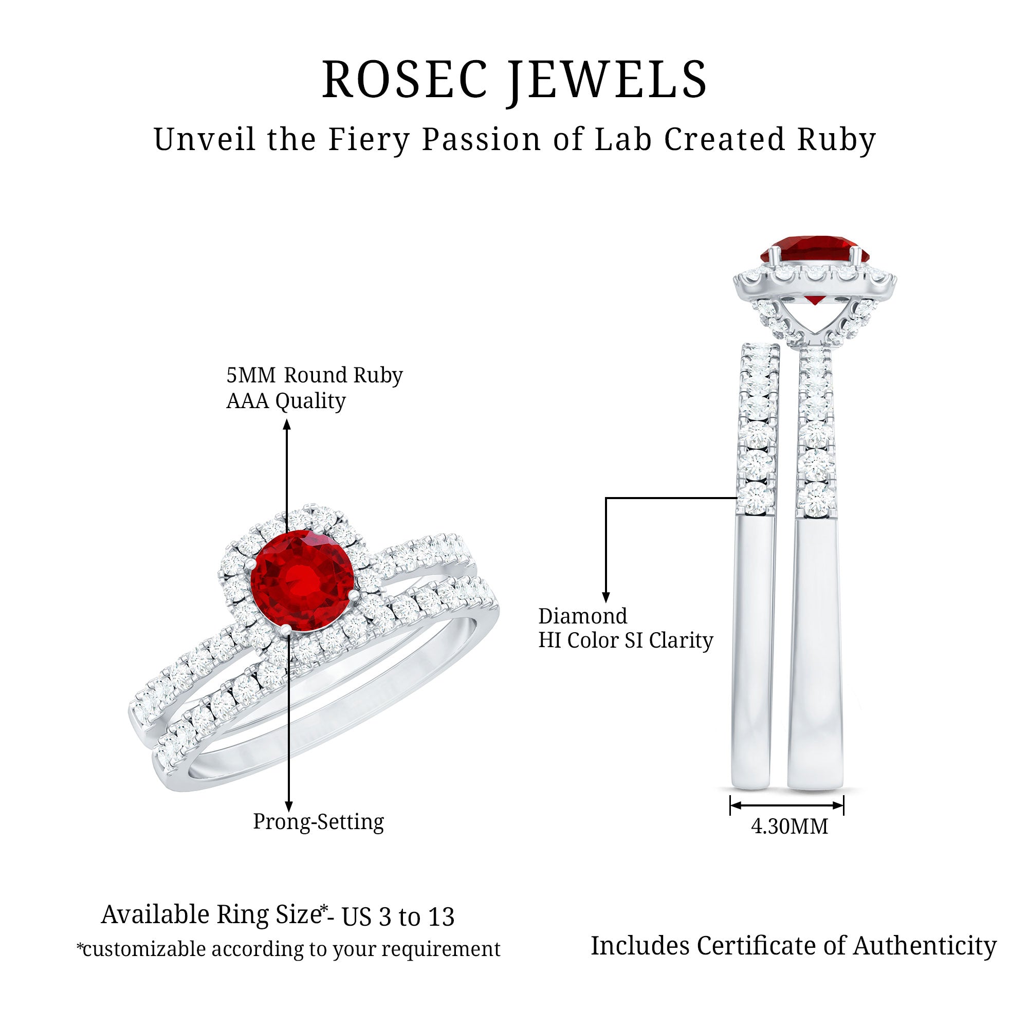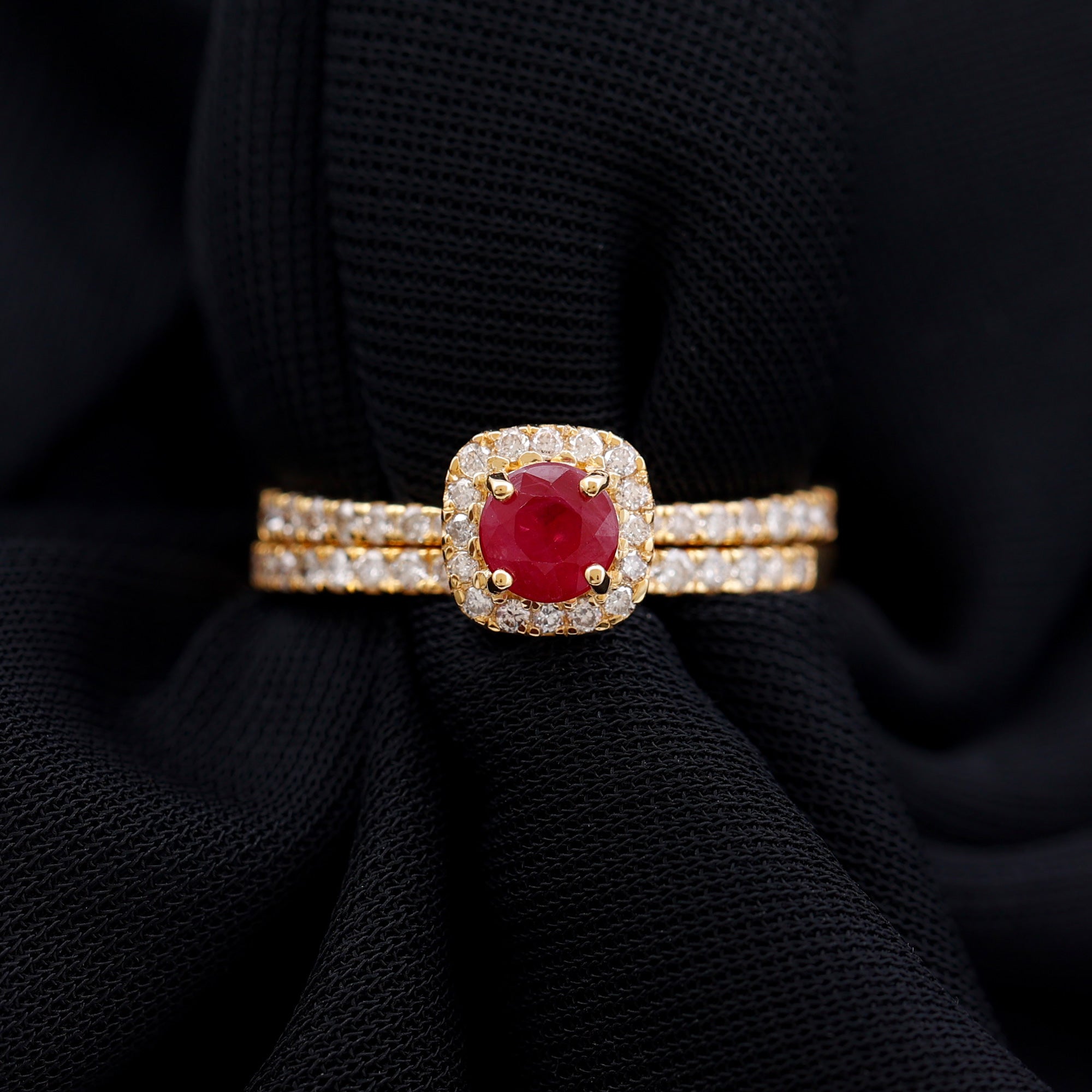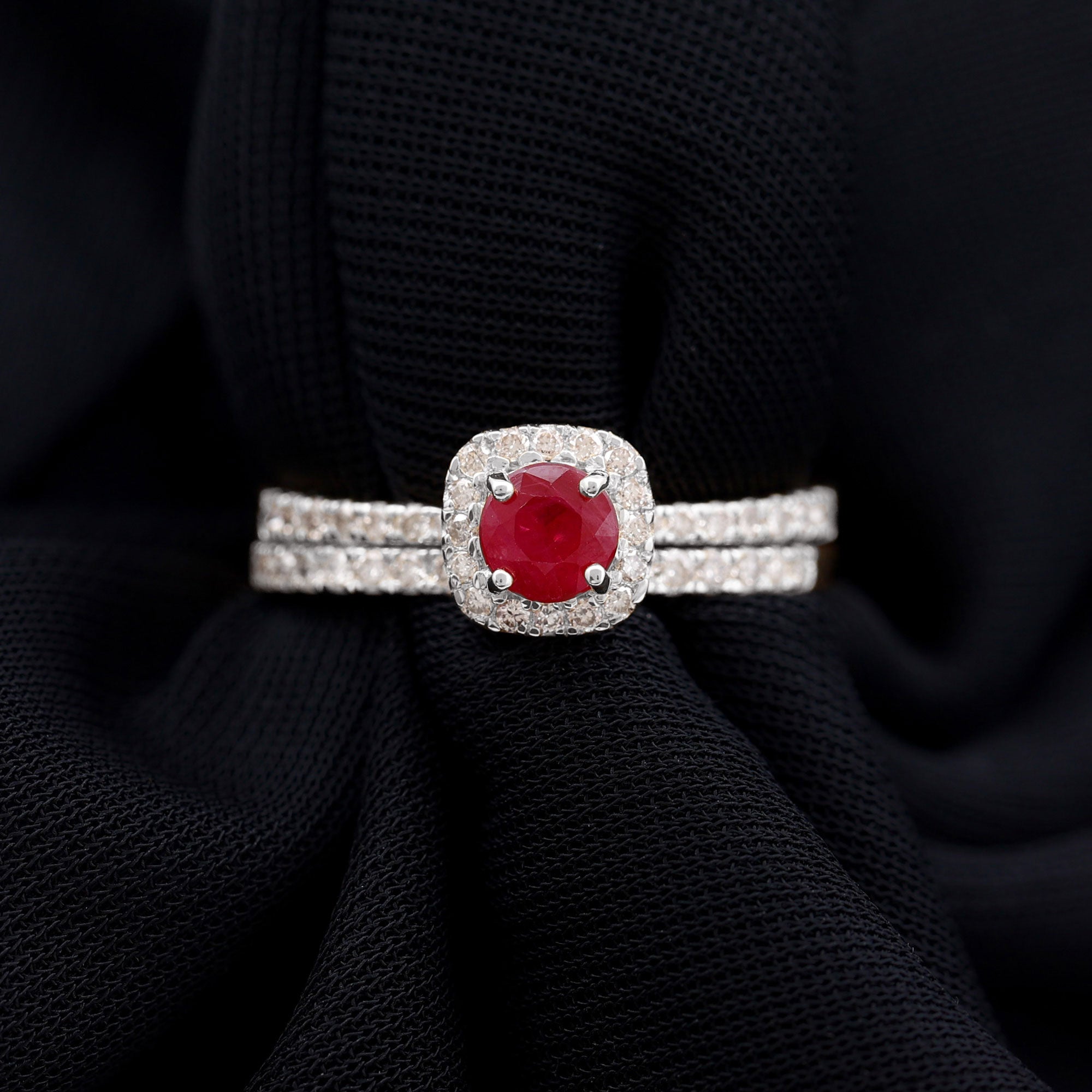 Make your special day unforgettable with this Vintage Ruby Ring Set. This Created Ruby and Diamond Wedding Ring set is the perfect way to show your love and affection to your partner. With its timeless design and exquisite craftsmanship, this ring set is sure to bring a smile to her face and make her feel truly special.