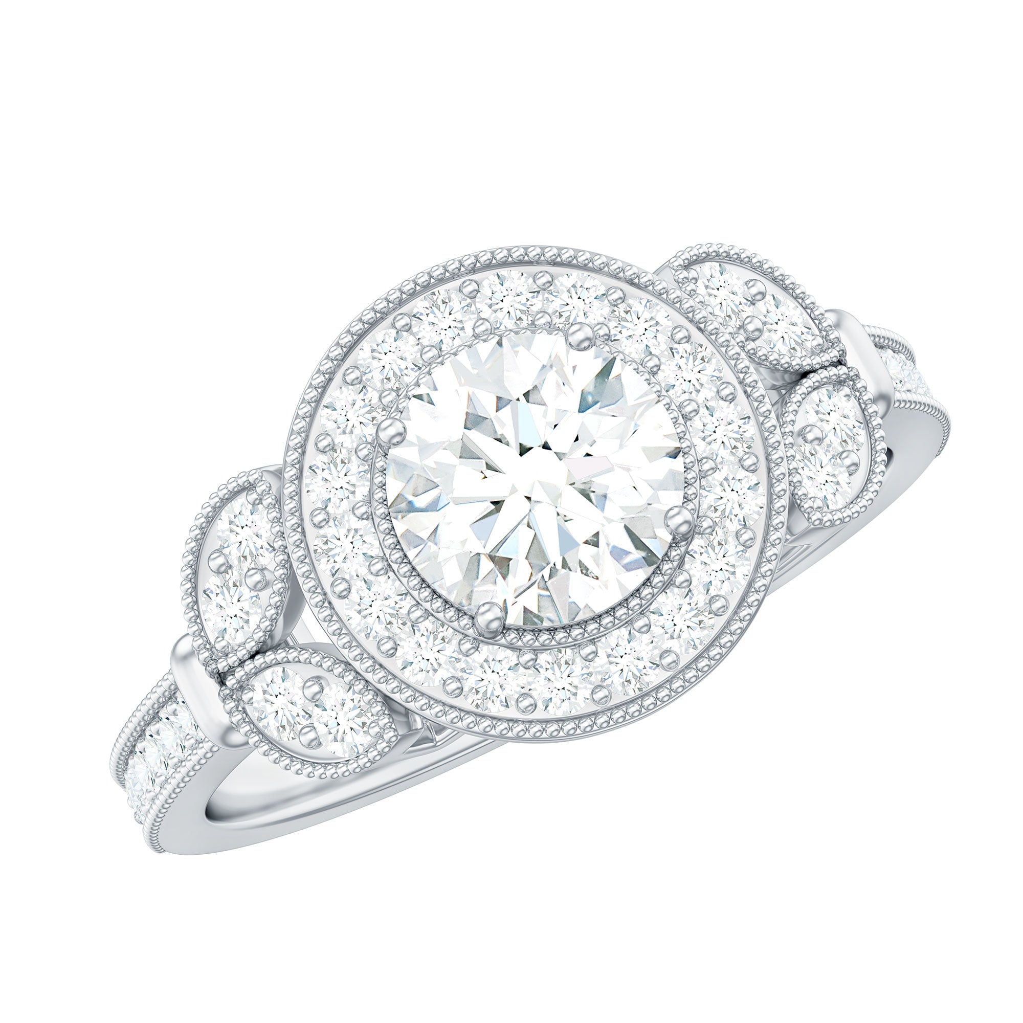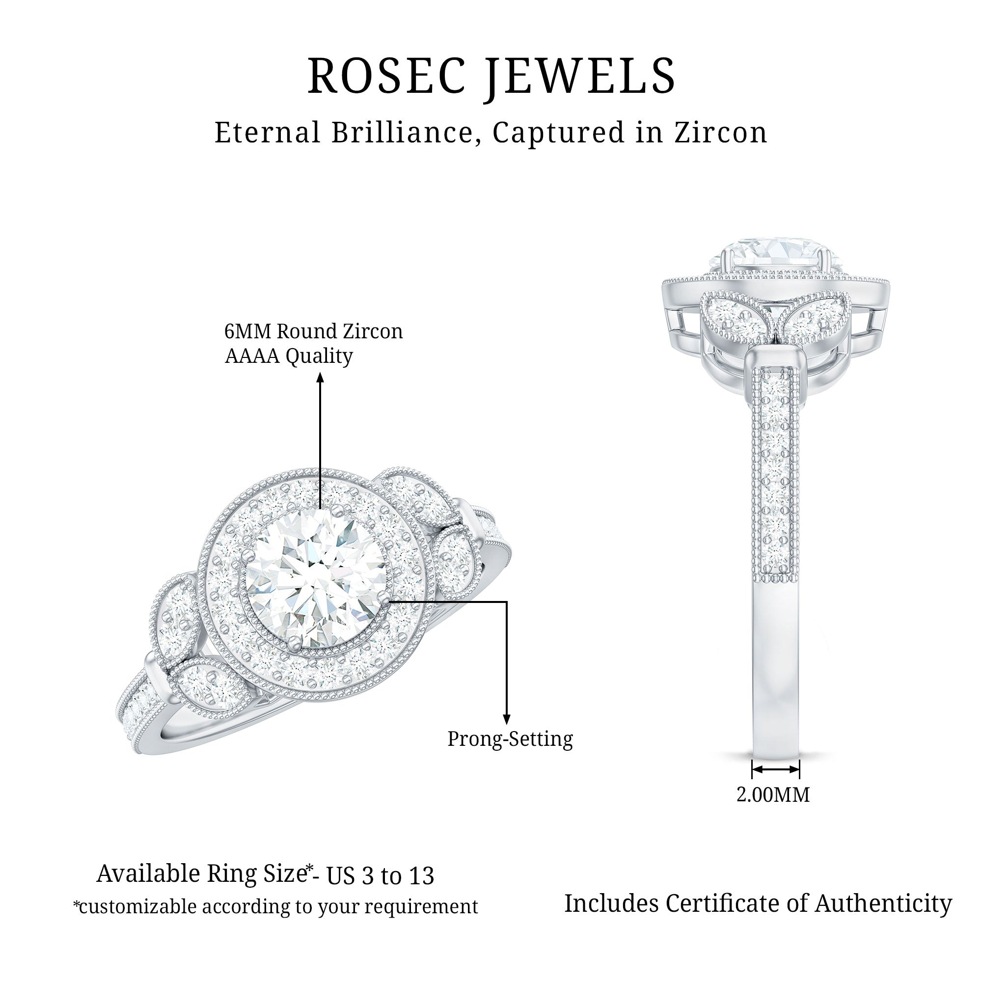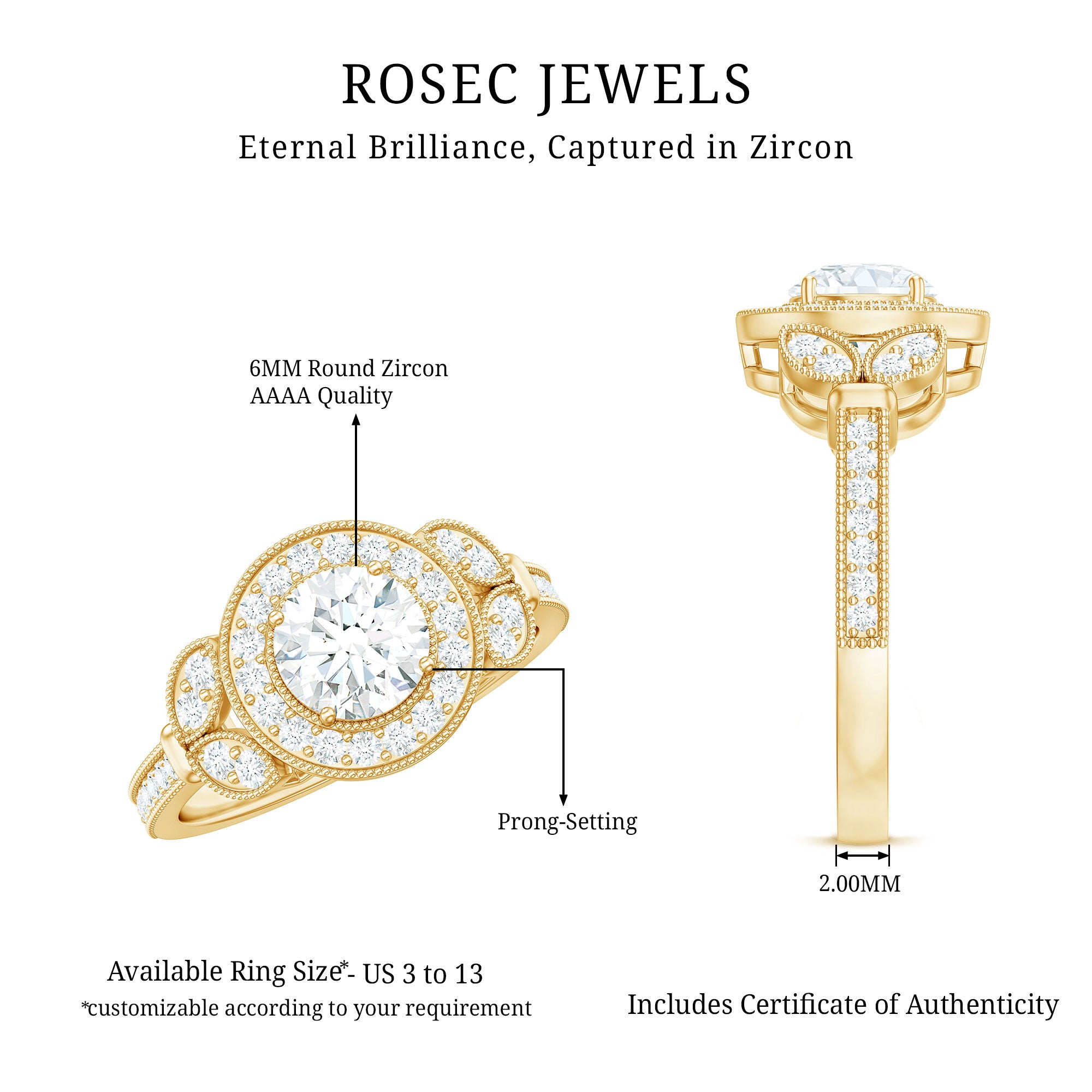 The fire and brilliance of Zircon Engagement Ring will forever shines through in every way, Our Vintage Engagement Ring gives you extra ordinary feel on your big day. This CZ Vintage Engagement Ring is embellished with Round Cut Zircon in Prong Setting surrounded with more dainty zircon and Gold Beaded Details.