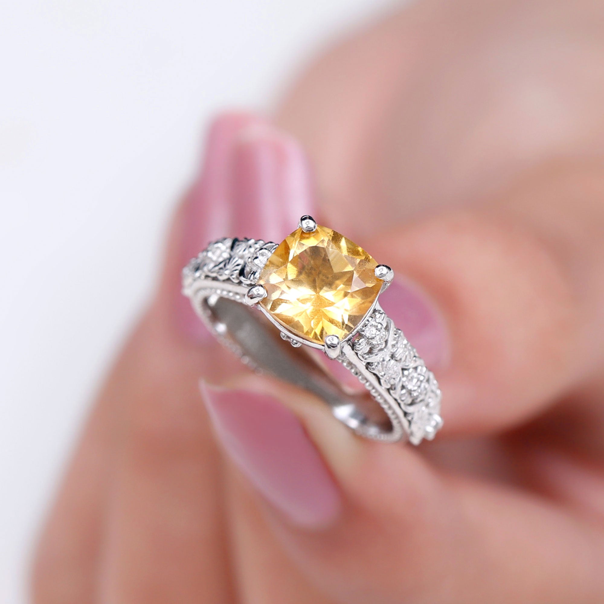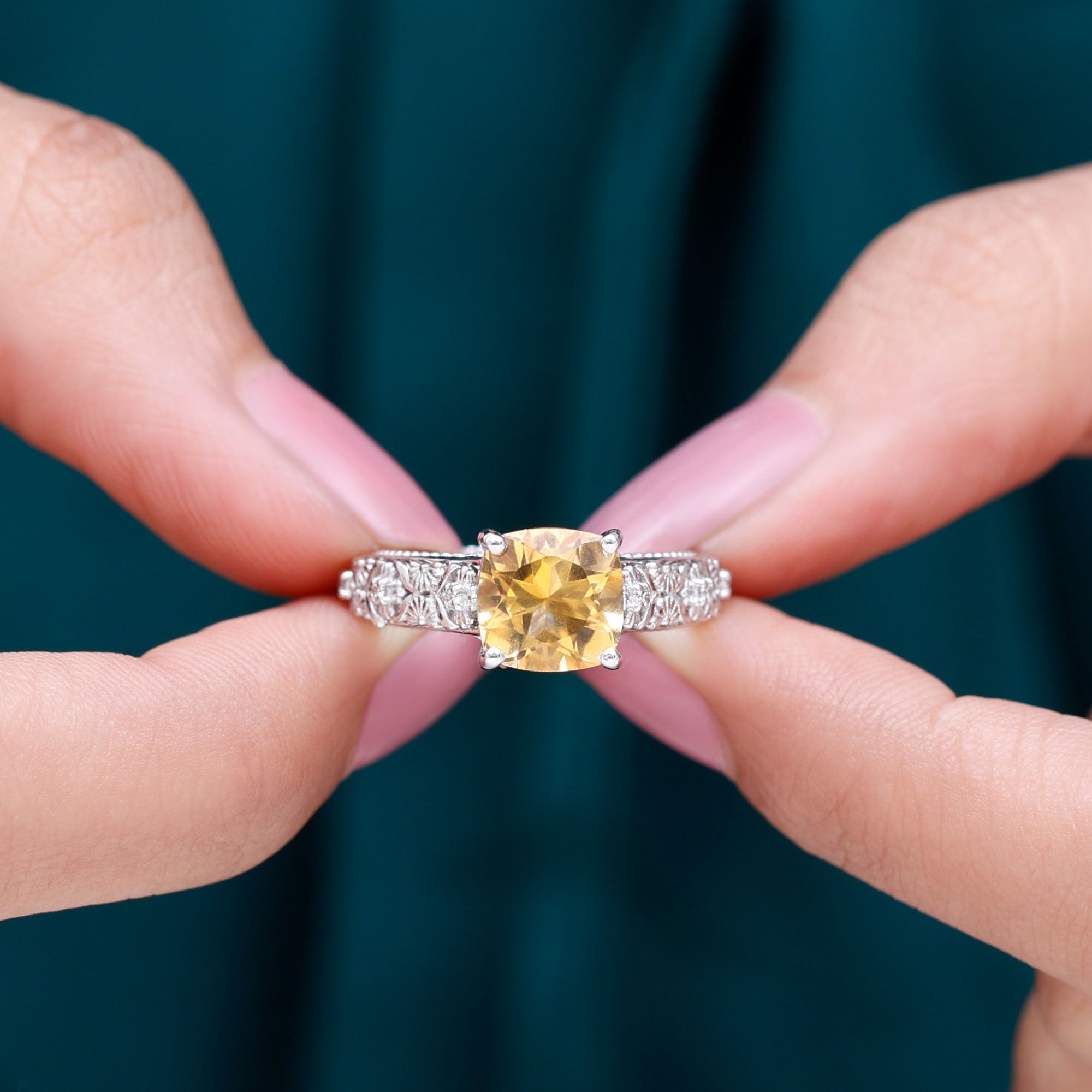 This gorgeous Cushion Cut Citrine Solitaire Ring makes for a statement accessory for women. Filigree Details are engraved on the band with Round Brilliant Diamond gemstones on the sides. This Vintage Engagement Ring is crafted in various metal options. Gift this classic ring to your mother or wife.