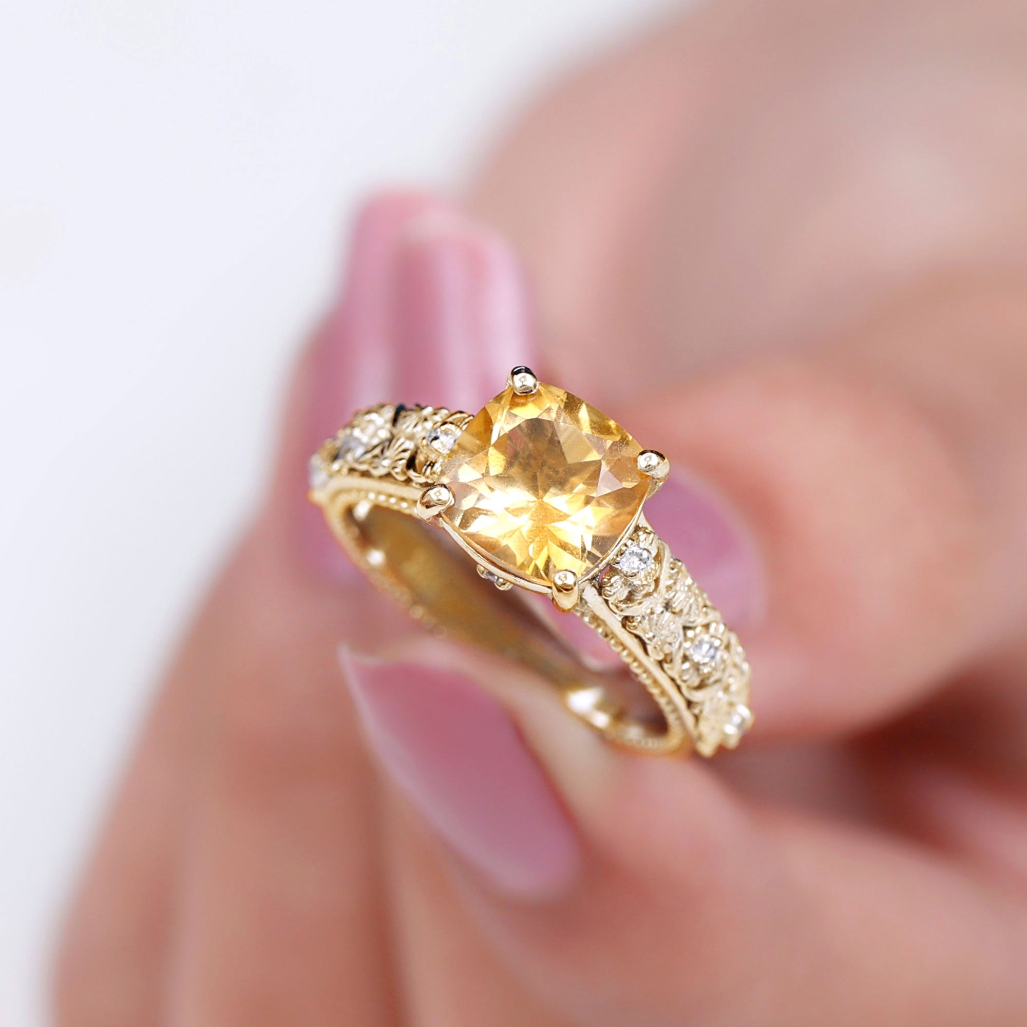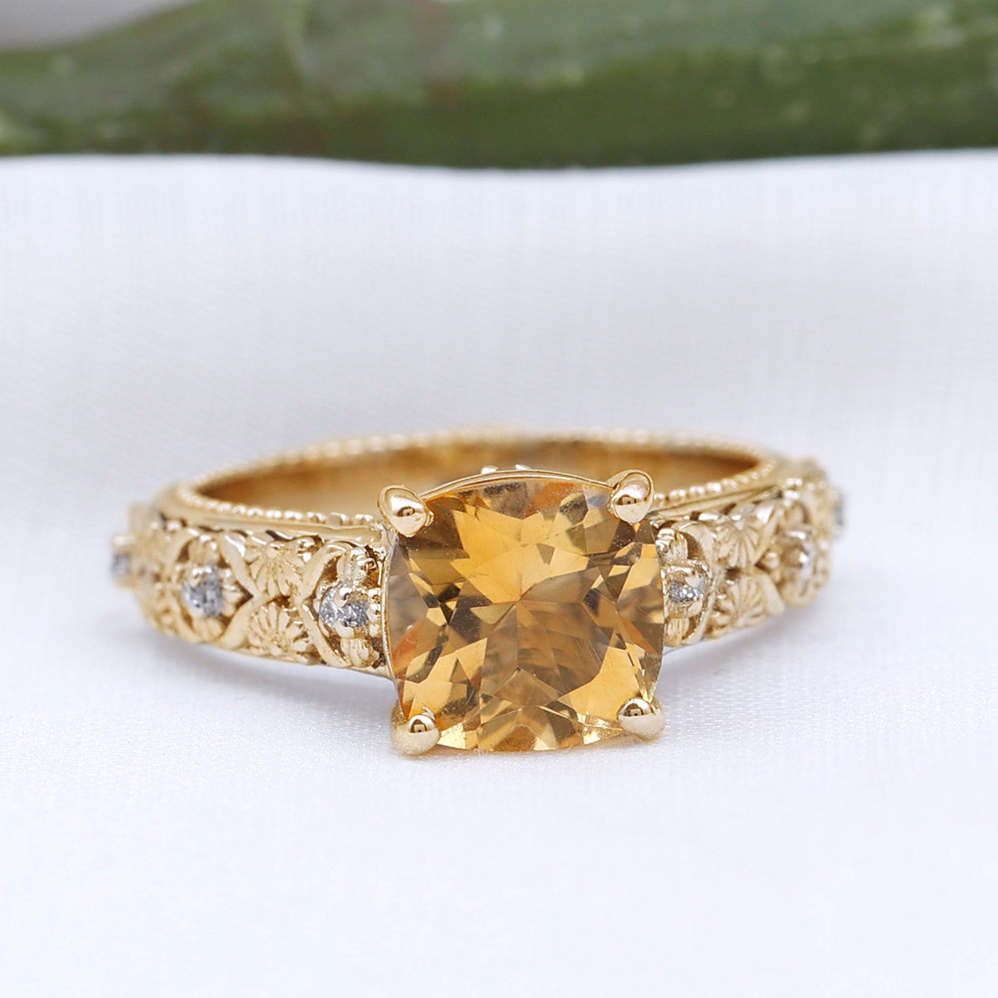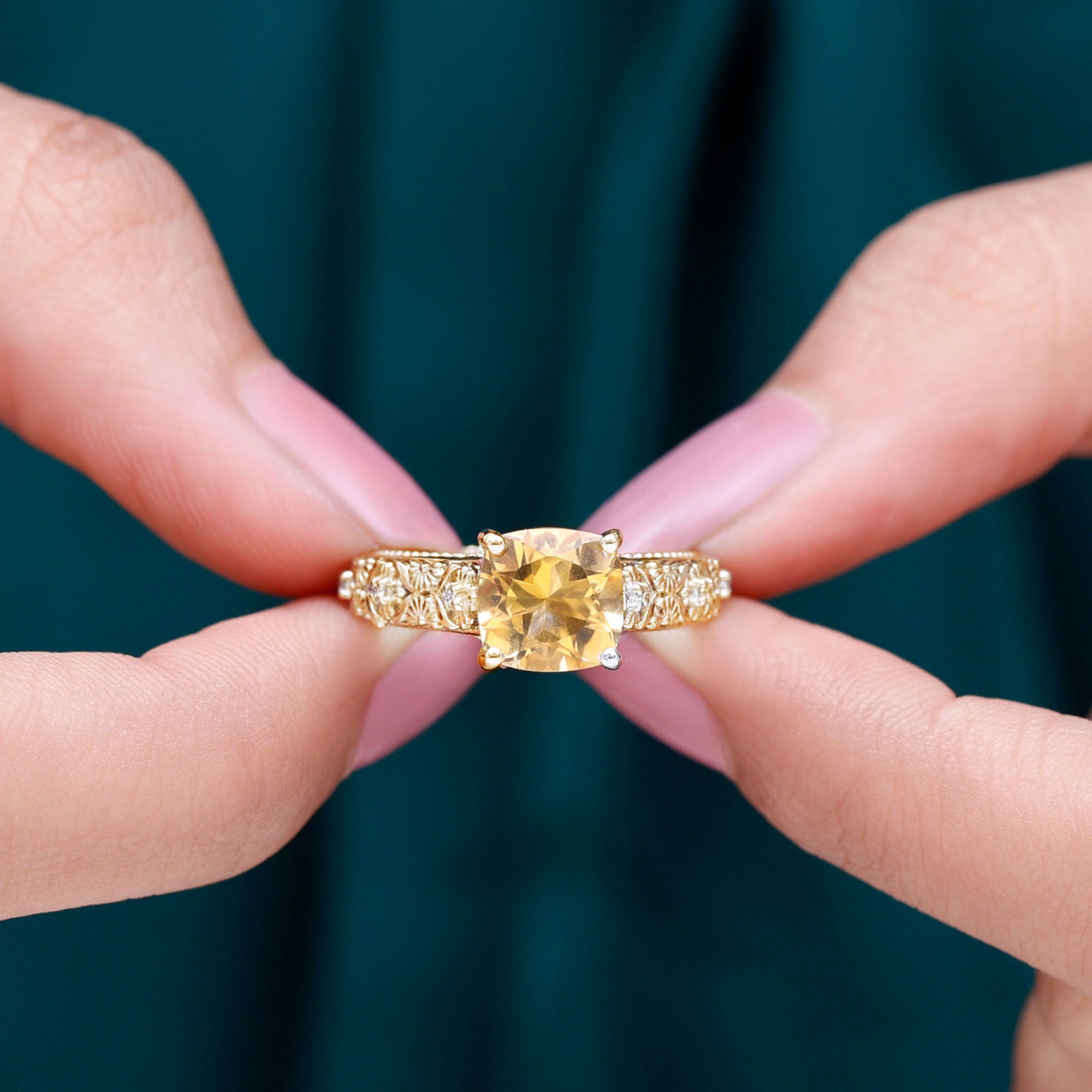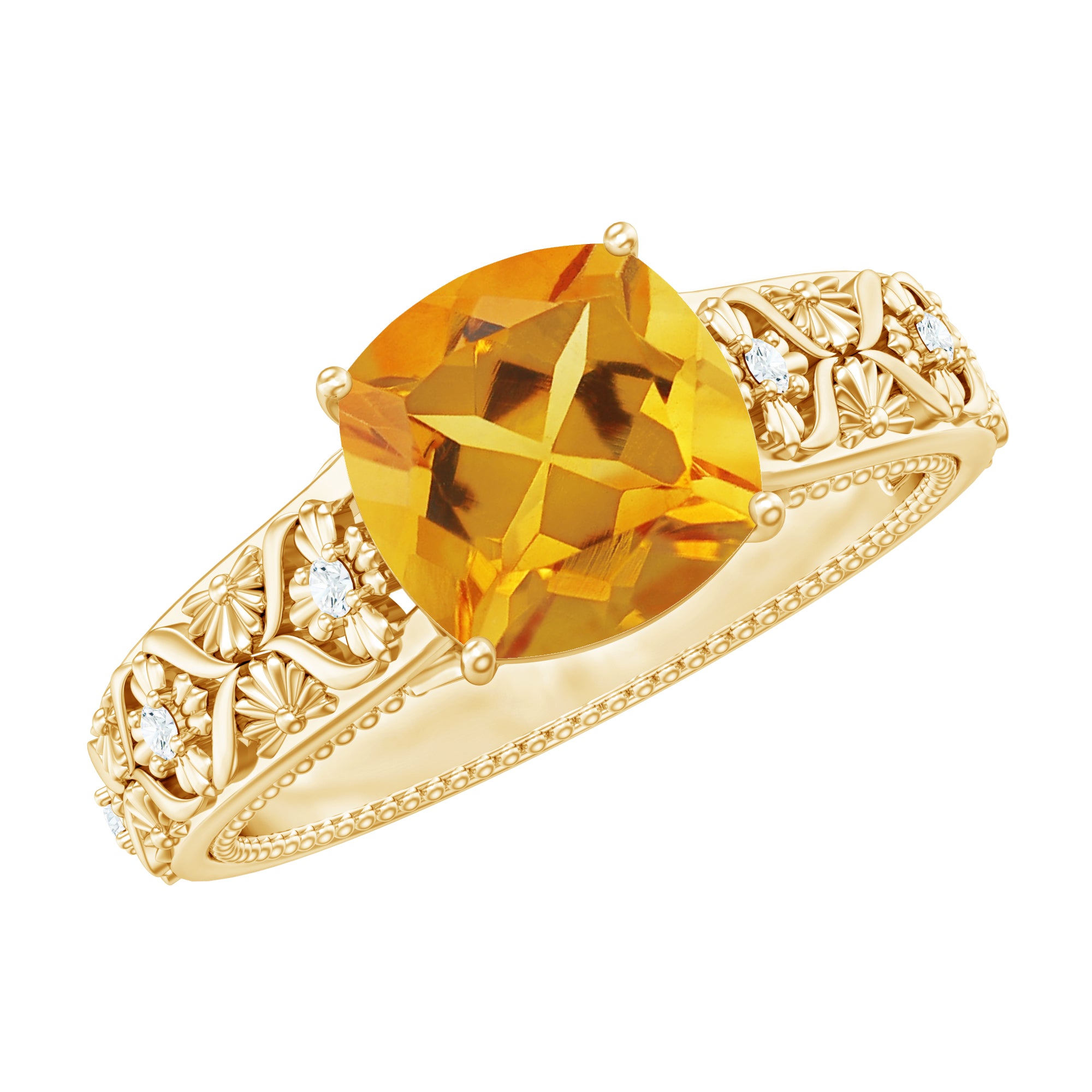 Vintage Inspired Cushion Cut Citrine Solitaire Ring with Diamond