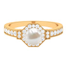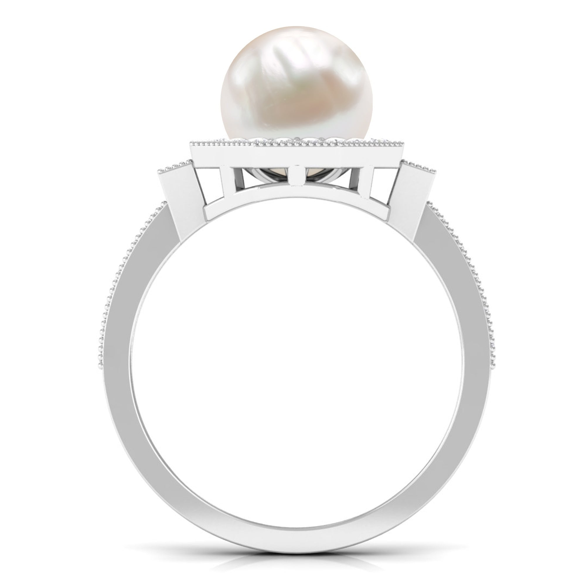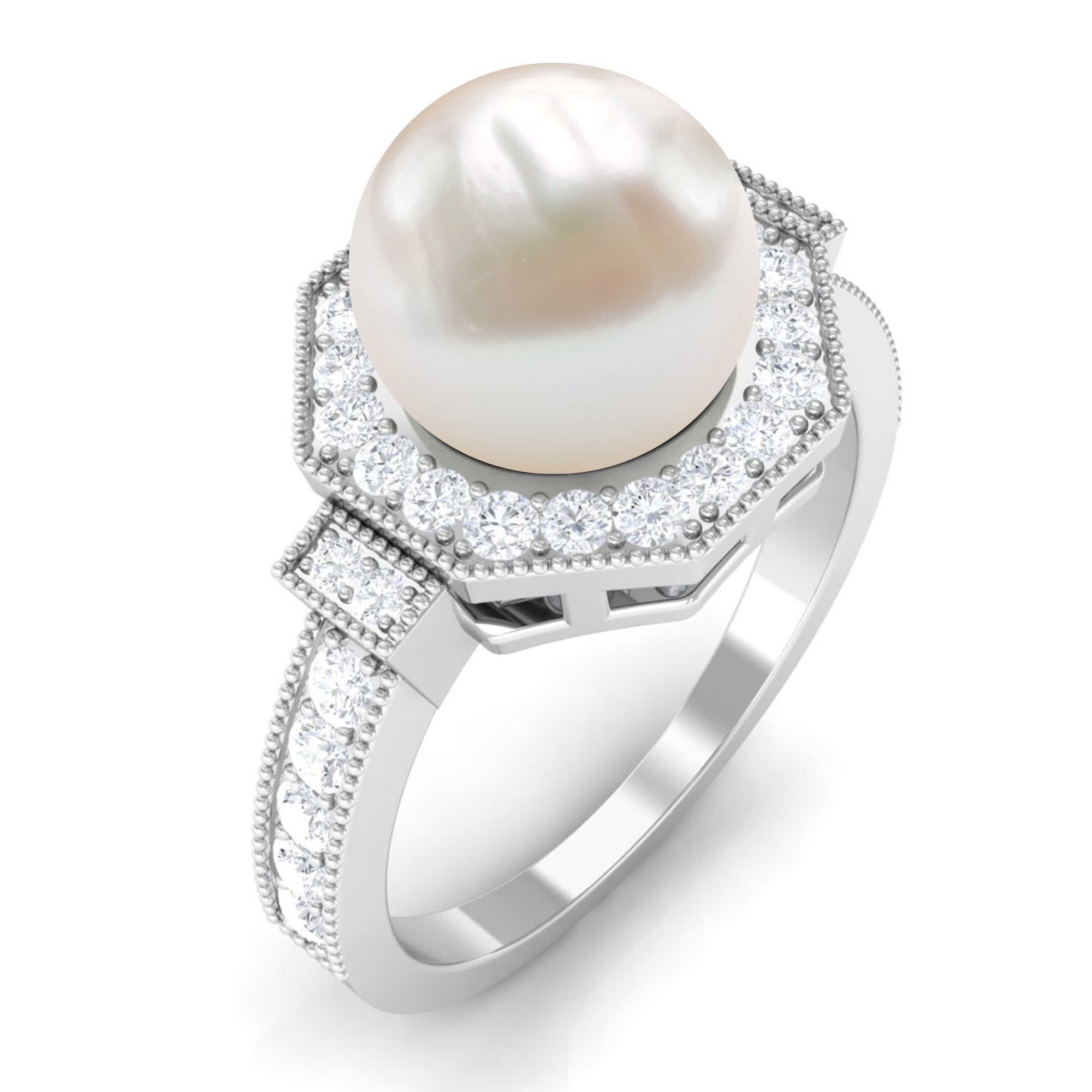 Channel the old-world queen in you by slipping on this Vintage Freshwater Pearl Ring! Exuding sheer radiance, it has been adorned with the centerpiece of 8 MM Round Shape Freshwater Pearl, made all the more dazzling with hexagonal Halo and sparkly side-stones of Diamond. It is finally let a finishing touch with Beaded detailing, bringing together its retro vibe.