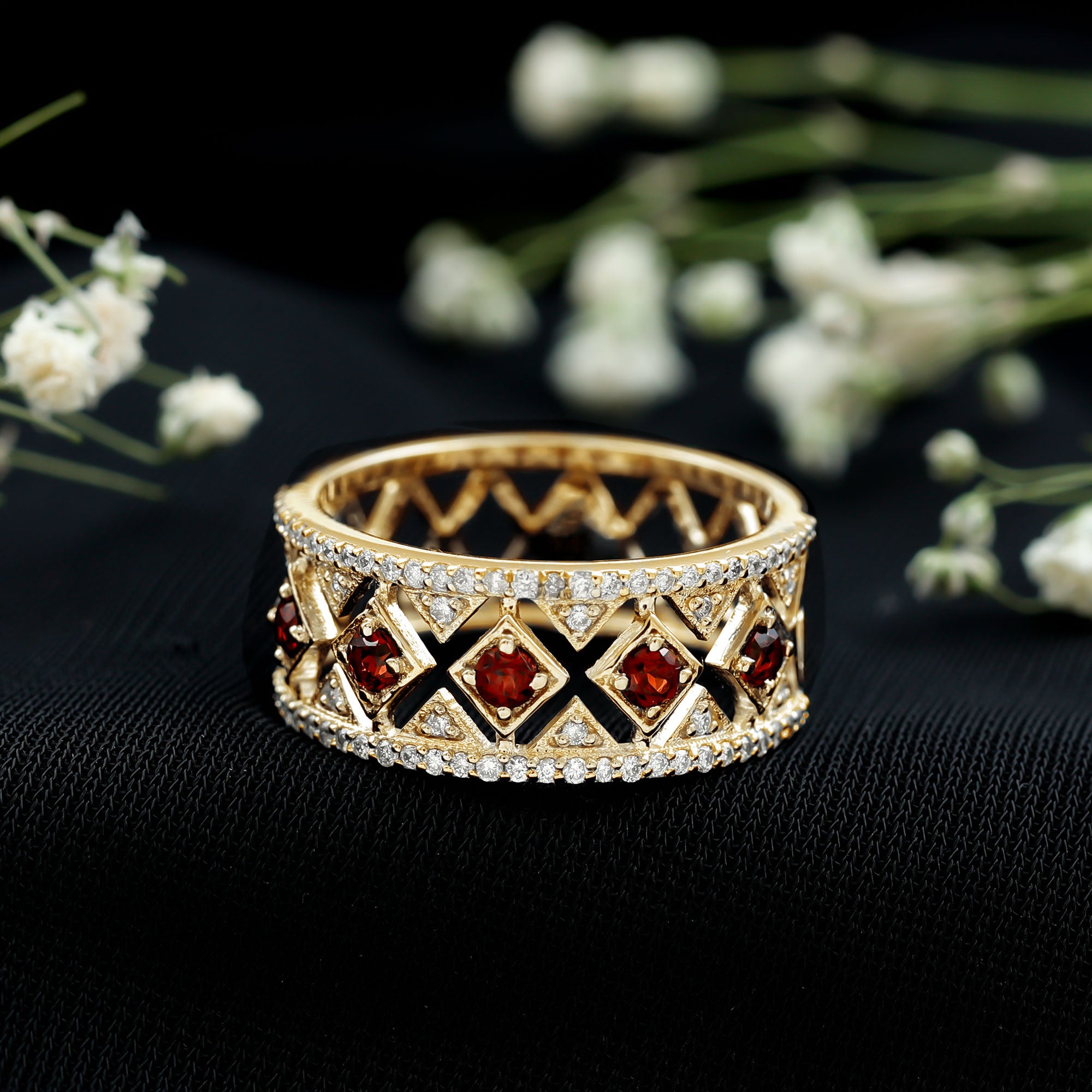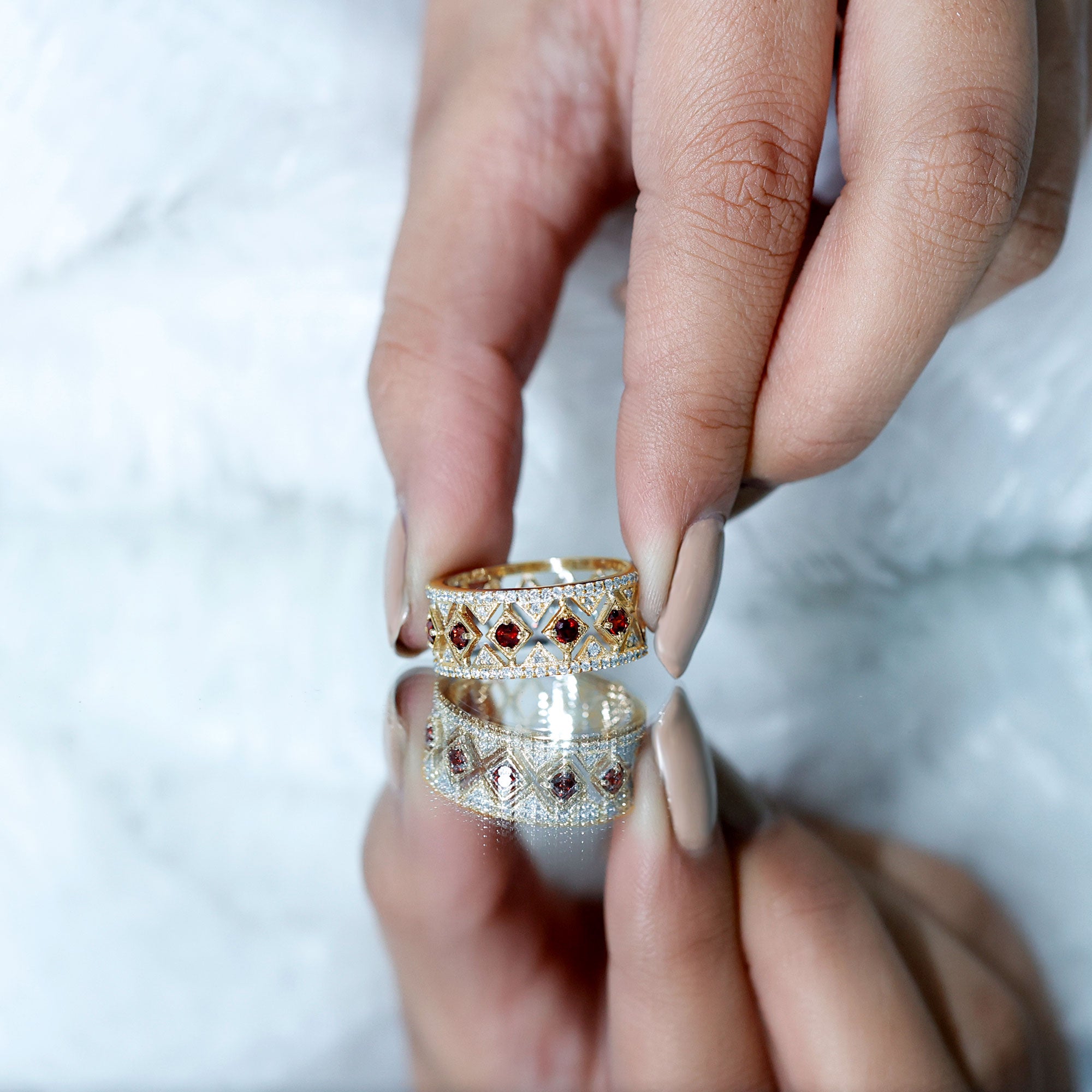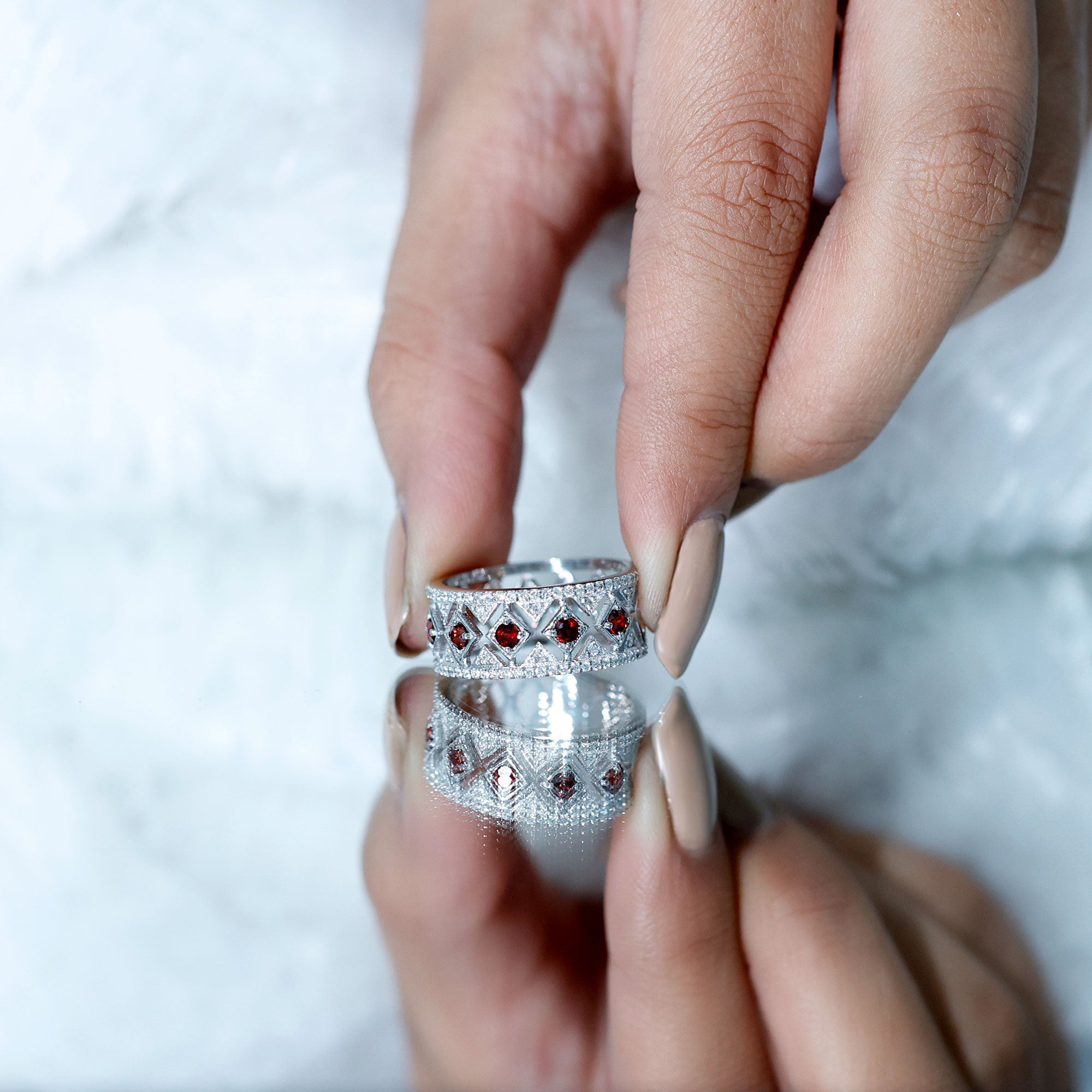Featuring bold elegance and timeless charm, this Art Deco Wedding Band is designed for lovers who crave a statement of enduring devotion. The 3 mm Round Shape Garnet stones are carefully set in Prong Setting alongside sparkling Diamond stones in a striking geometric pattern, evoking the glamour and sophistication of the Art Deco era while celebrating an entirely modern love. Its thick band creates a sense of strength, symbolizing a bond that stands the test of time. Each gemstone catches the light in a dazzling play of color and brilliance, making every glance at this Wide Wedding Band a reminder of shared moments and cherished memories. Crafted with care, this Garnet Diamond Ring balances artistry and comfort, ensuring it feels as wonderful to wear as it looks. Delivered in a signature jewelry box, it is ready to surprise, delight and make a lasting impression, whether on a wedding day, anniversary or special occasion. Combining vintage inspiration with contemporary romance, this Thick Wedding Band transforms a simple gesture into an unforgettable promise of eternal love.