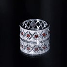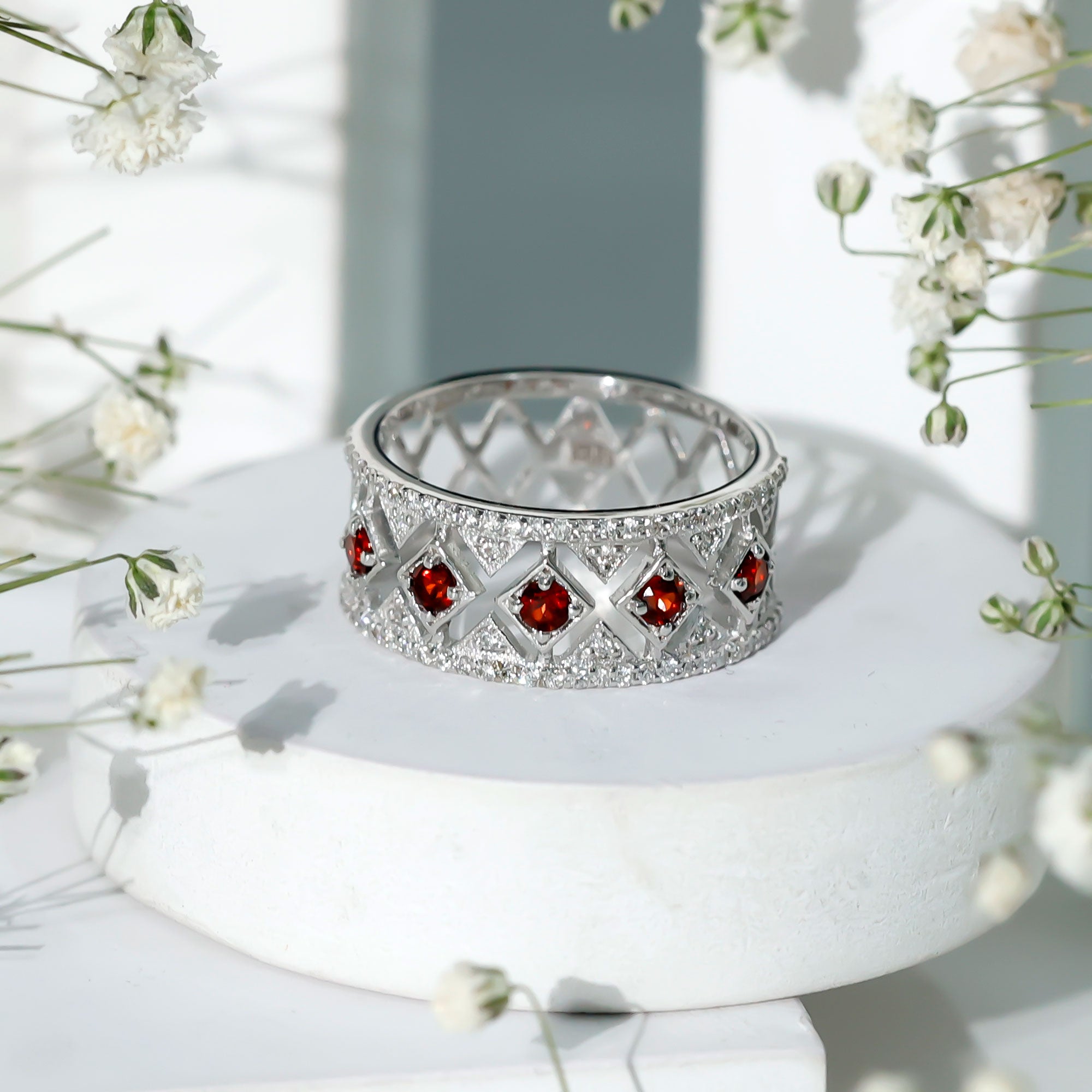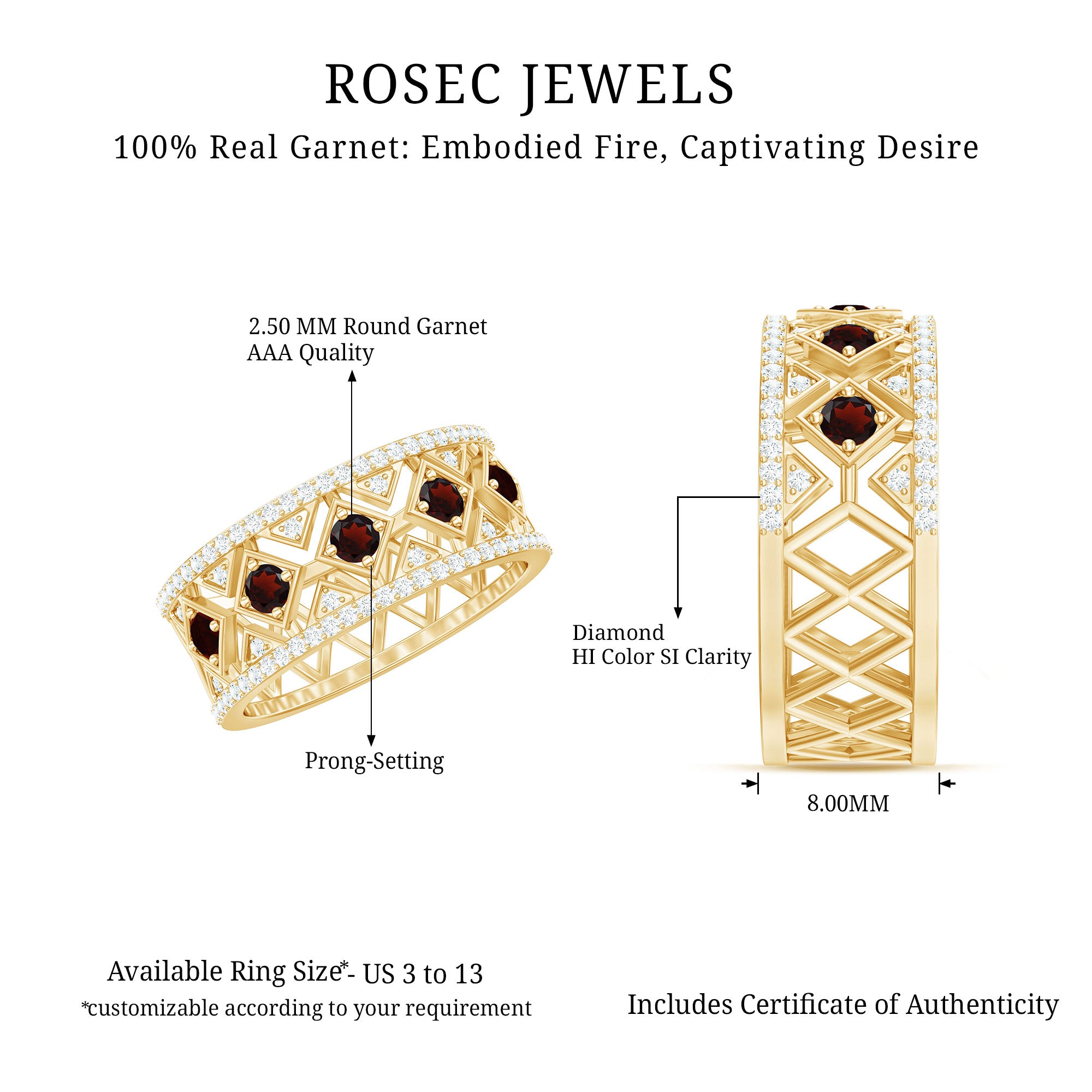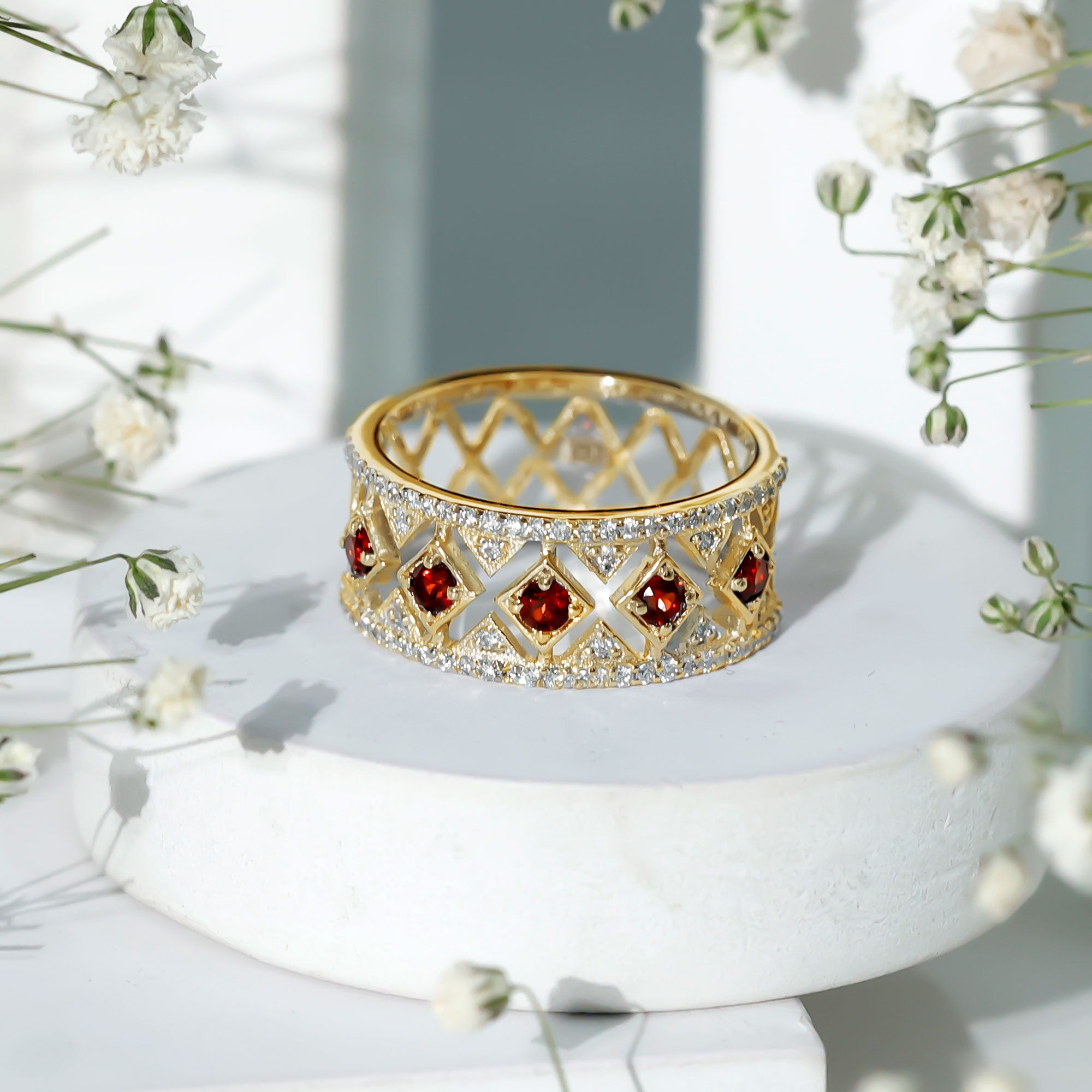 Featuring bold elegance and timeless charm, this Art Deco Wedding Band is designed for lovers who crave a statement of enduring devotion. The 3 mm Round Shape Garnet stones are carefully set in Prong Setting alongside sparkling Diamond stones in a striking geometric pattern, evoking the glamour and sophistication of the Art Deco era while celebrating an entirely modern love. Its thick band creates a sense of strength, symbolizing a bond that stands the test of time. Each gemstone catches the light in a dazzling play of color and brilliance, making every glance at this Wide Wedding Band a reminder of shared moments and cherished memories. Crafted with care, this Garnet Diamond Ring balances artistry and comfort, ensuring it feels as wonderful to wear as it looks. Delivered in a signature jewelry box, it is ready to surprise, delight and make a lasting impression, whether on a wedding day, anniversary or special occasion. Combining vintage inspiration with contemporary romance, this Thick Wedding Band transforms a simple gesture into an unforgettable promise of eternal love.