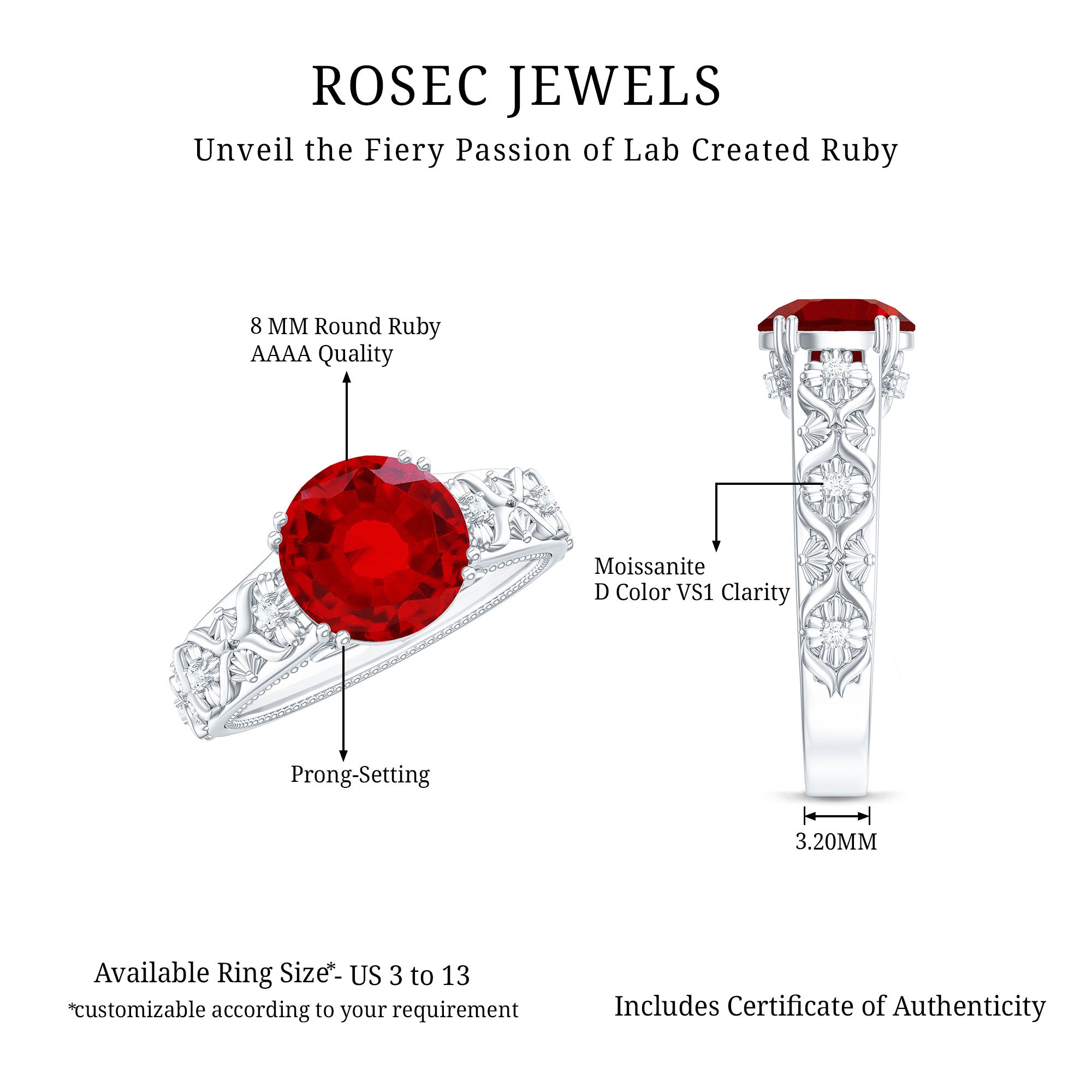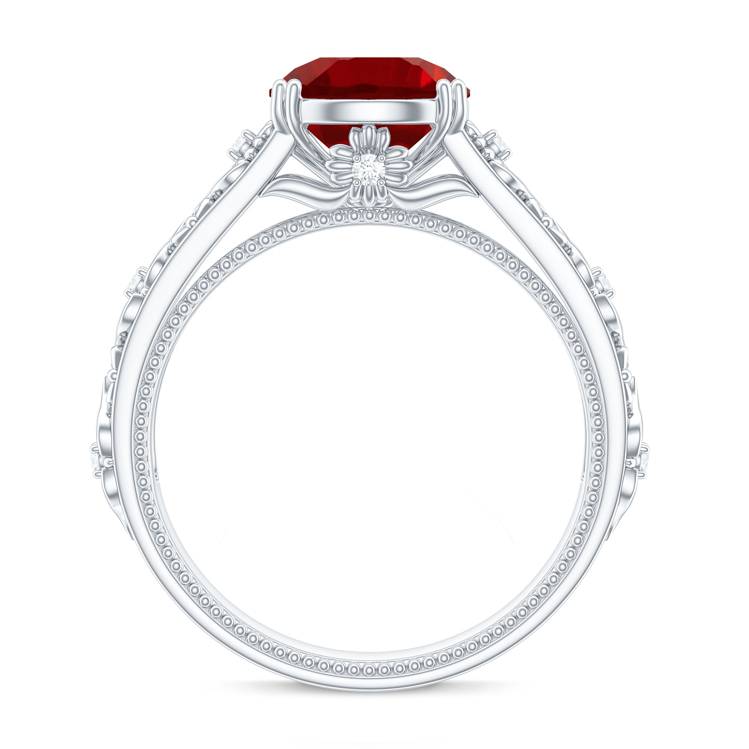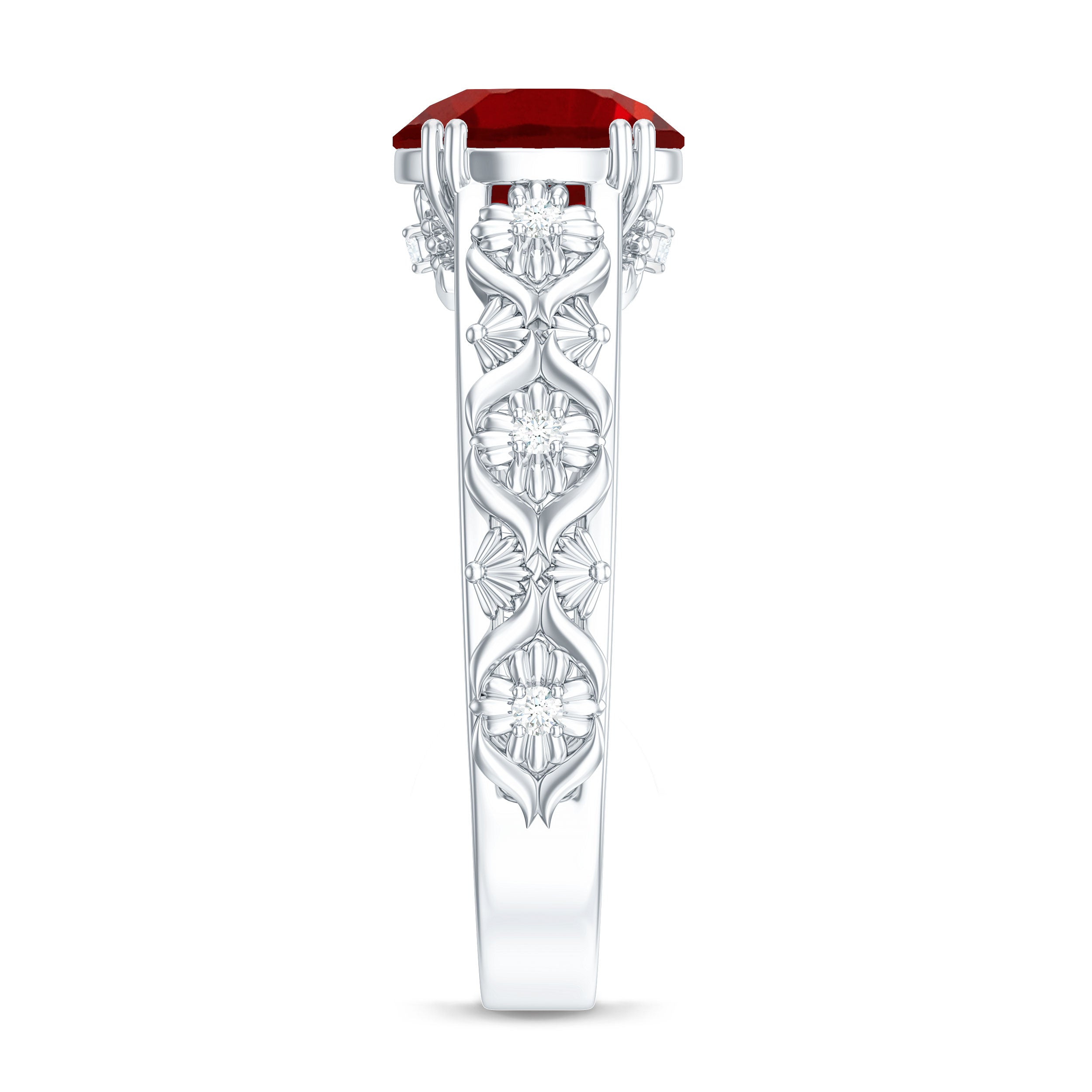 Flowers have always served as a source of inspiration, and their incorporation into design is incredibly unique, especially with this beautiful Lab Created Ruby Engagement Ring. Celebrate the splendor of nature with this stunning Nature Inspired Engagement Ring. It features an 8 MM round shape lab grown ruby set in double prong setting as a solitaire. The band is embellished with engraved flowers that sparkle with round brilliant cut moissanite stones, enhancing its visual appeal. This Vintage Looking Engagement Ring embodies femininity, resembling a floral pattern that is sure to impress your beloved. The AAAA quality lab created ruby and D Color VS1 Clarity moissanites possess timeless beauty and brilliant brightness, capturing attention with their sparkle and shine. Its vintage design evokes the feel of a treasured heirloom, meant to carry a love story through generations. So, embrace the charm of this Ruby Flower Ring, which radiates a delicate and elegant feminine power.