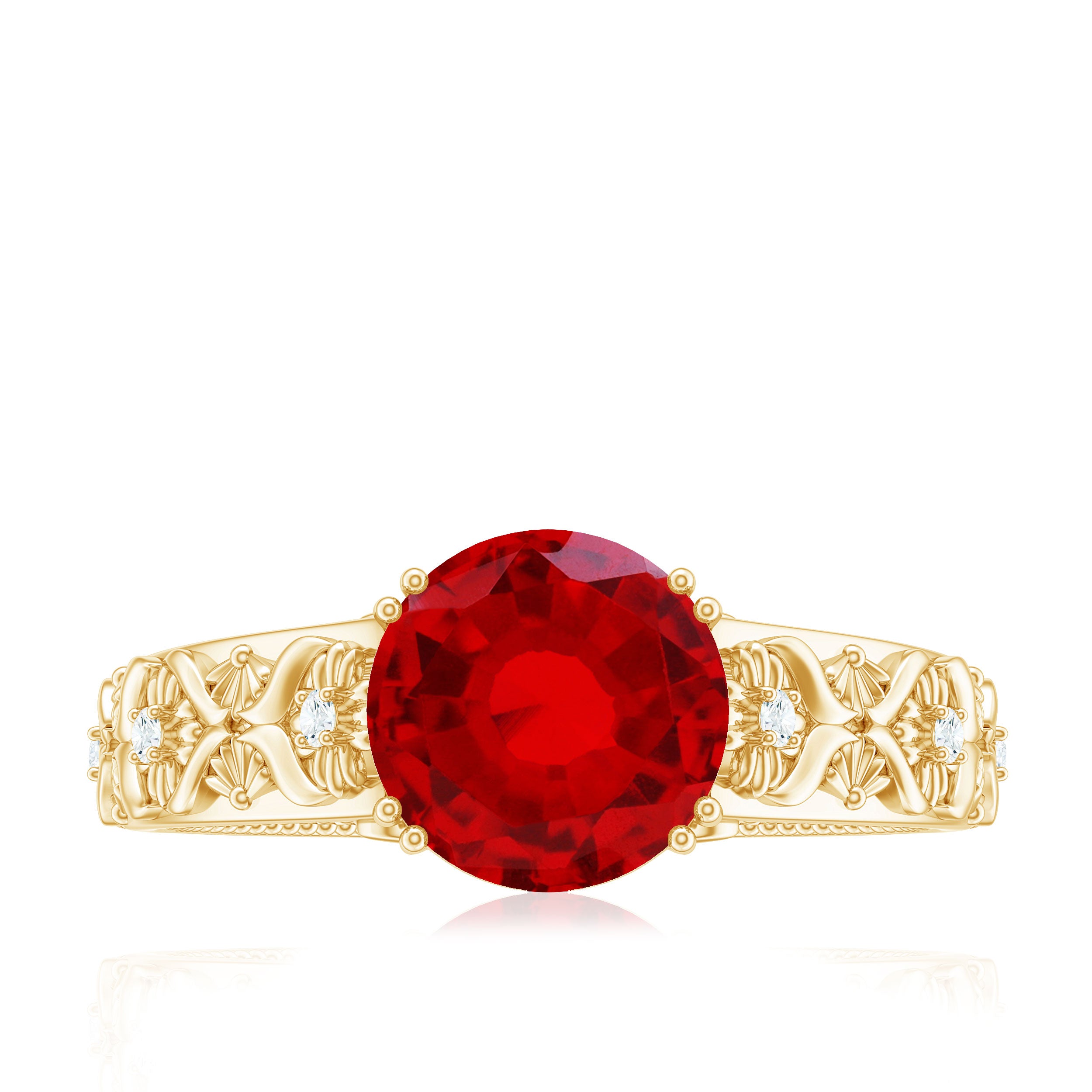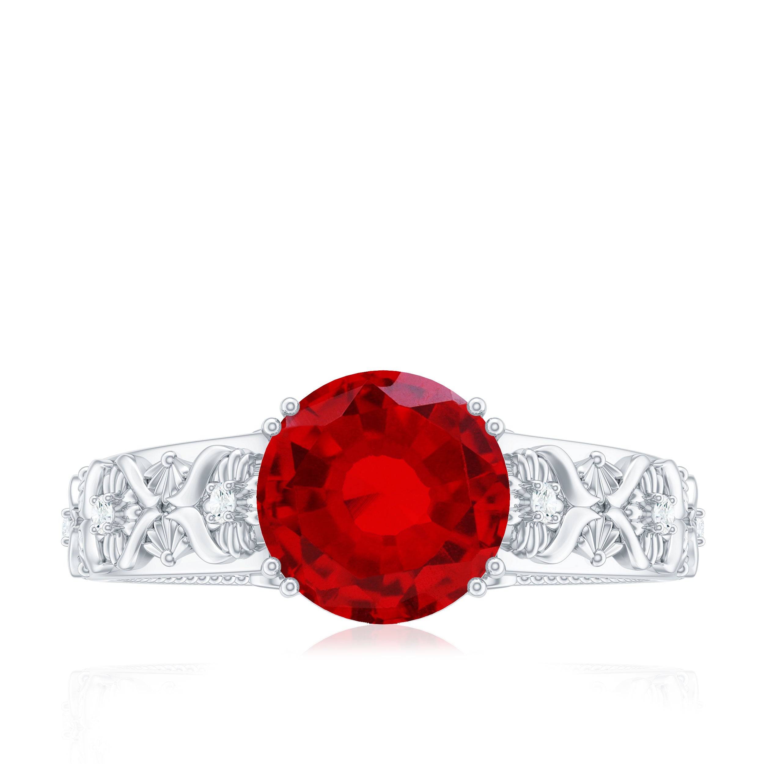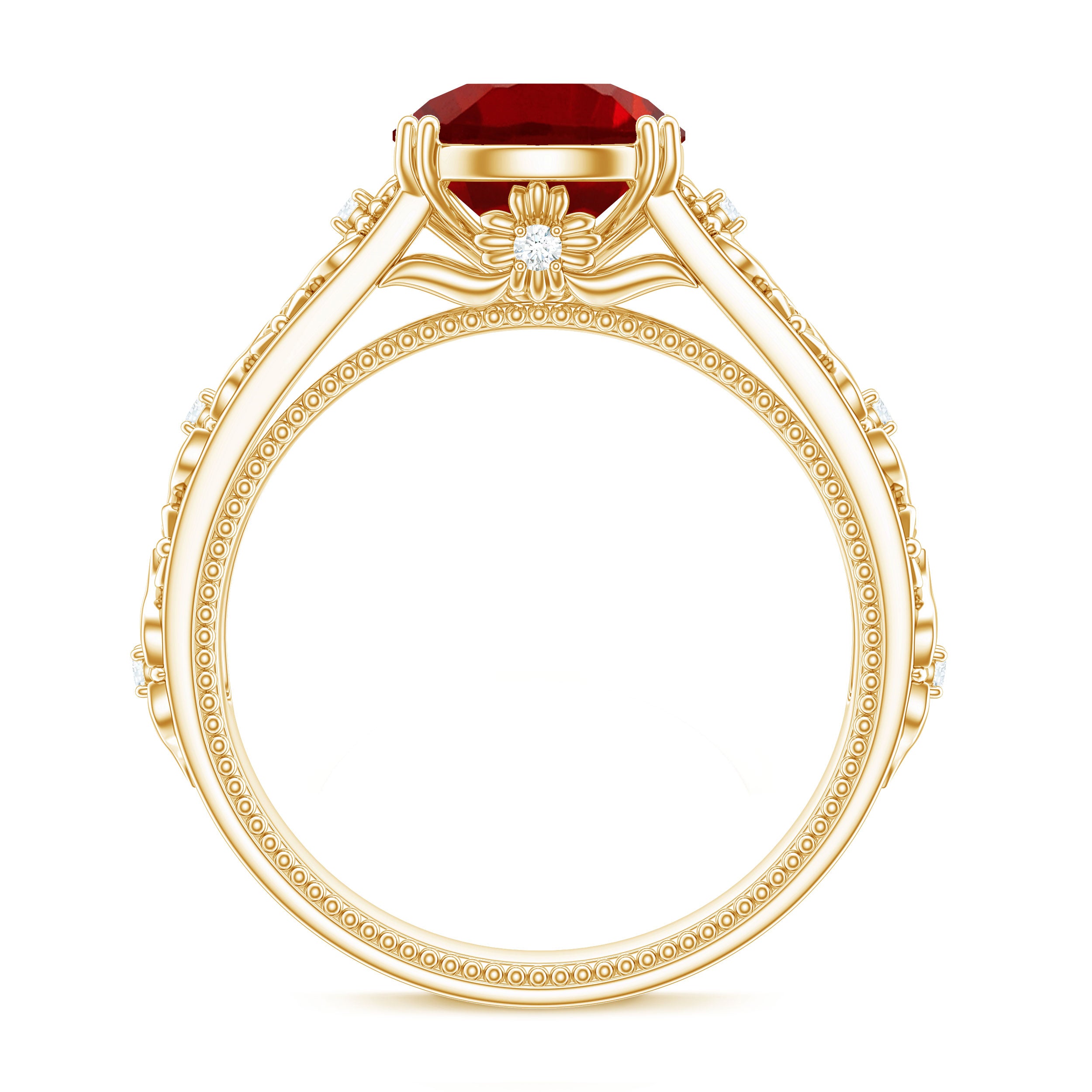 Flowers have always served as a source of inspiration, and their incorporation into design is incredibly unique, especially with this beautiful Lab Created Ruby Engagement Ring. Celebrate the splendor of nature with this stunning Nature Inspired Engagement Ring. It features an 8 MM round shape lab grown ruby set in double prong setting as a solitaire. The band is embellished with engraved flowers that sparkle with round brilliant cut moissanite stones, enhancing its visual appeal. This Vintage Looking Engagement Ring embodies femininity, resembling a floral pattern that is sure to impress your beloved. The AAAA quality lab created ruby and D Color VS1 Clarity moissanites possess timeless beauty and brilliant brightness, capturing attention with their sparkle and shine. Its vintage design evokes the feel of a treasured heirloom, meant to carry a love story through generations. So, embrace the charm of this Ruby Flower Ring, which radiates a delicate and elegant feminine power.