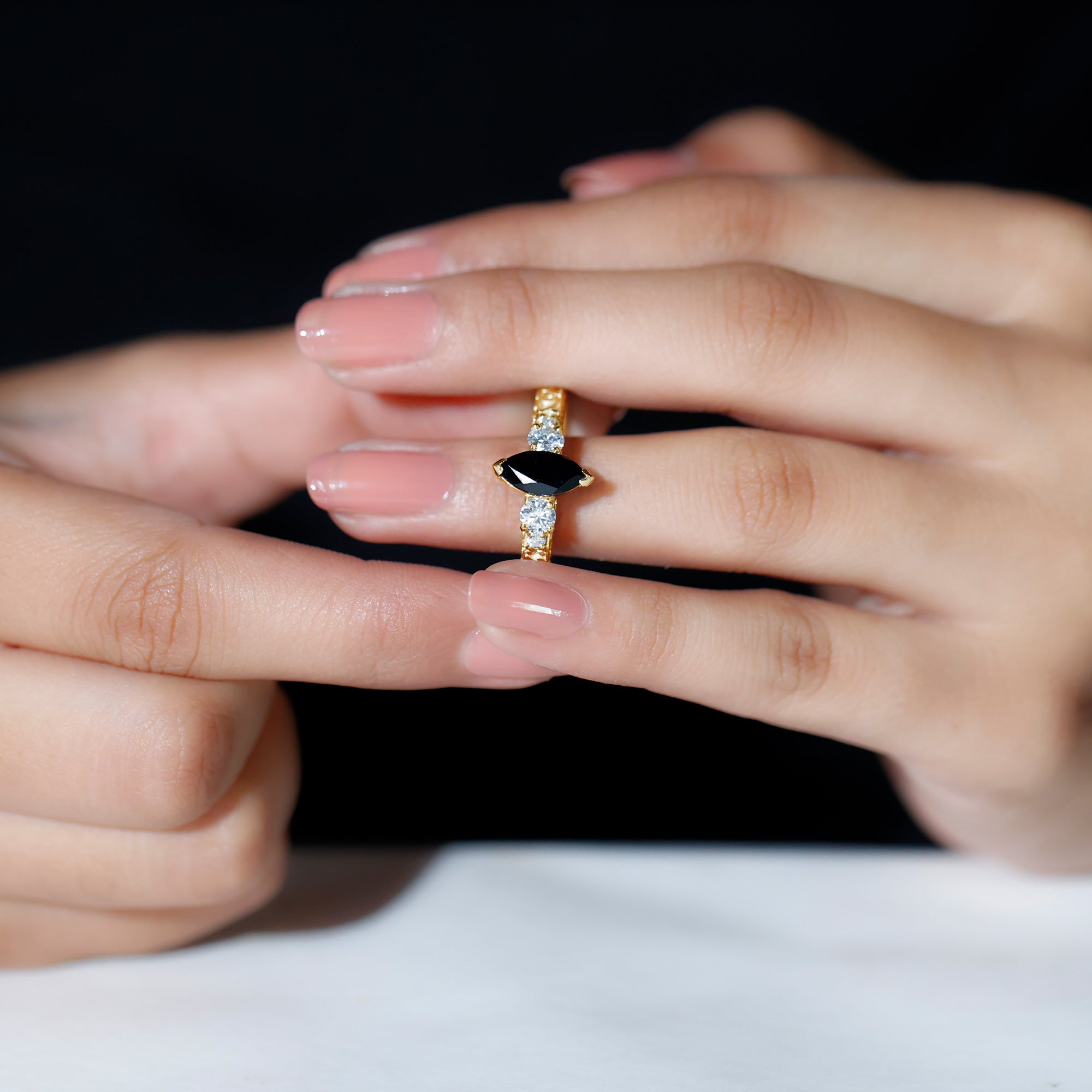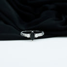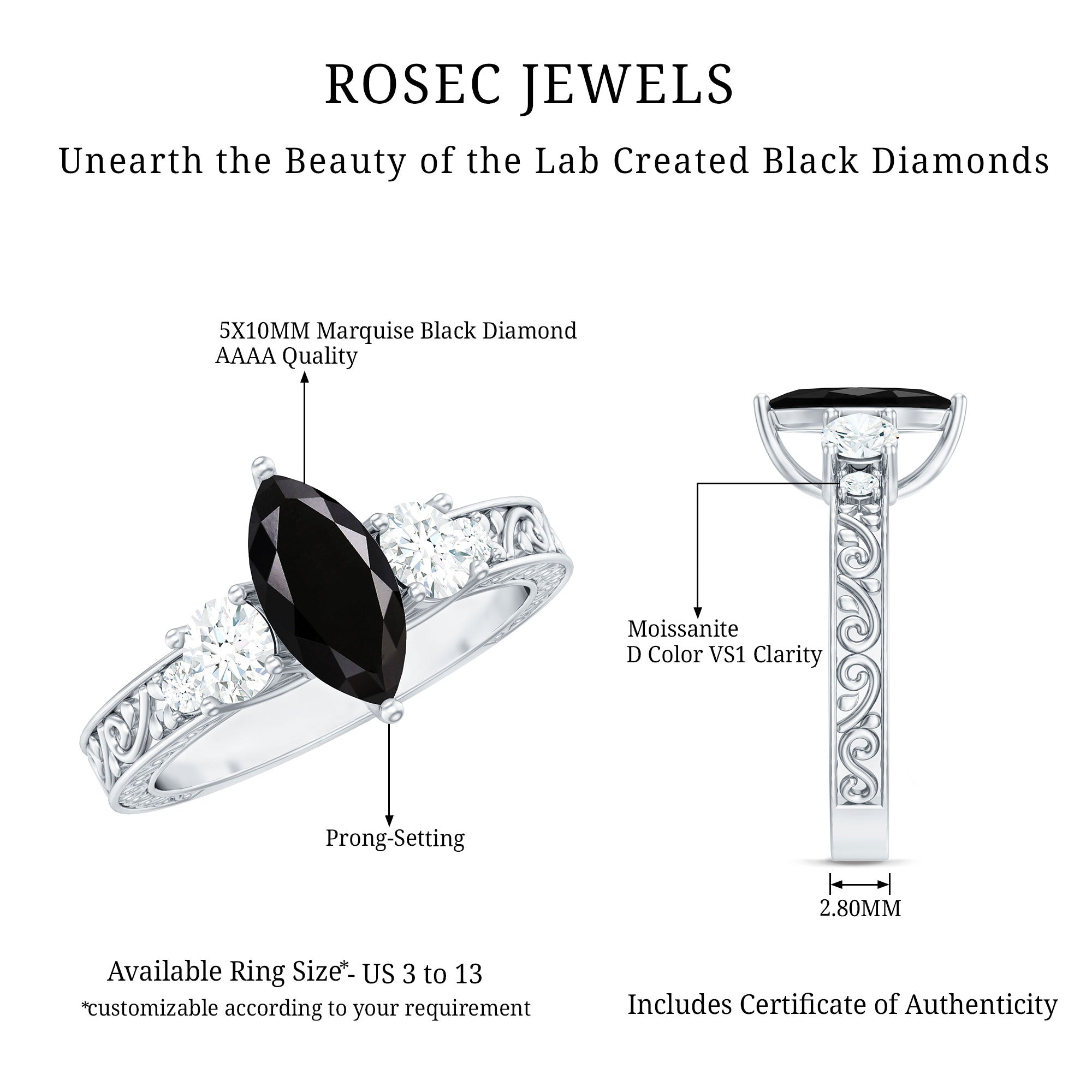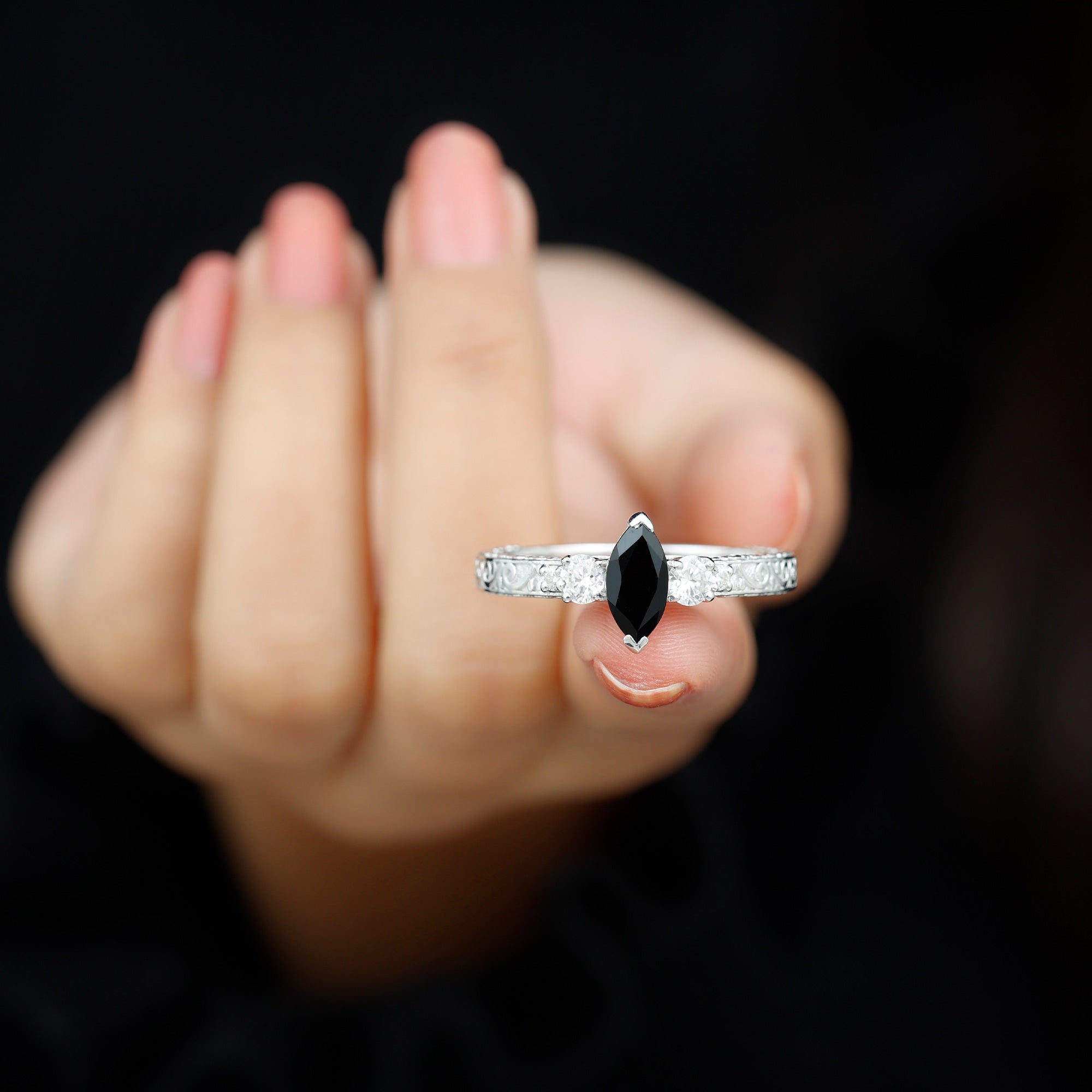 Evoke the timeless allure of vintage glamour with our Vintage Inspired Ring. At its heart, a resplendent Marquise Cut Lab Grown Black Diamond takes center stage in a secure prong setting. Flanking this stunning solitaire, Round Moissanite gems glisten on both sides. The intricately carved shank lends an artisanal charm to this exquisite piece.
