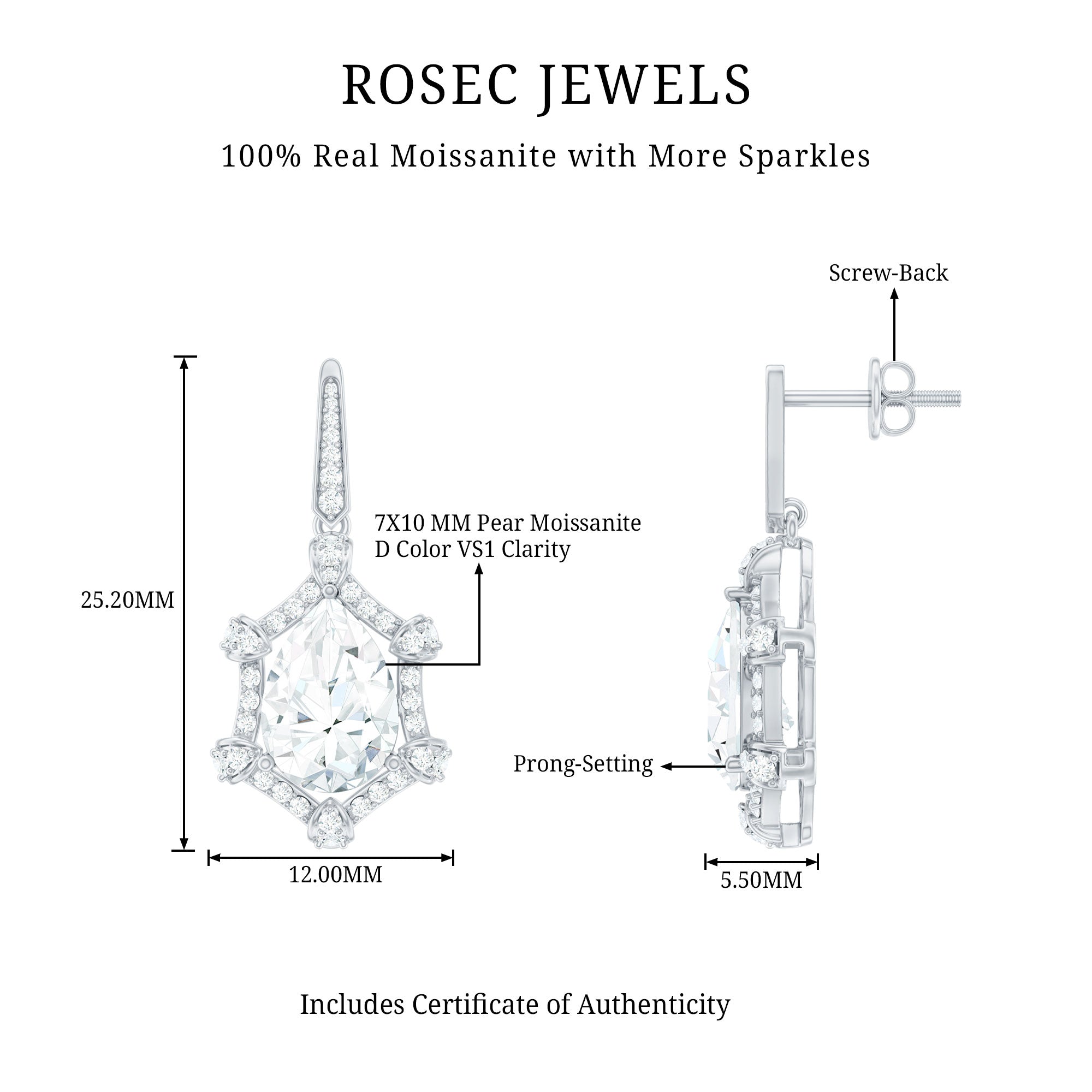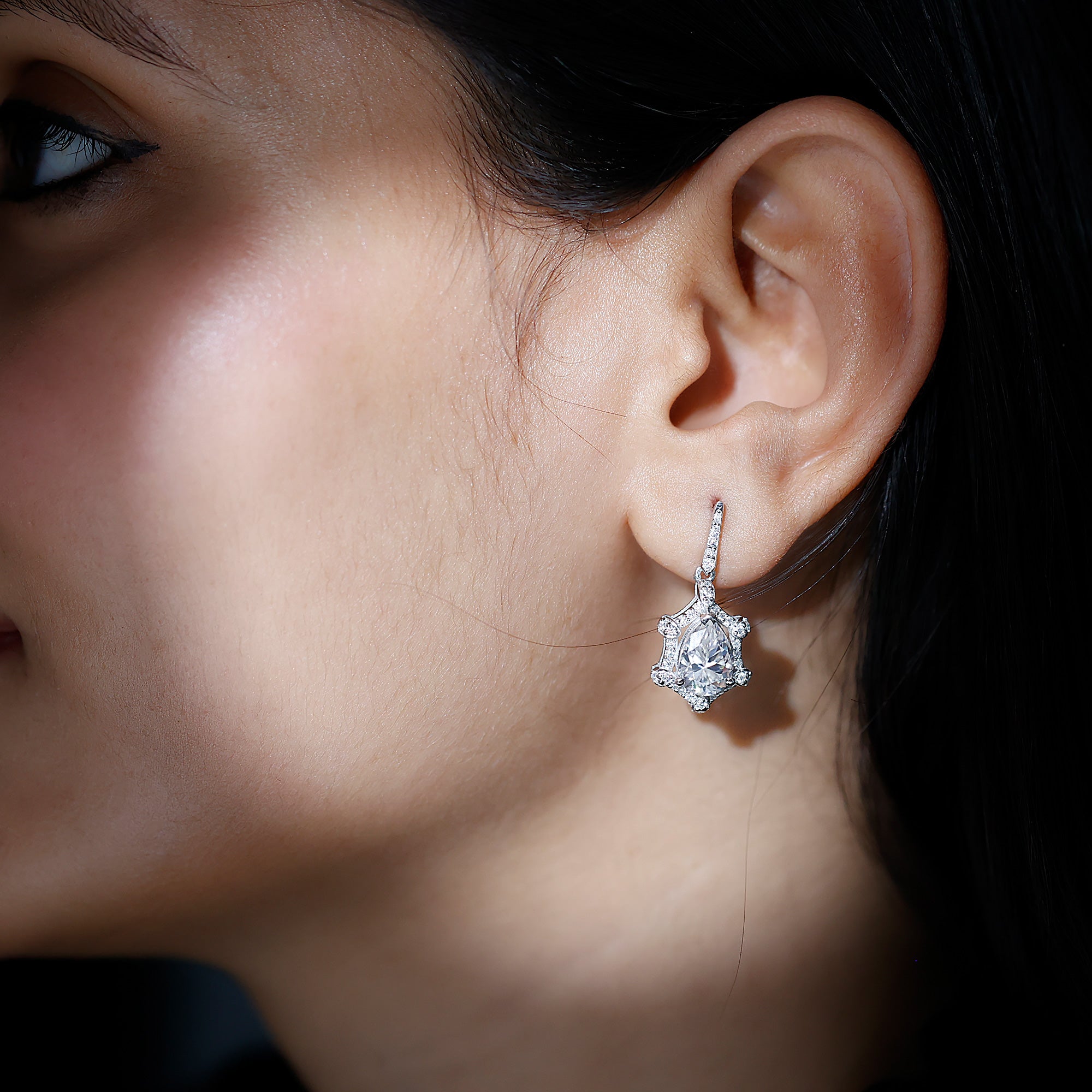 Brighten up your big day with the timeless sparkle of these stunning Wedding Drop Earrings. Featuring a beautiful 7X10 MM pear shaped moissanite in the center set in prong setting, these Silver Drop Earrings are designed to capture the light and everyones attention. Surrounding the center stone is a delicate halo of shimmering round cut stones, adding a vintage style touch to the overall design. Handcrafted in 14k White Gold Plated Silver and comes with secure screw back closure that ensures they stay comfortable in place throughout all your celebrations. Perfect for brides who dream of combining old world charm with modern sparkle, these Moissanite Earrings are a classic choice to complete your special look.