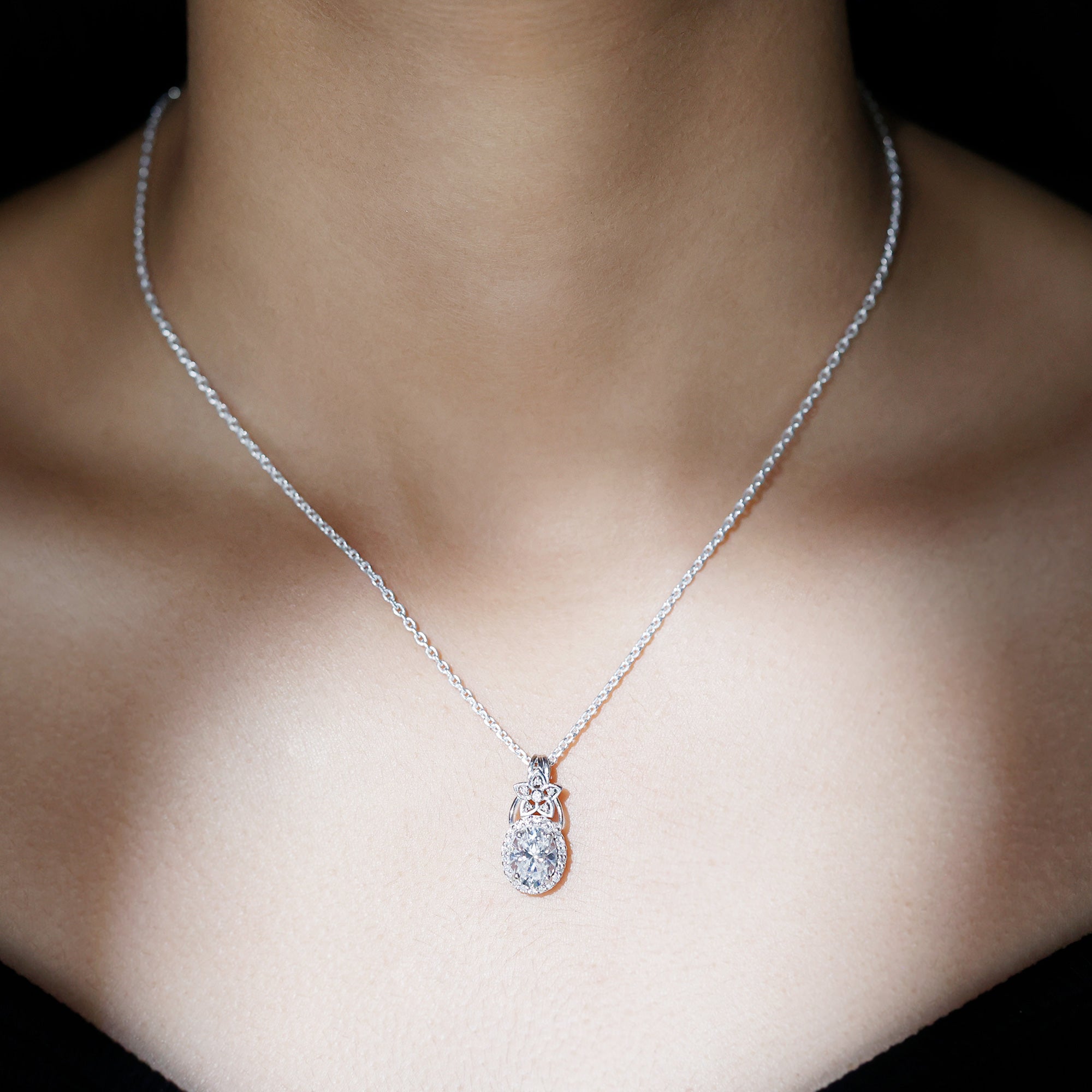 This Vintage inspired Moissanite Pendant is all you want to complete your look for a special day. The Pendant features a 7X9 MM Oval Shape Moissanite securely placed in prong setting and encircled by a smaller halo of Moissanite stones and accentuated with a stone studded floral motif. This Vintage Pendant Necklace beholds the shine of D-VS1 Quality Moissanite and dangles in a silver cable chain, which can be adjusted as per style. This Oval Necklace can be a perfect choice of gift for your beloved on their special day. The pendant will be shipped to you in premium packaging.
