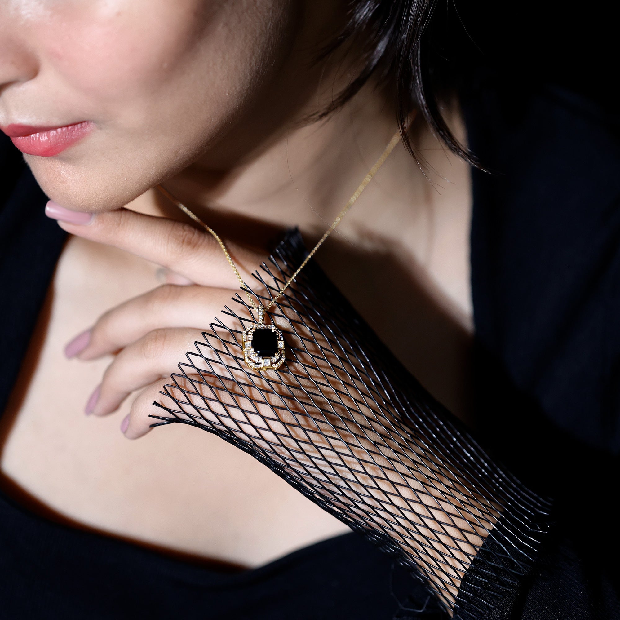 Upgrade your elegance with the enchanting Vintage Inspired Halo Pendant. The exquisite Octagon Cut Created Black Diamond, encircled by sparkling Moissanite stones, exudes vintage charm. Set securely in a Prong Setting, this necklace adds sophistication and allure to any outfit.