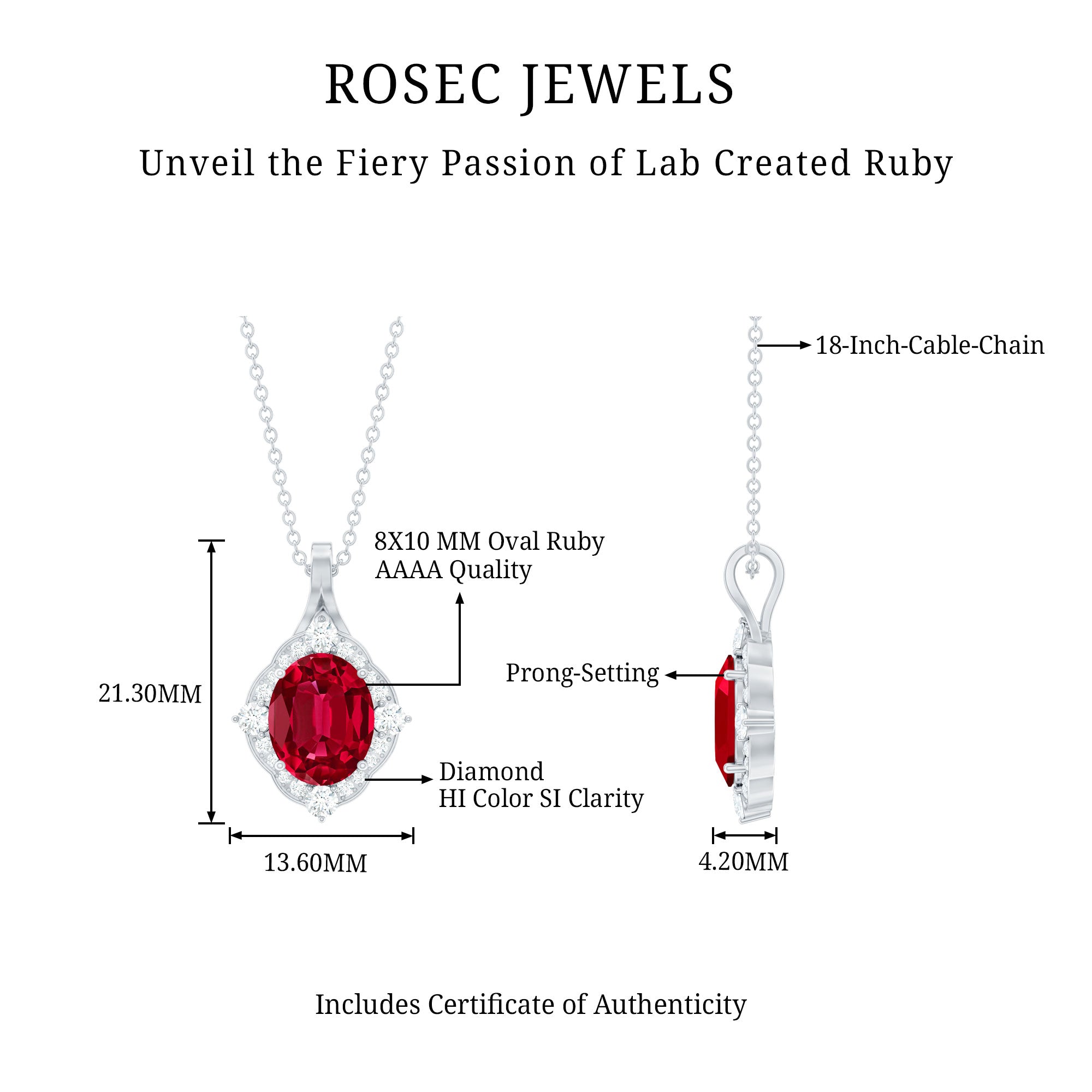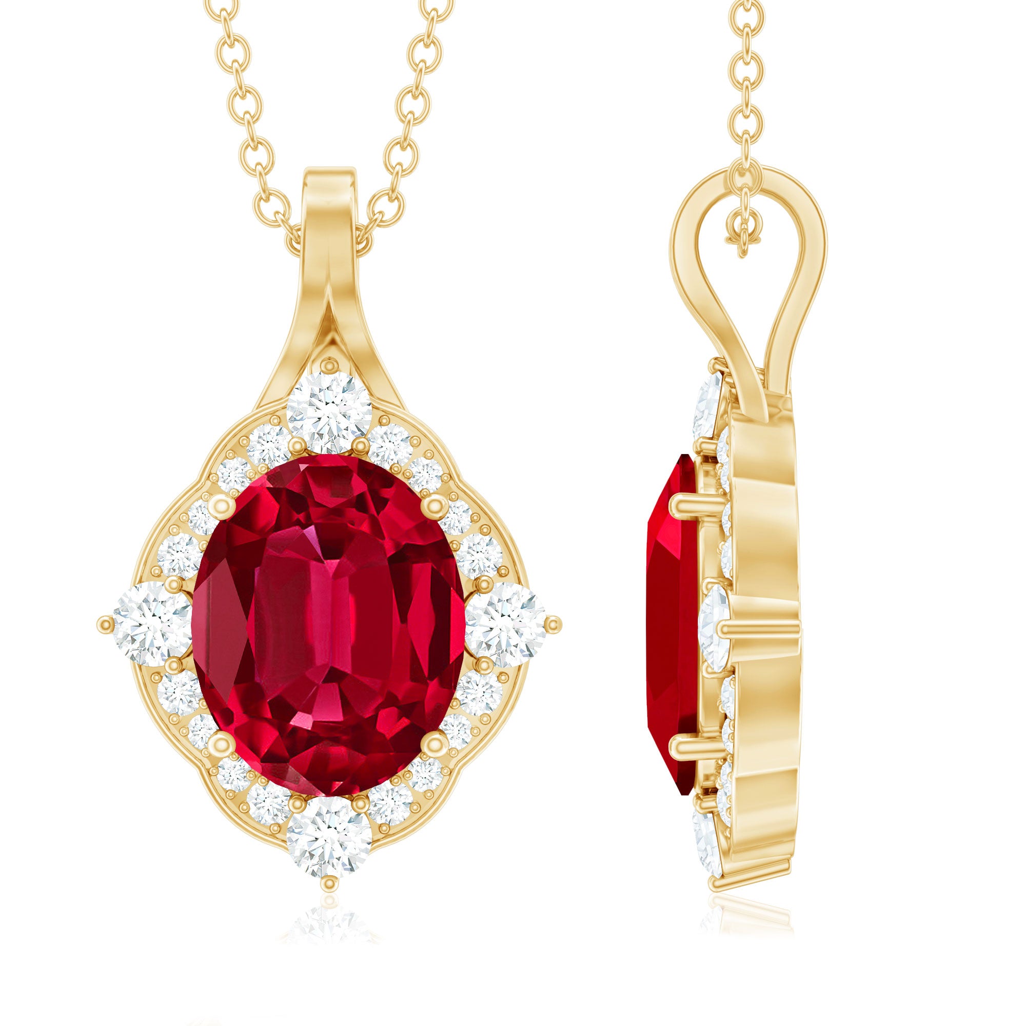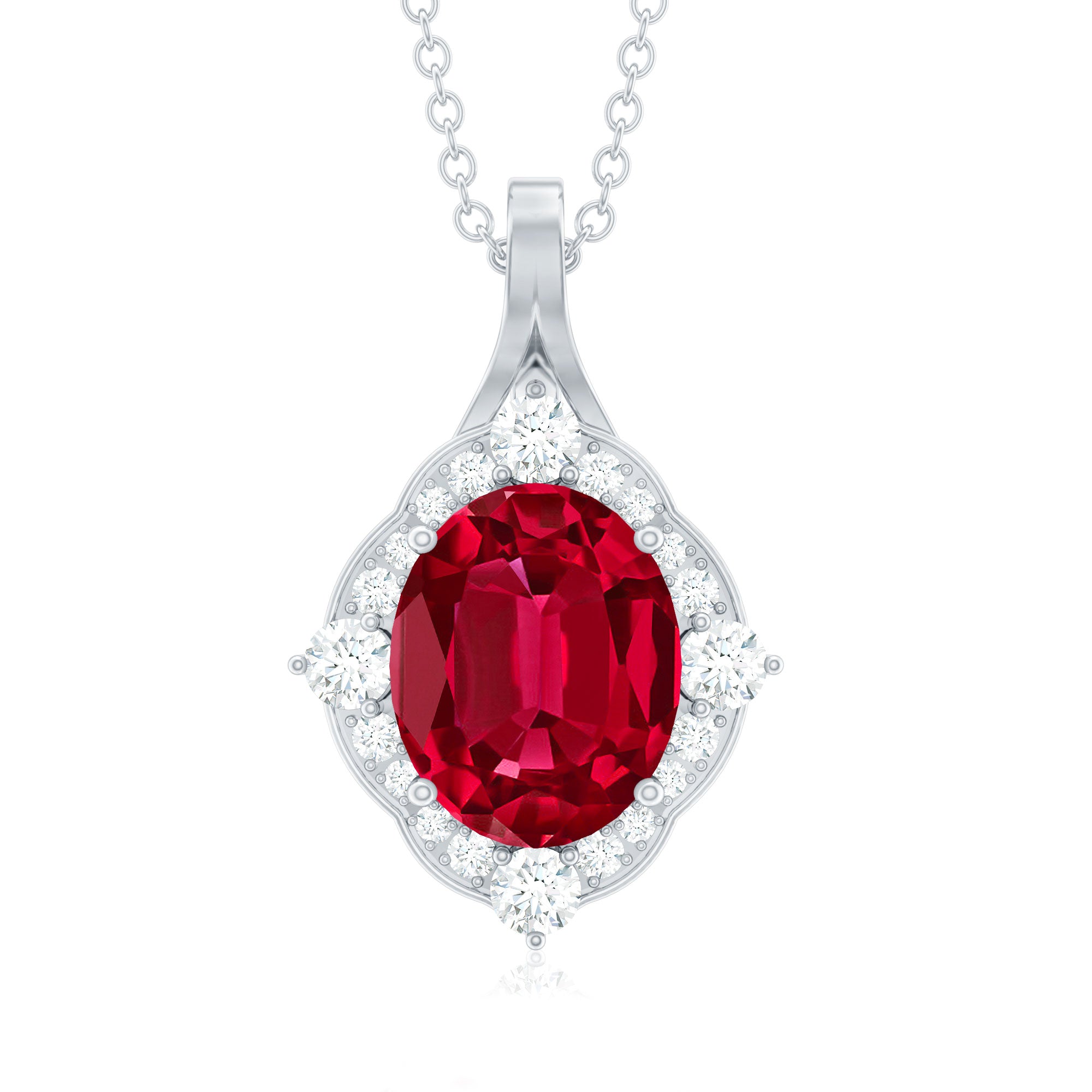 Vintage Inspired Oval Created Ruby and Diamond Halo Pendant