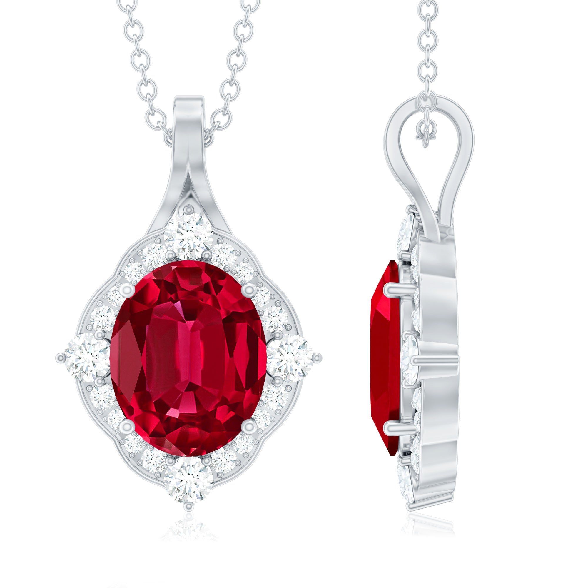 Experience the allure of the Scintillating Diamond Halo Pendant, where a graceful halo surrounds an oval Created Ruby, commanding attention and admiration. Additional round Diamond stones enhance the glamorous allure of the Created Ruby. Held securely by prongs, this pendant forms a captivating and enchanting ensemble, transporting you to a world of elegance and sophistication.