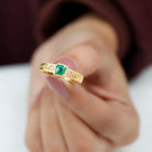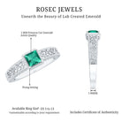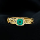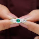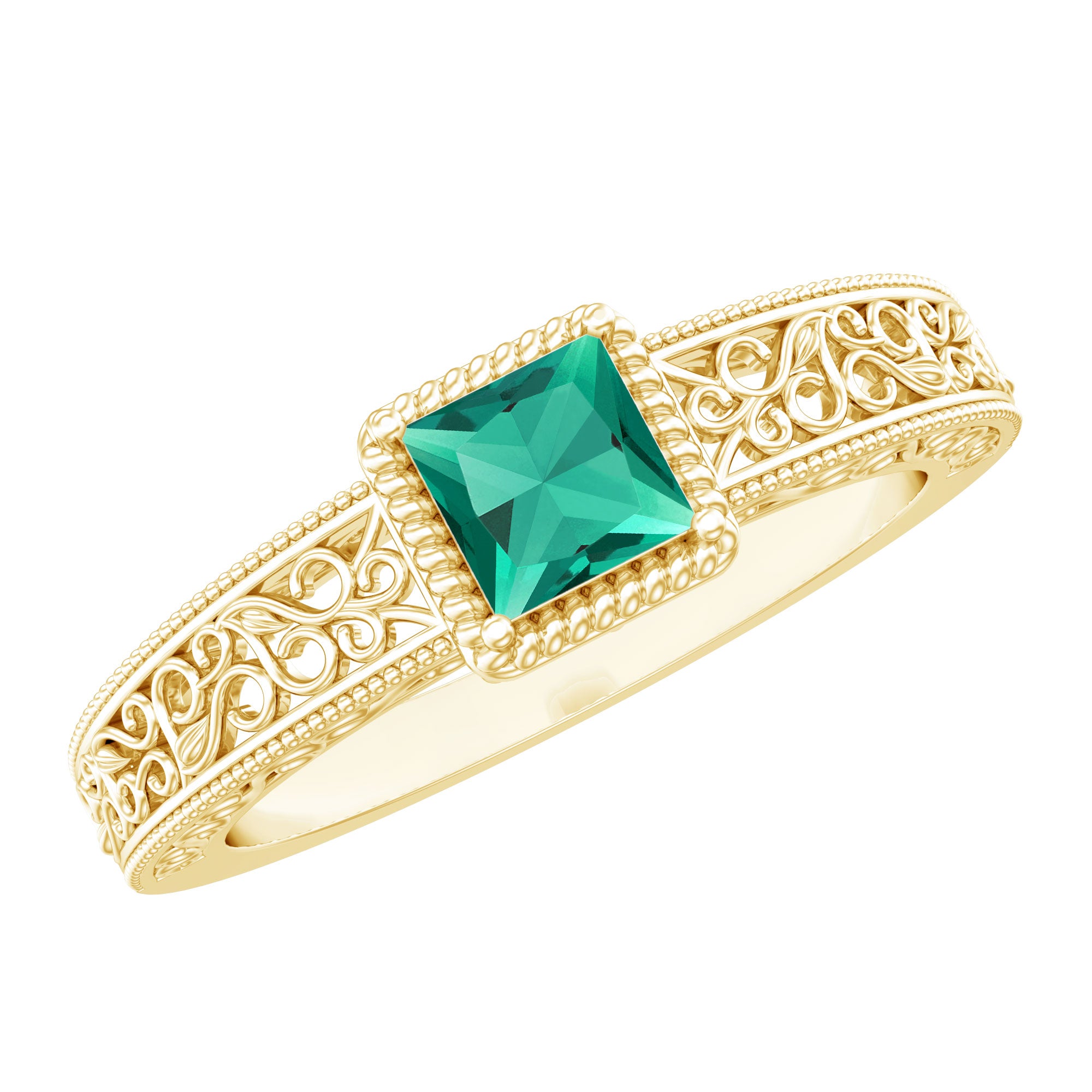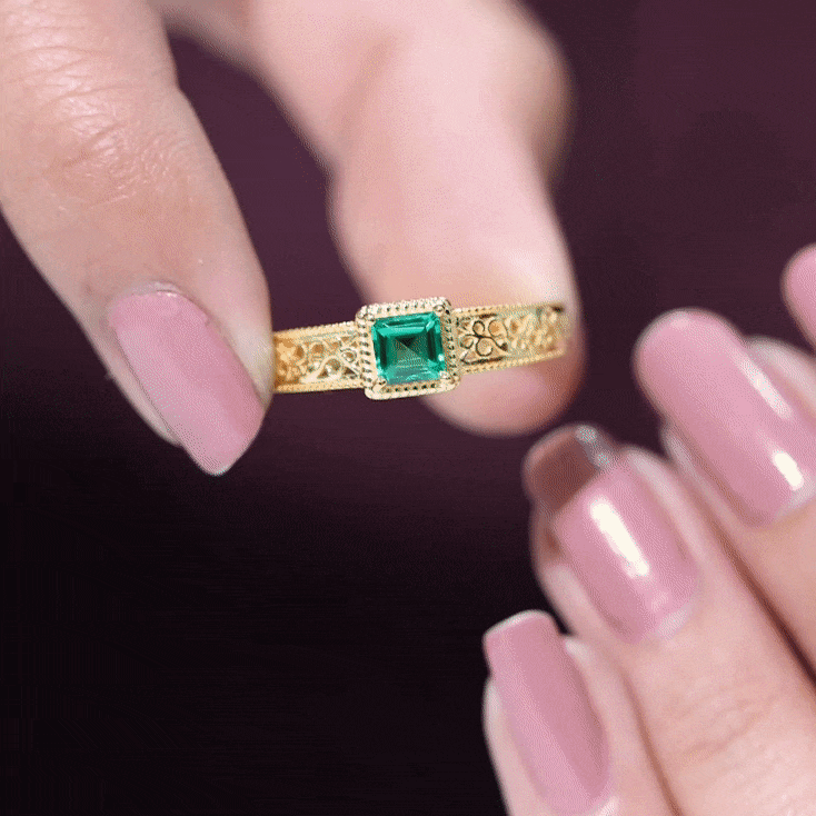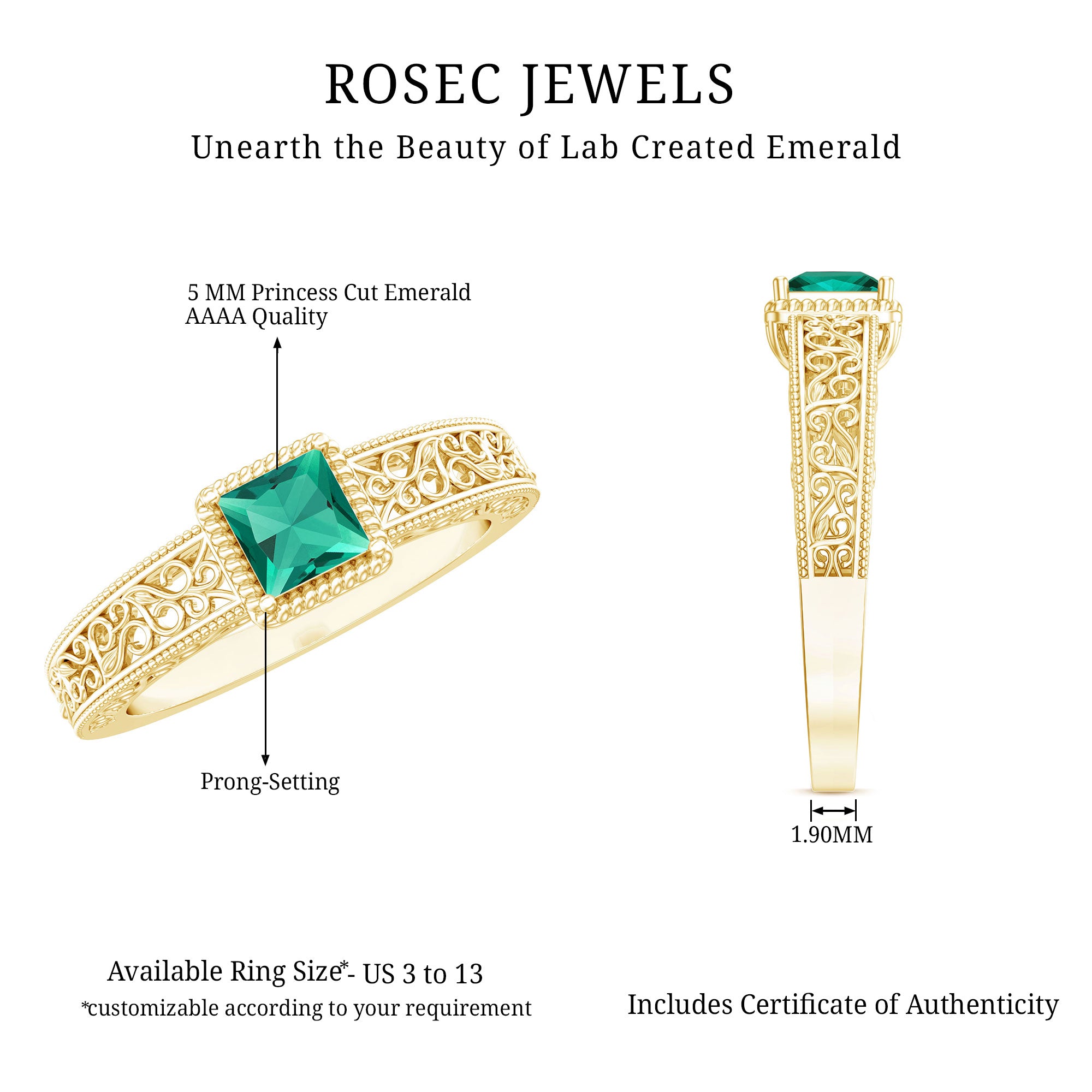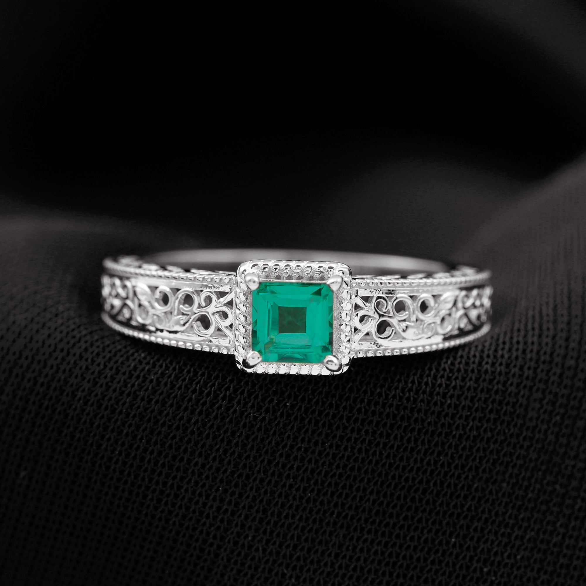Vintage Inspired Princess Cut Lab Grown Emerald Promise Ring with Filigree Details