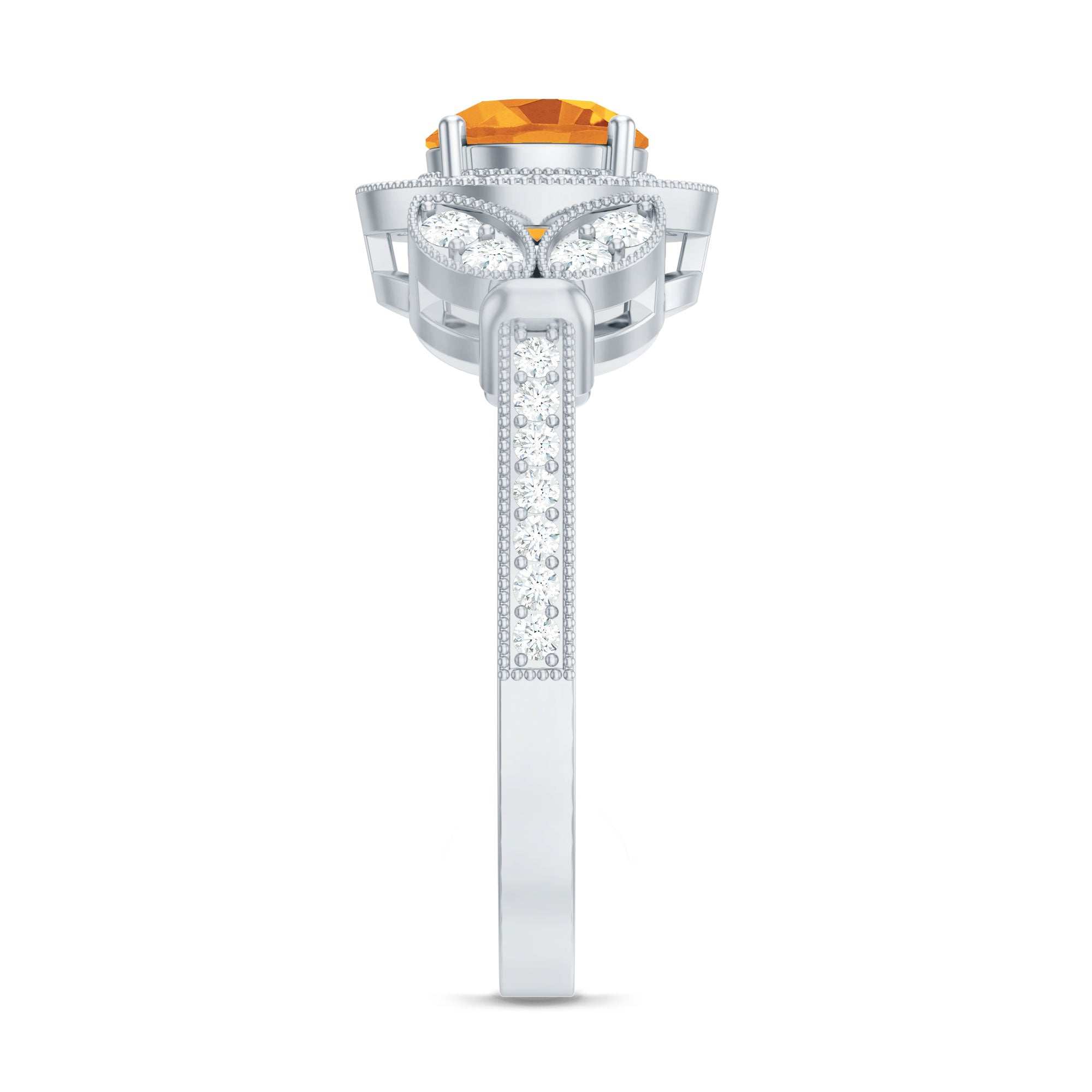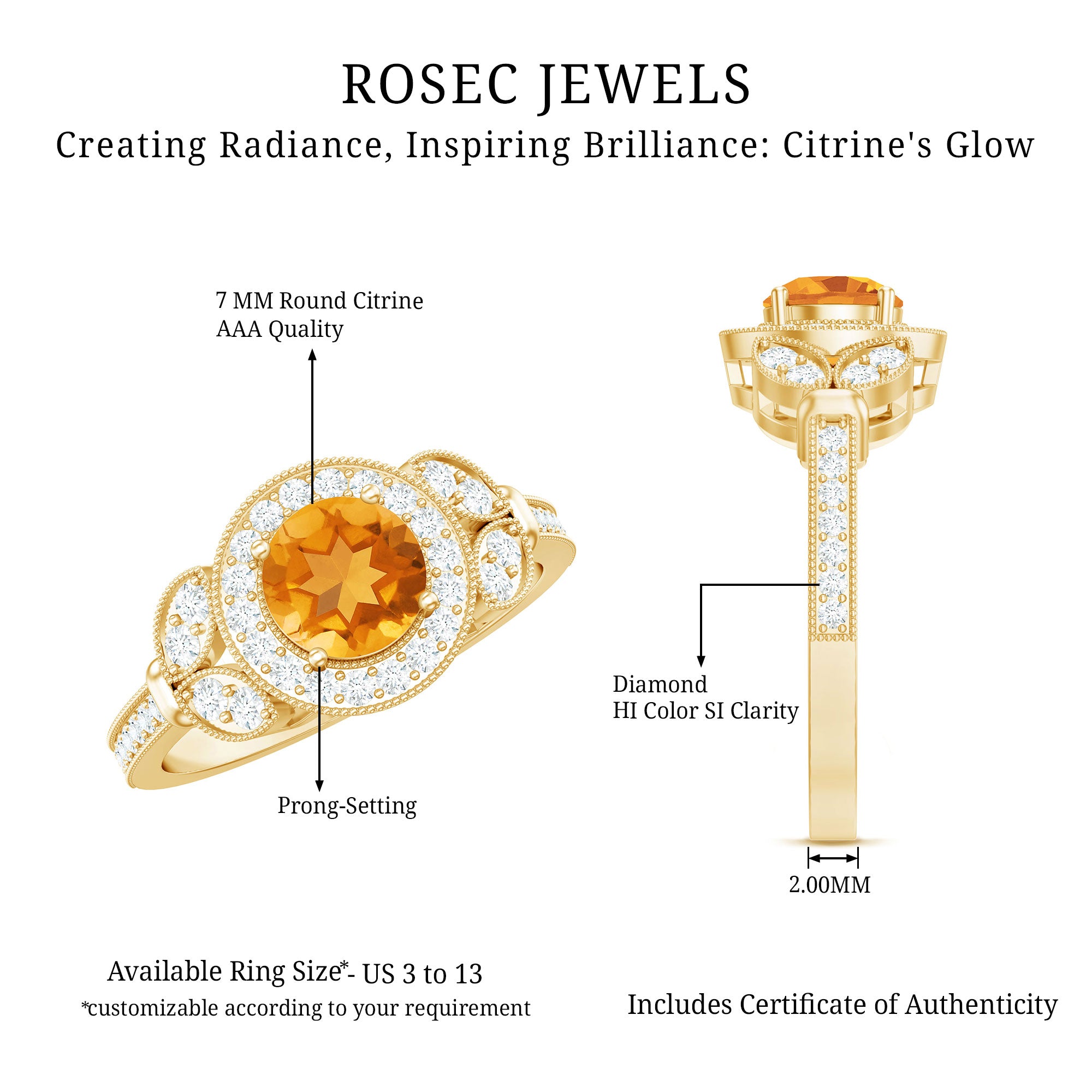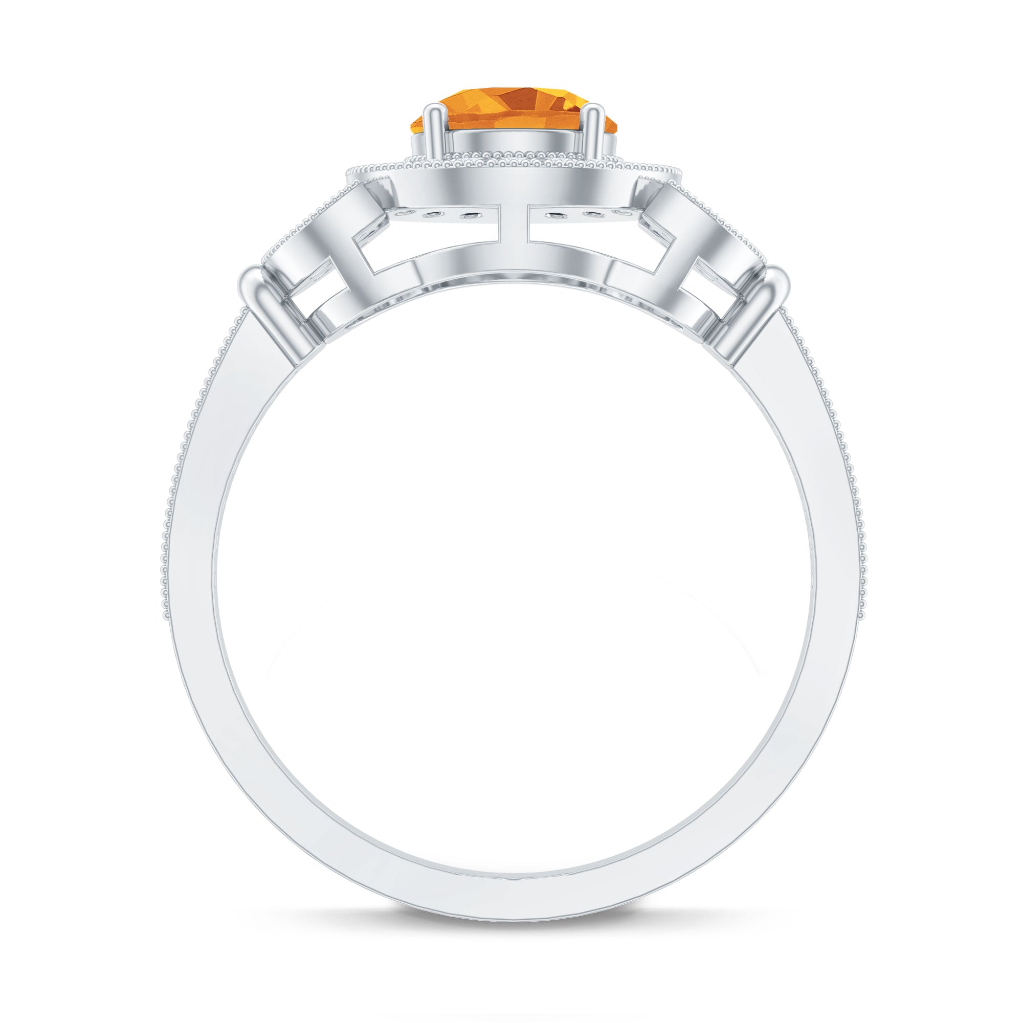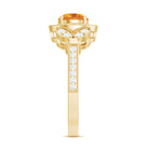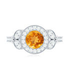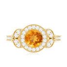 Prepare for a memorable evening with this classic engagement ring. A round citrine solitaire is set in a prong setting, surrounded by a halo and side stones of Diamond. The ring is finished with beaded details and crafted in solid gold, making it a timeless symbol of your love.