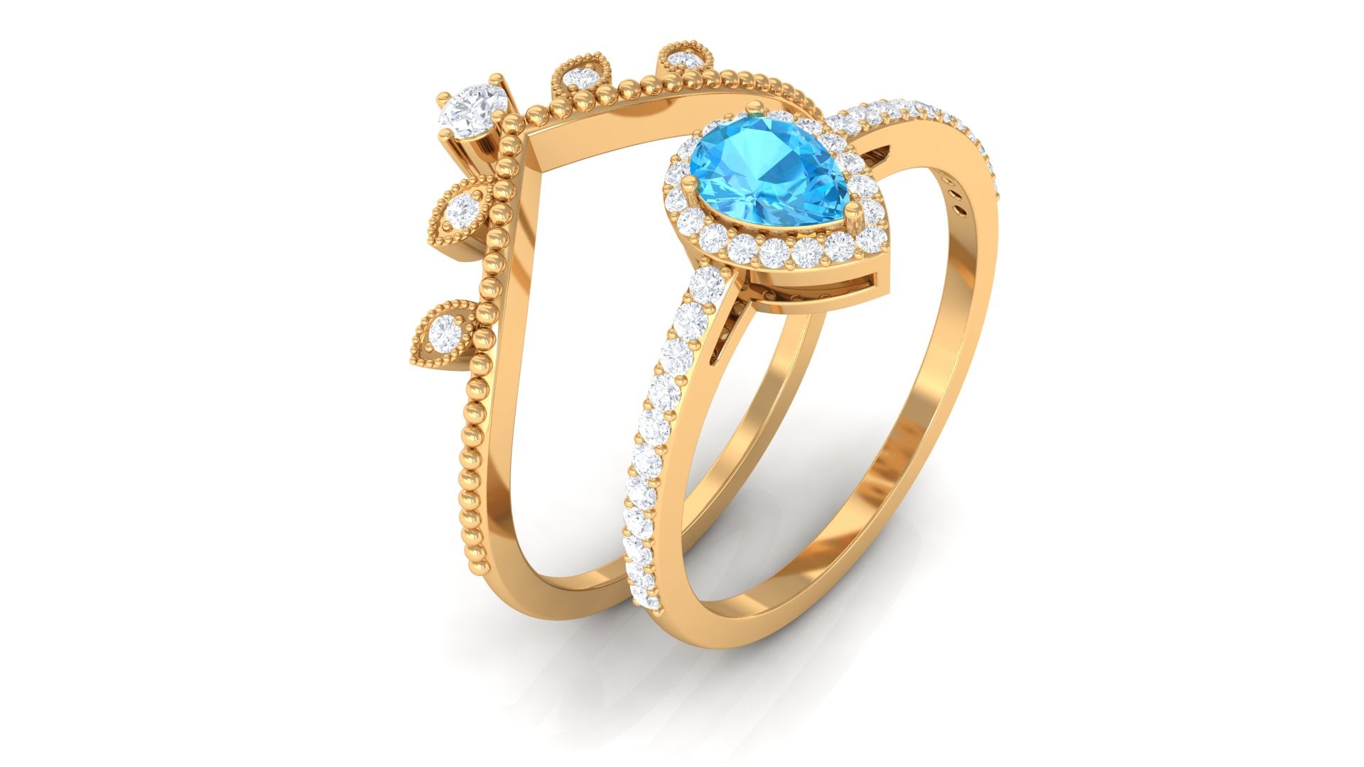 Leave her in awe with your impeccable choice of this exquisite ring set. The bridal set features a 5X7 mm pear-cut Swiss Blue Topaz, delicately held in a prong setting. The ring set is enhanced by a halo of round, gleaming Diamond stones that encircle the Swiss Blue Topaz, adding a captivating sparkle. The chevron band, adorned with more radiant Diamond stones, beautifully complements the centerpiece. Present her with this remarkable ring set and watch her marvel at its exquisite craftsmanship and timeless elegance.