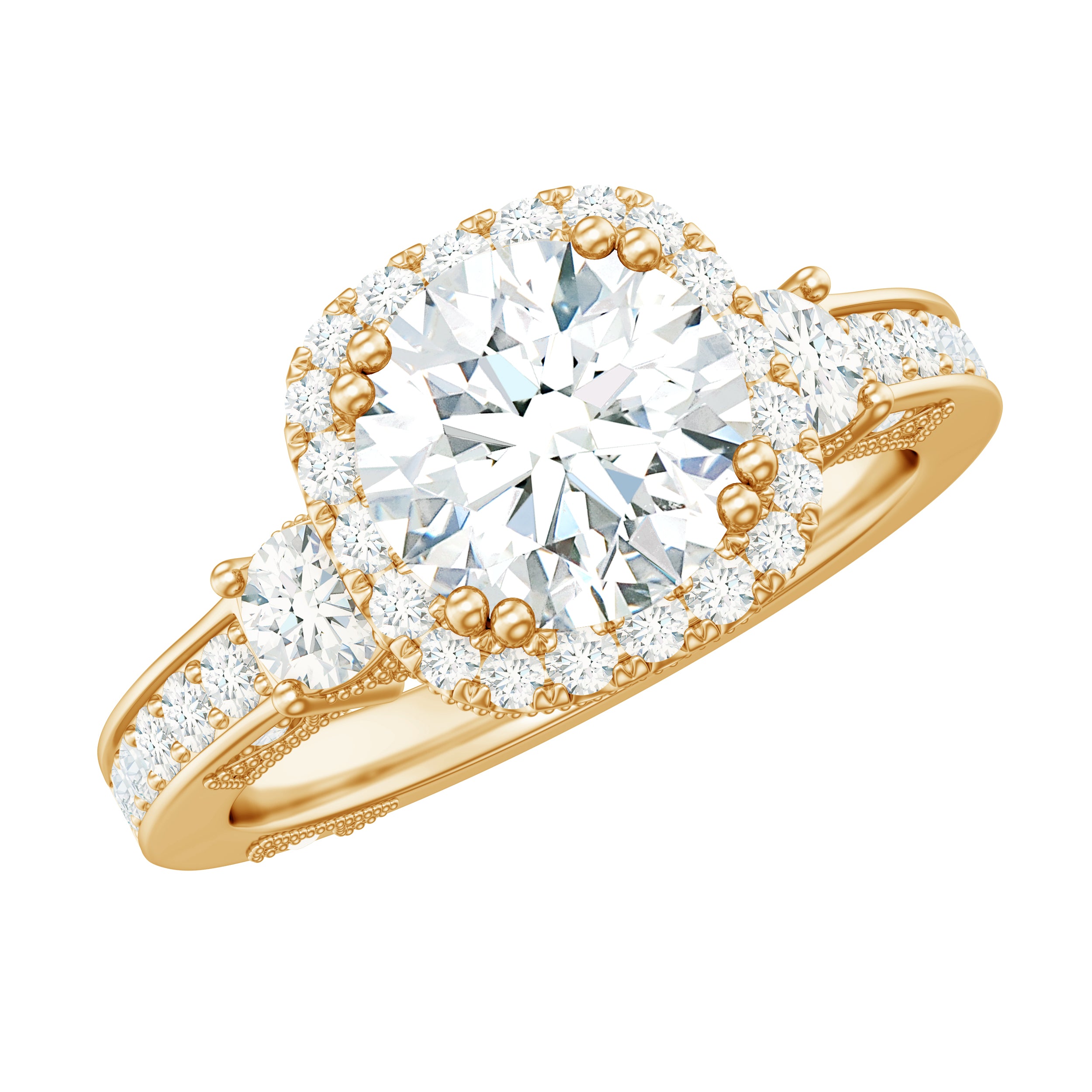 Accentuate your look with this Vintage Zircon Engagement Ring and grab all the attention at the party. The Round Zircon is held in prong setting beautifully exhibiting an effortless charm and the little round cubic zirconia arranged as halo and side stones. The Beaded Gold details are augmenting an opulent appeal of this Simulated Diamond Ring.