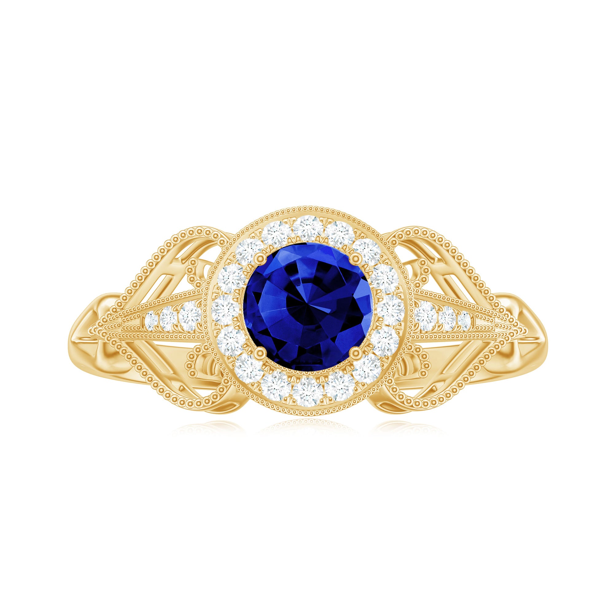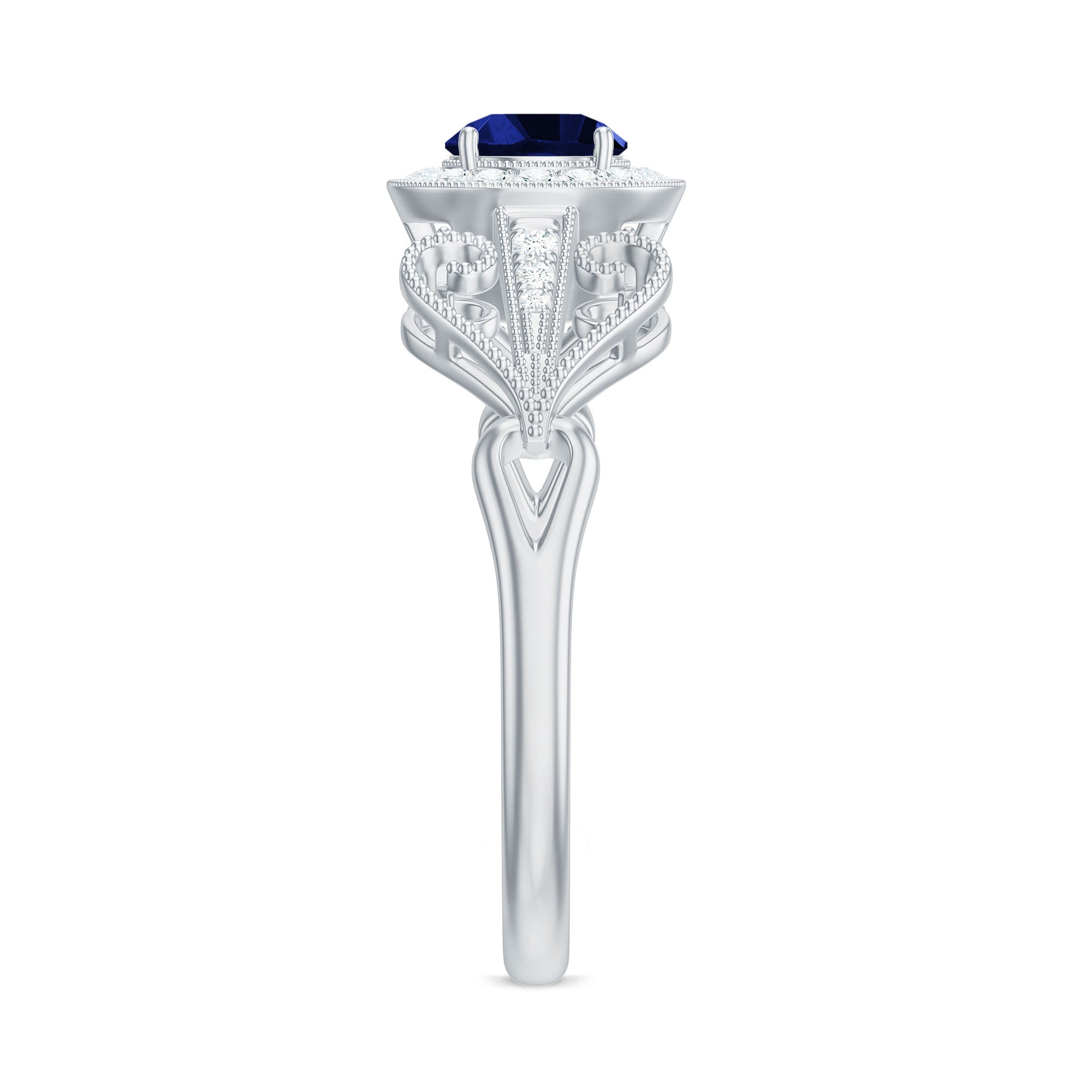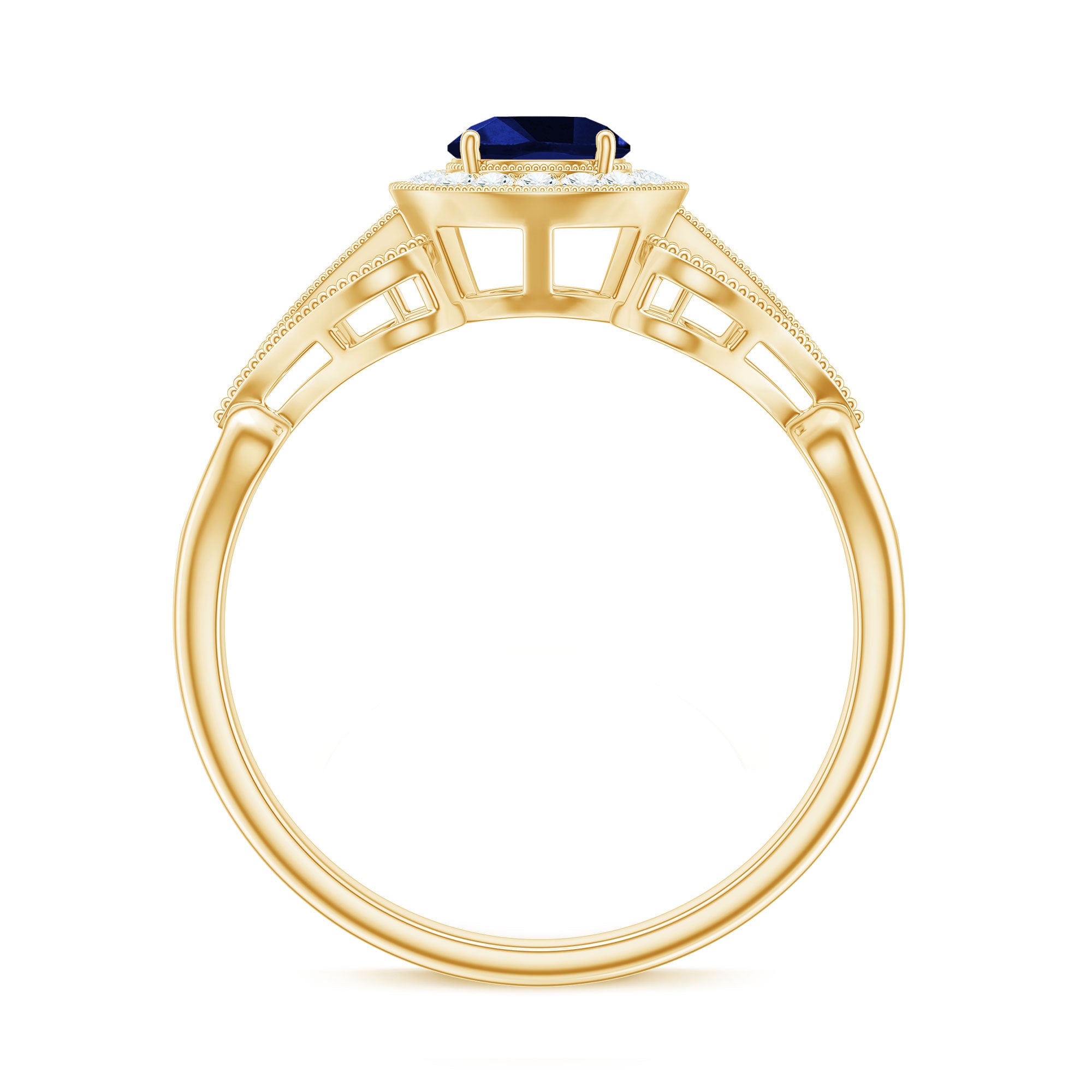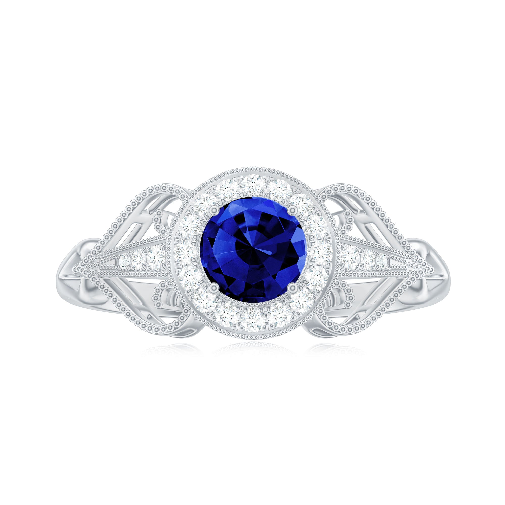 The brightness of Created Blue Sapphire makes this vintage ring more appealing. The Created Blue Sapphire Engagement Ring is embellished with Round Diamond Accent, glistening on the shank beautifully. The Created Blue Sapphire Diamond Engagement Ring is accentuated with Beaded Gold, making your significant feel more precious with this Created Blue Sapphire Gold Ring.