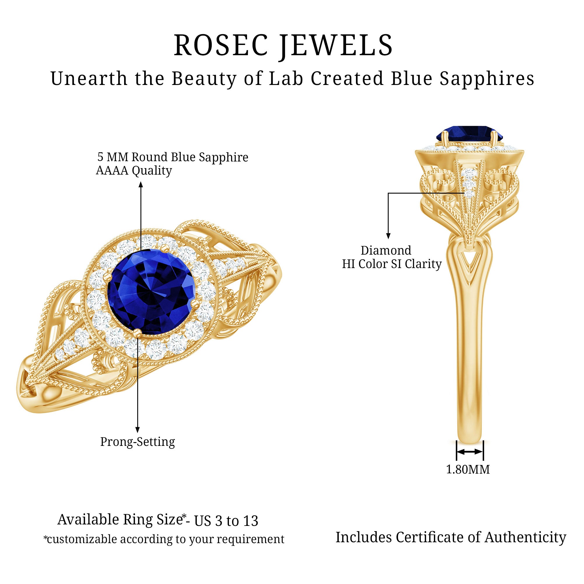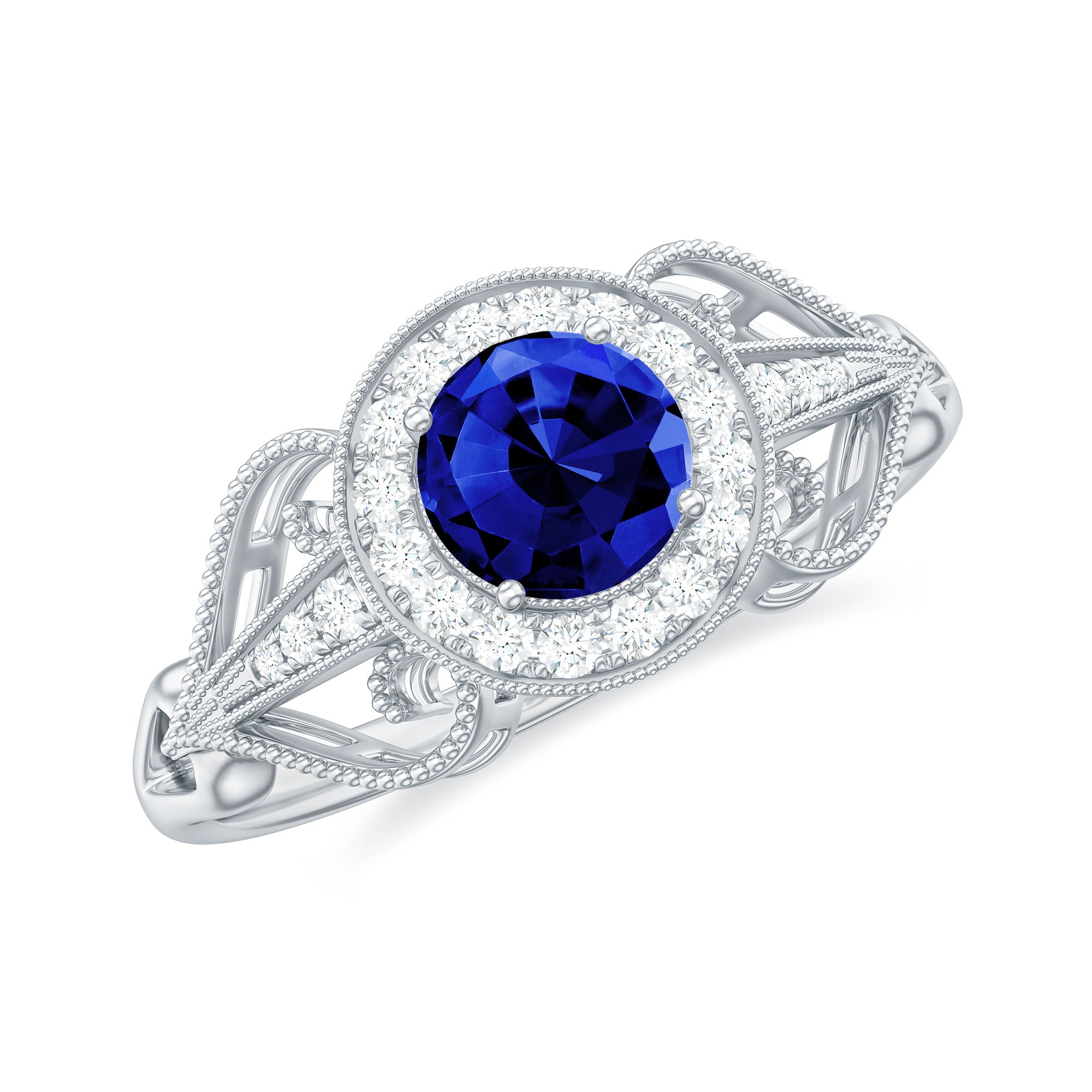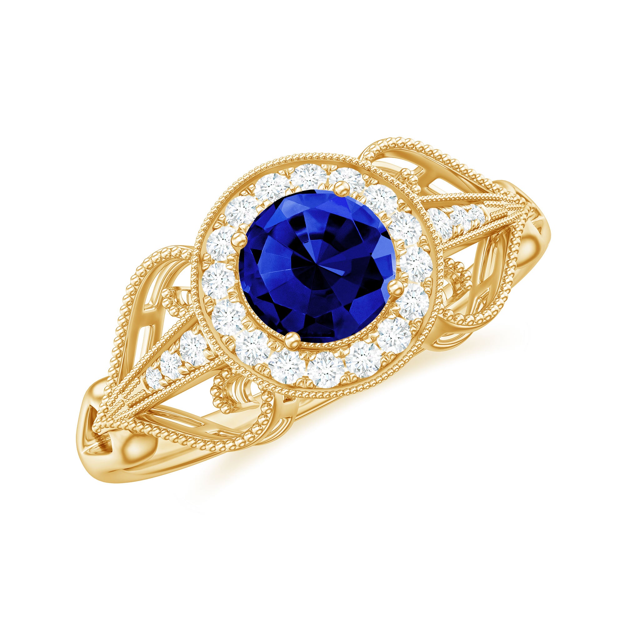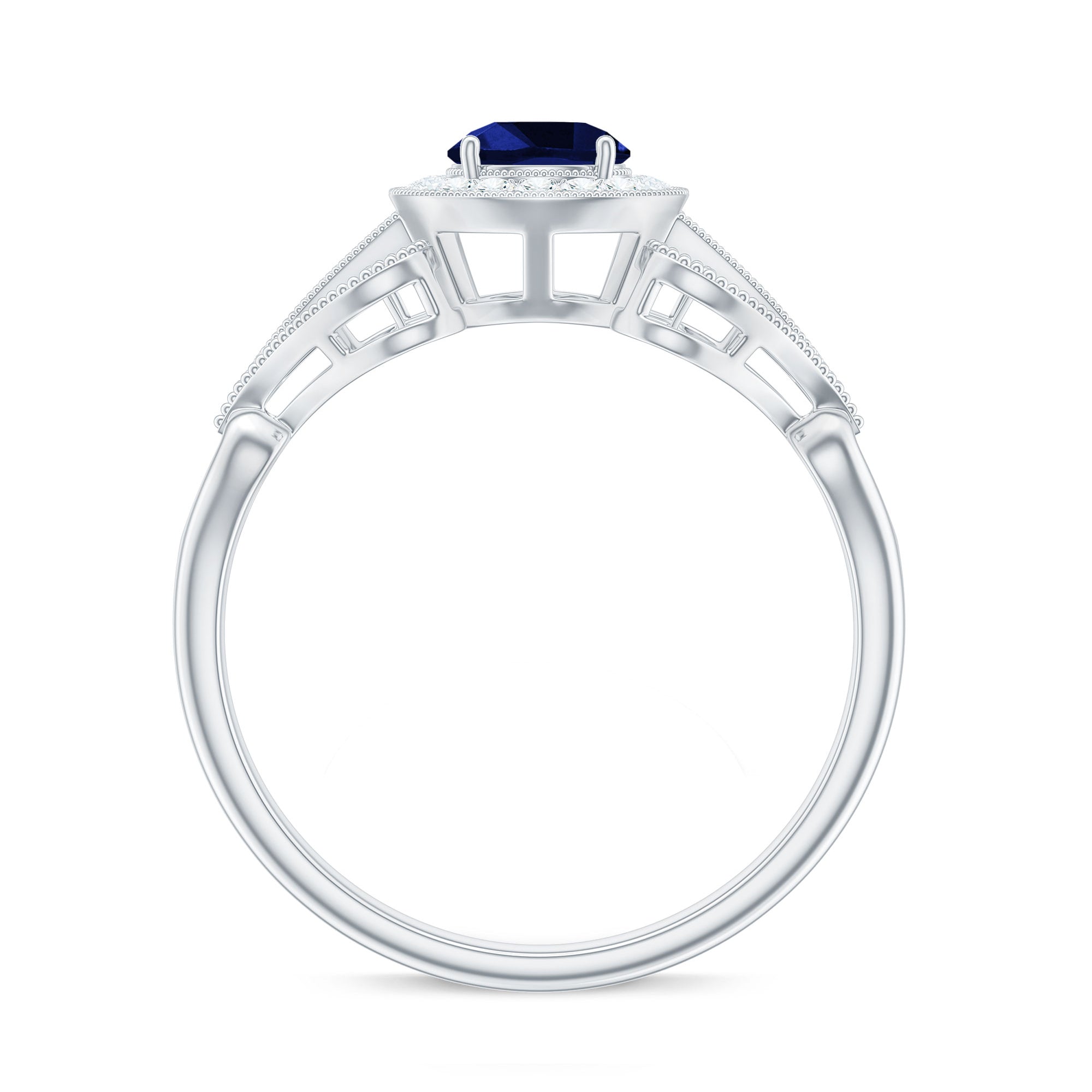 The brightness of Created Blue Sapphire makes this vintage ring more appealing. The Created Blue Sapphire Engagement Ring is embellished with Round Diamond Accent, glistening on the shank beautifully. The Created Blue Sapphire Diamond Engagement Ring is accentuated with Beaded Gold, making your significant feel more precious with this Created Blue Sapphire Gold Ring.