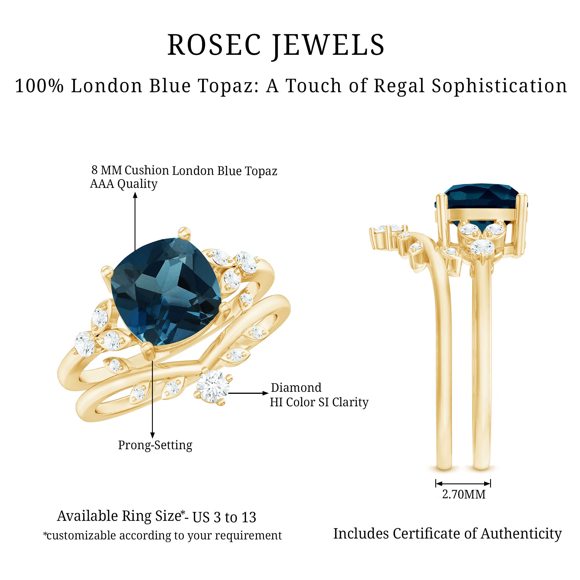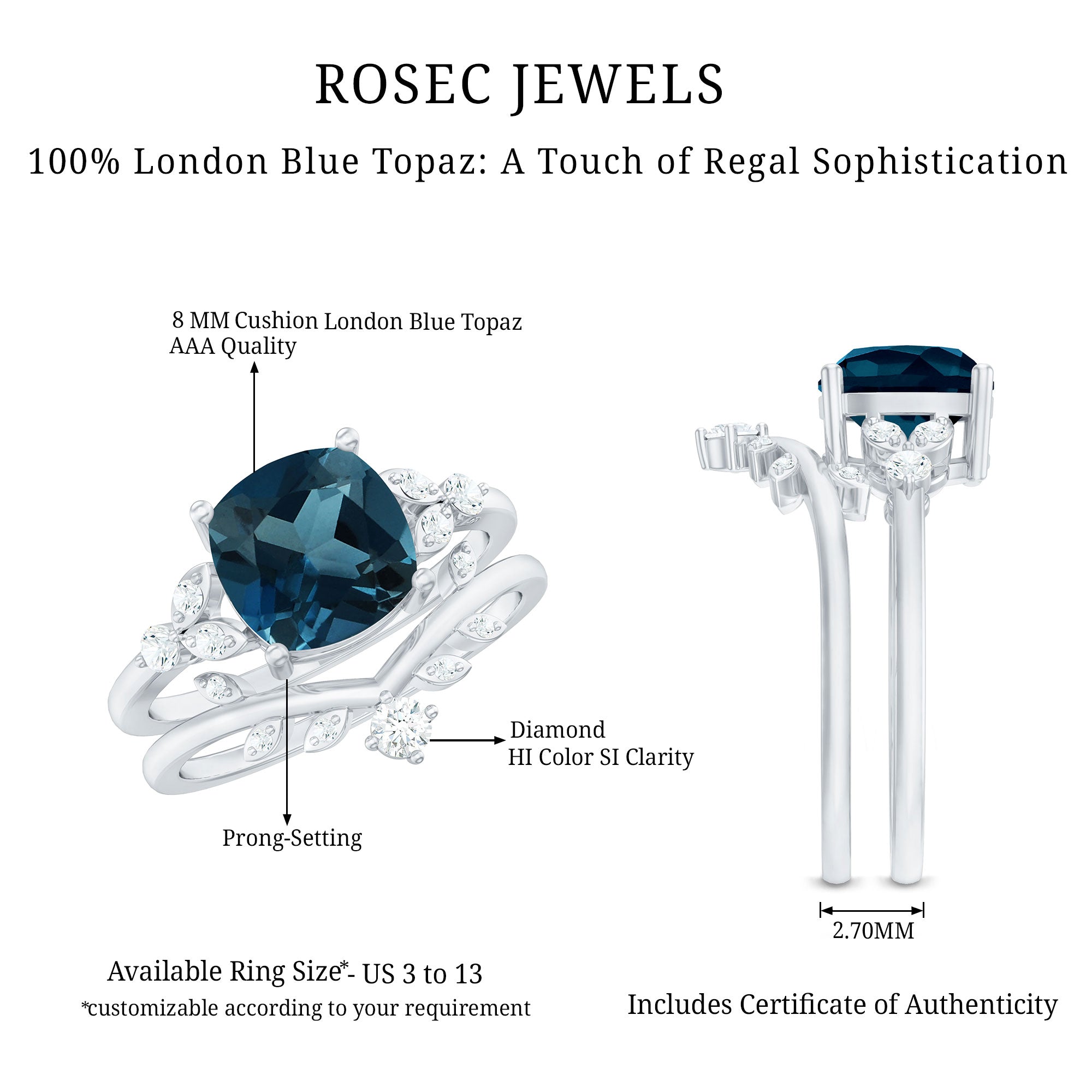 This London Blue Topaz Ring Set is crafted to enhance beauty, brilliance, and elegance during one of the most significant moments in your life. The set comprises an engagement ring and a complementary curved band, designed to fit together flawlessly. At the center of the engagement ring is a breathtaking 8 MM Cushion cut London Blue Topaz, securely held in a prong setting. Encircling the central stone is a floral-inspired arrangement of round Diamond stones on both sides, which adds a delicate touch to the striking center. The accompanying curved ring is both simple and sophisticated. It showcases a series of round diamond stones that gently curve to align with the engagement ring. Whether worn together or individually, both rings present a polished and timeless look. This Blue Topaz Wedding Ring Set is ideal for a bride seeking a classic design with an added touch of sparkle. Whether you are making a proposal or celebrating a special occasion, this Cushion Cut Engagement Ring with Wedding Band encapsulates the moment with grace and thoughtfulness.