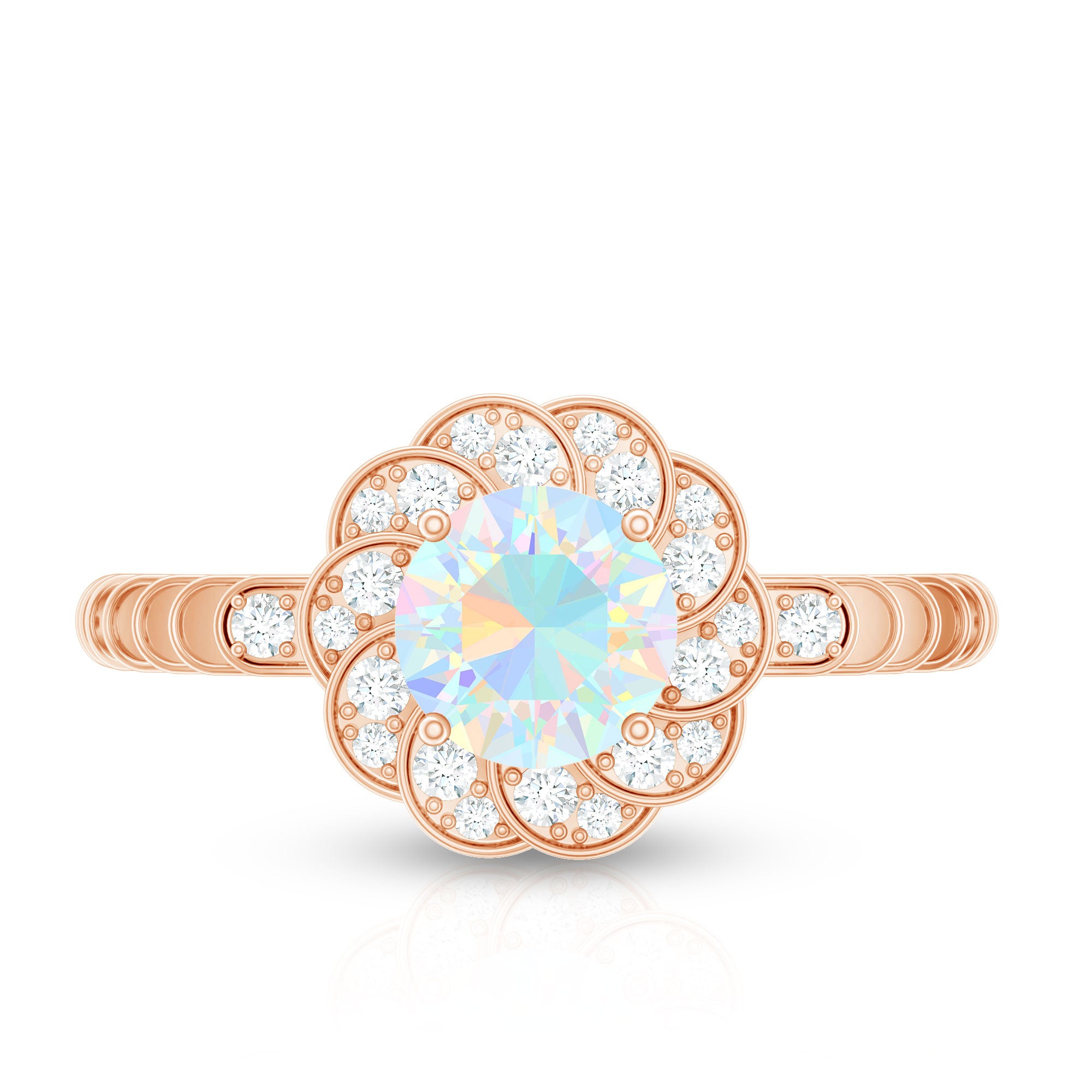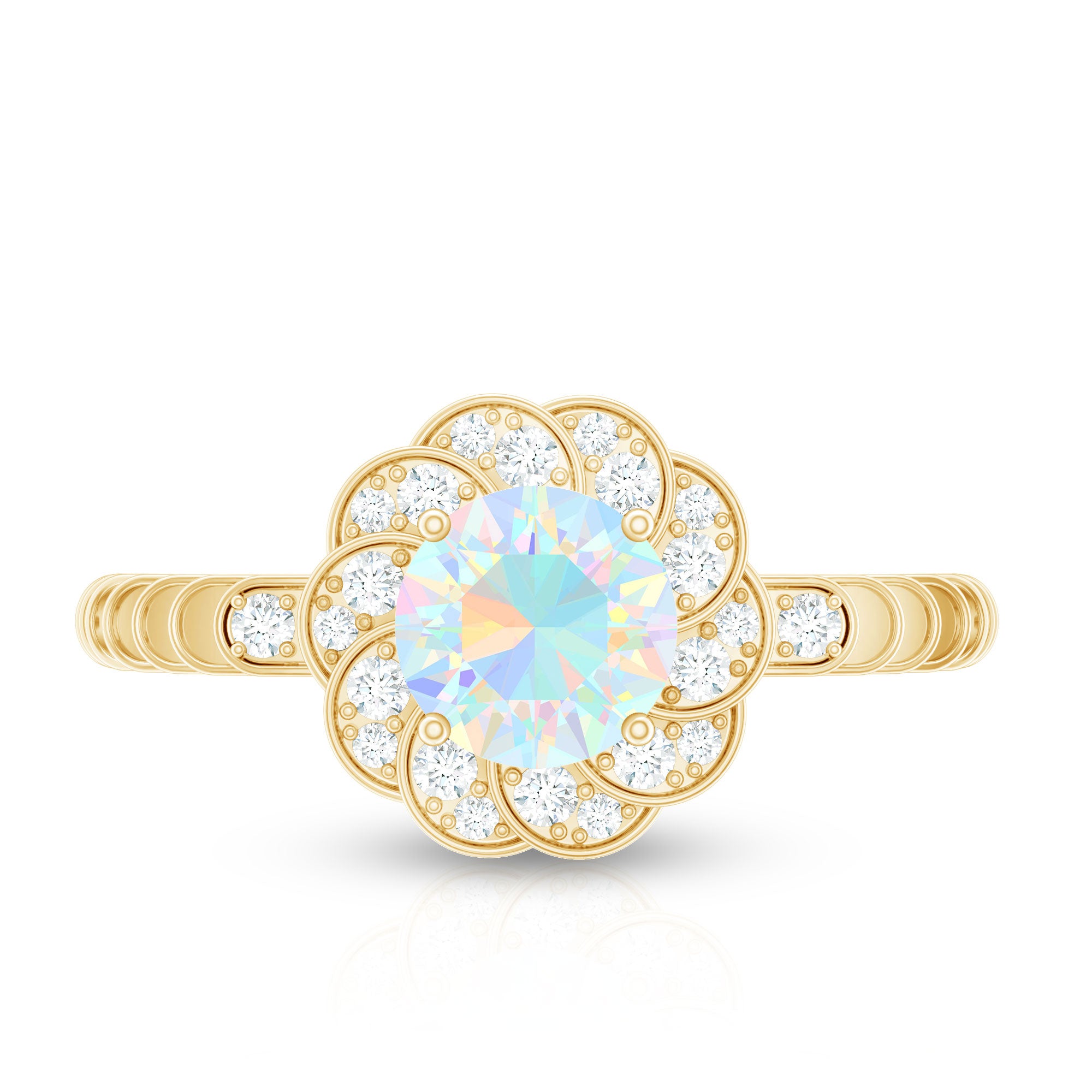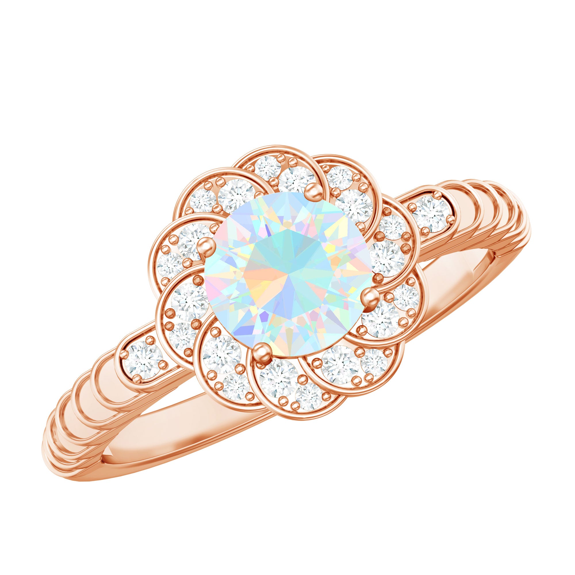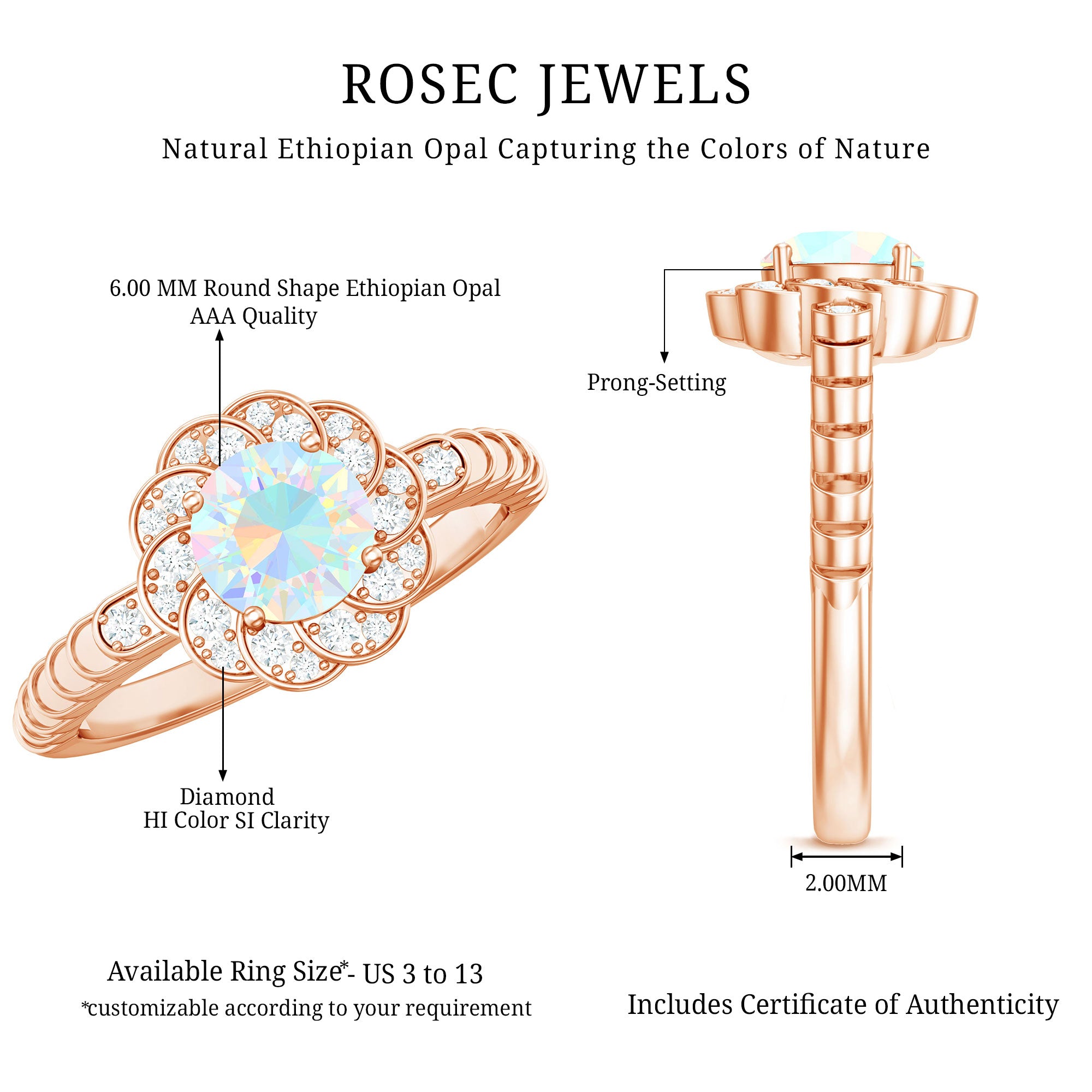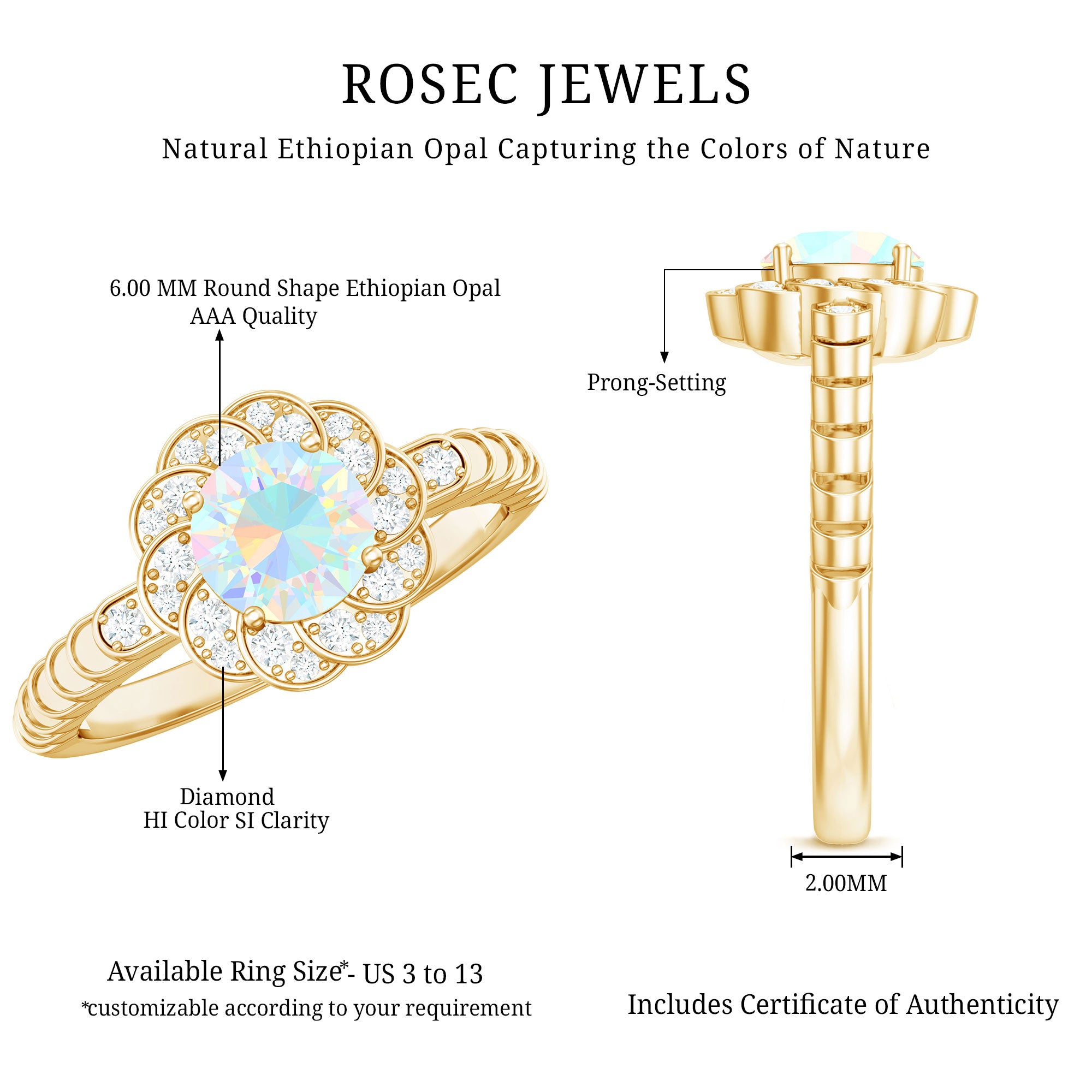 Turn heads and capture hearts with this Flower Engagement Ring, a romantic design that blends old-world charm with a touch of mystical allure. At the center of the flower motif rests a glowing 6 mm Round Shape Ethiopian Opal set in Prong Setting, known for hues of the rainbow that seem to dance in the light. Surrounding the Opal, delicate petals sparkle with Diamond stones, creating a flower in full bloom, symbolizing love that grows deeper with time. The band features a distinctive Vintage Style design, full of graceful curves that elevate its timeless appeal. Whether chosen for an engagement or as a meaningful gift, this Opal and Diamond Engagement Ring is designed to leave a lasting impression. Available in various ring sizes and presented in a beautifully crafted jewelry box, this Vintage Looking Engagement Ring is ready to surprise and delight from the very first moment. If you are looking for something truly unique, soulful and filled with character, this Opal Flower Ring is the perfect way to say forever.