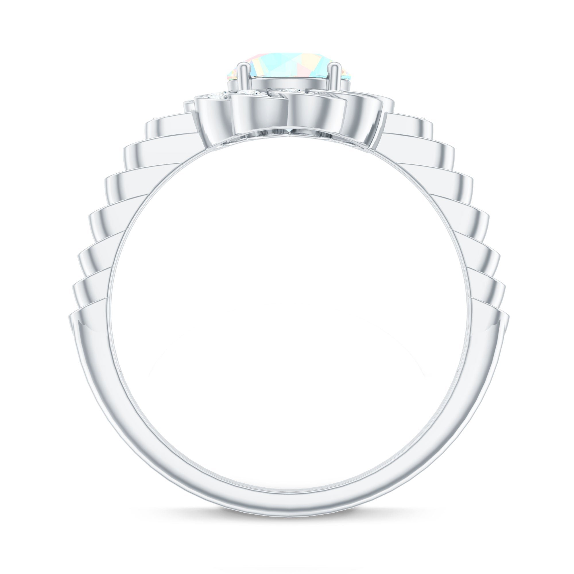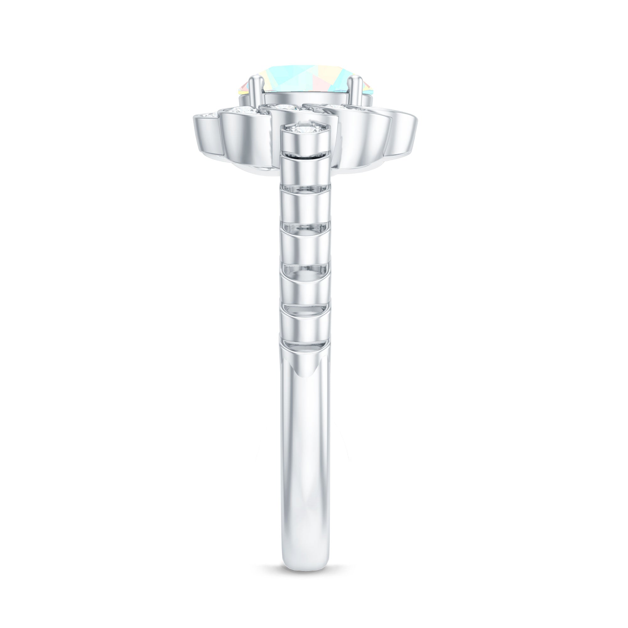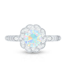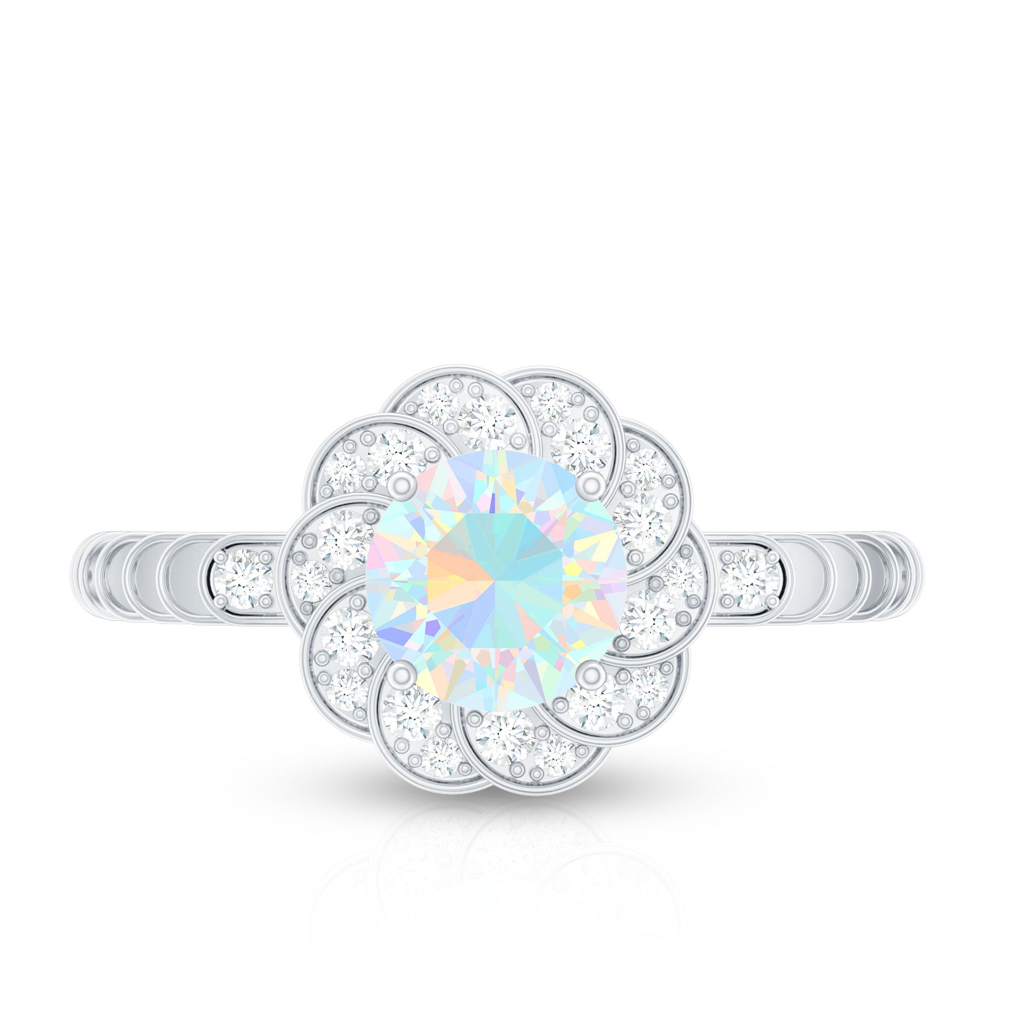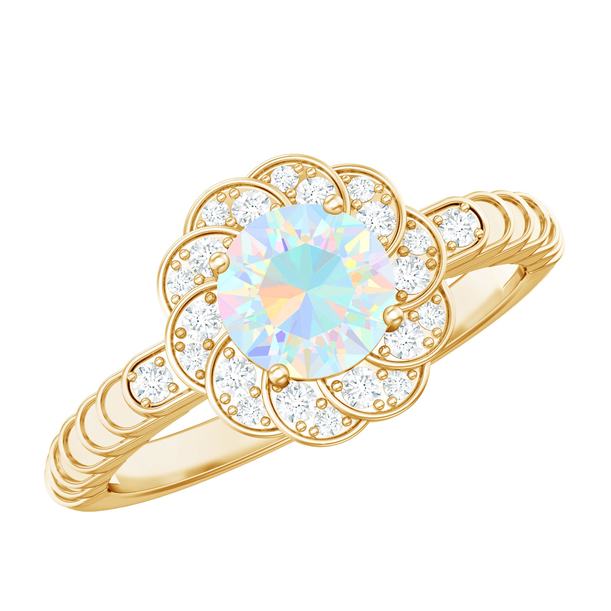 Turn heads and capture hearts with this Flower Engagement Ring, a romantic design that blends old-world charm with a touch of mystical allure. At the center of the flower motif rests a glowing 6 mm Round Shape Ethiopian Opal set in Prong Setting, known for hues of the rainbow that seem to dance in the light. Surrounding the Opal, delicate petals sparkle with Diamond stones, creating a flower in full bloom, symbolizing love that grows deeper with time. The band features a distinctive Vintage Style design, full of graceful curves that elevate its timeless appeal. Whether chosen for an engagement or as a meaningful gift, this Opal and Diamond Engagement Ring is designed to leave a lasting impression. Available in various ring sizes and presented in a beautifully crafted jewelry box, this Vintage Looking Engagement Ring is ready to surprise and delight from the very first moment. If you are looking for something truly unique, soulful and filled with character, this Opal Flower Ring is the perfect way to say forever.