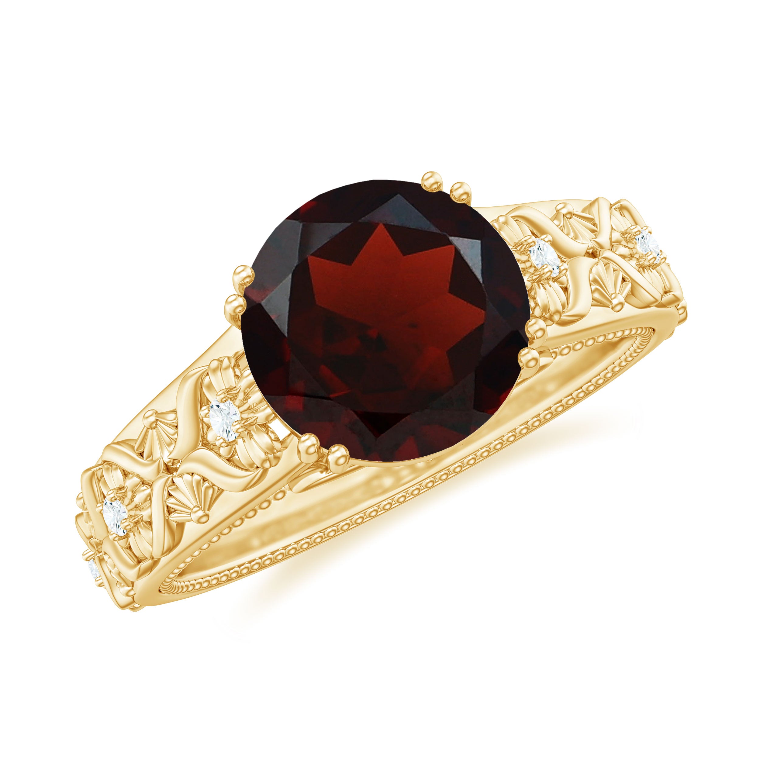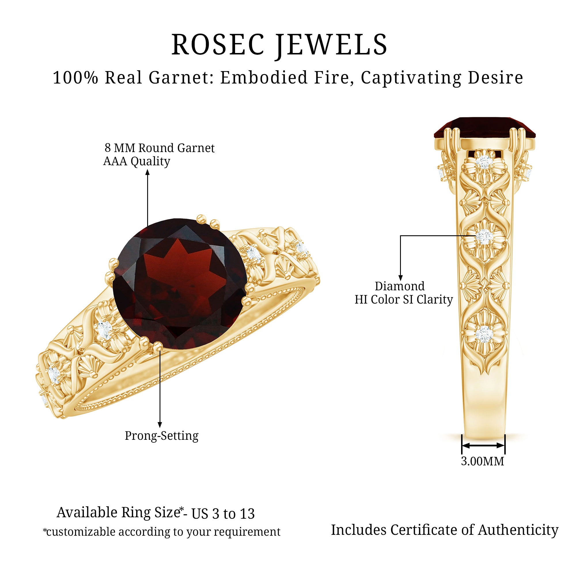 Capture attention with the enchanting beauty of this Vintage Looking Engagement Ring, a reminiscent of your timeless love story. At its center is an 8 mm Round Shape Garnet set in Double Prong Setting, rich in color and full of warmth, symbolizing passion, devotion and the promise of forever. The band is thoughtfully designed with nature inspired detailing, adding a graceful touch that makes this Garnet Diamond Ring feel truly one-of-a-kind. Dainty Diamond stones sparkle along the band, offering a soft shimmer that enhances the deep red glow of AAA Quality Garnet without overpowering its natural charm. Elegant yet full of shine, this Garnet Engagement Ring is perfect for someone who loves romance, history and the beauty of meaningful design. Presented in a signature jewelry box and available in various ring sizes, this Red Garnet Ring is a heartfelt expression of eternal love. Whether for an engagement, anniversary or a symbolic gesture of commitment, this vintage inspired treasure captures the essence of a bond meant to last a lifetime.