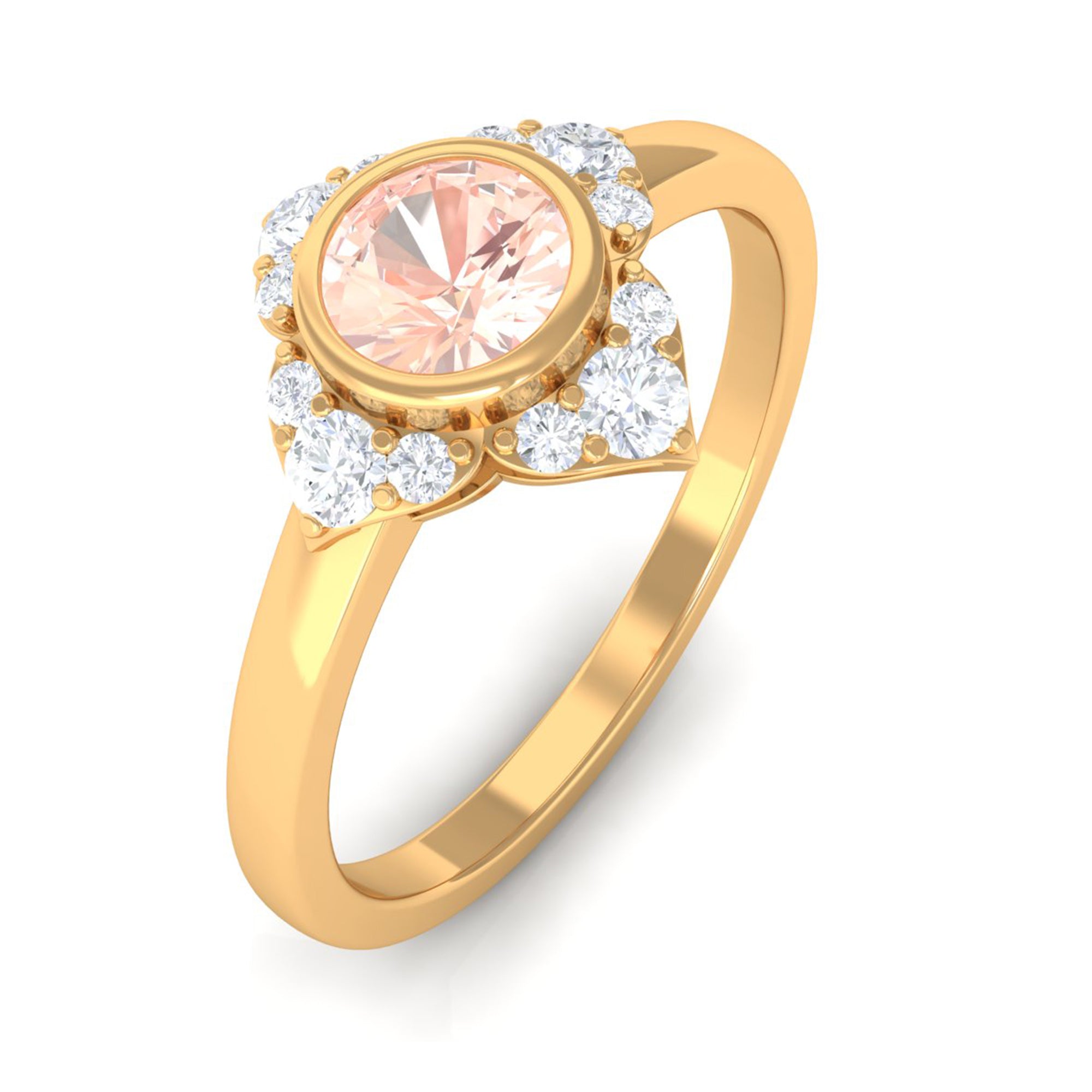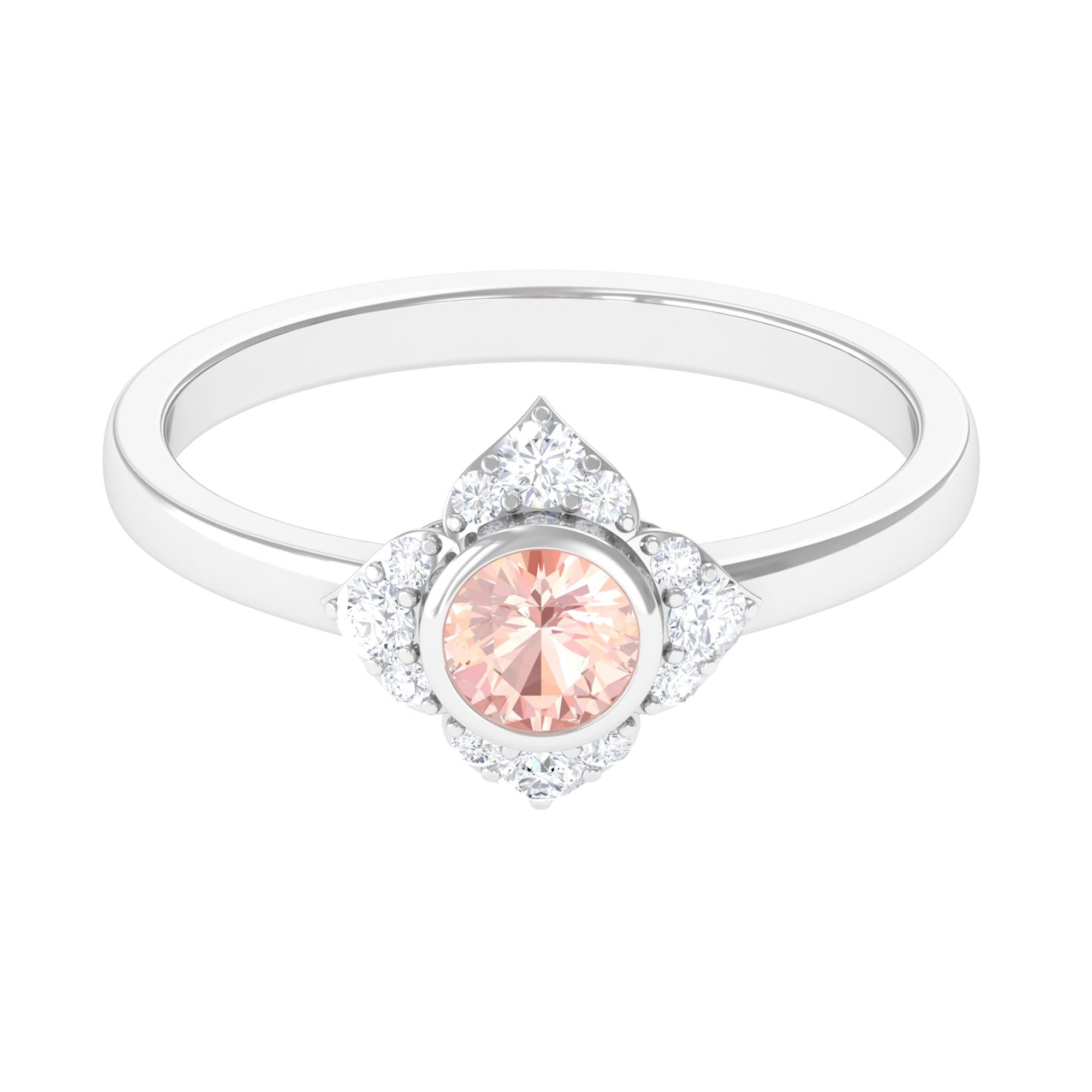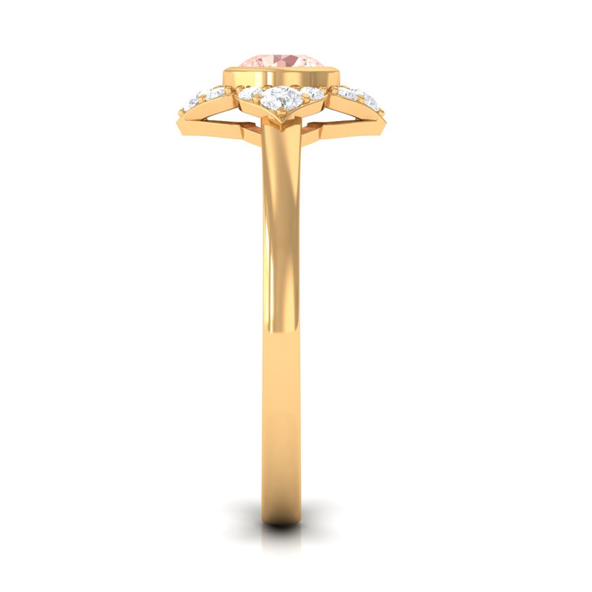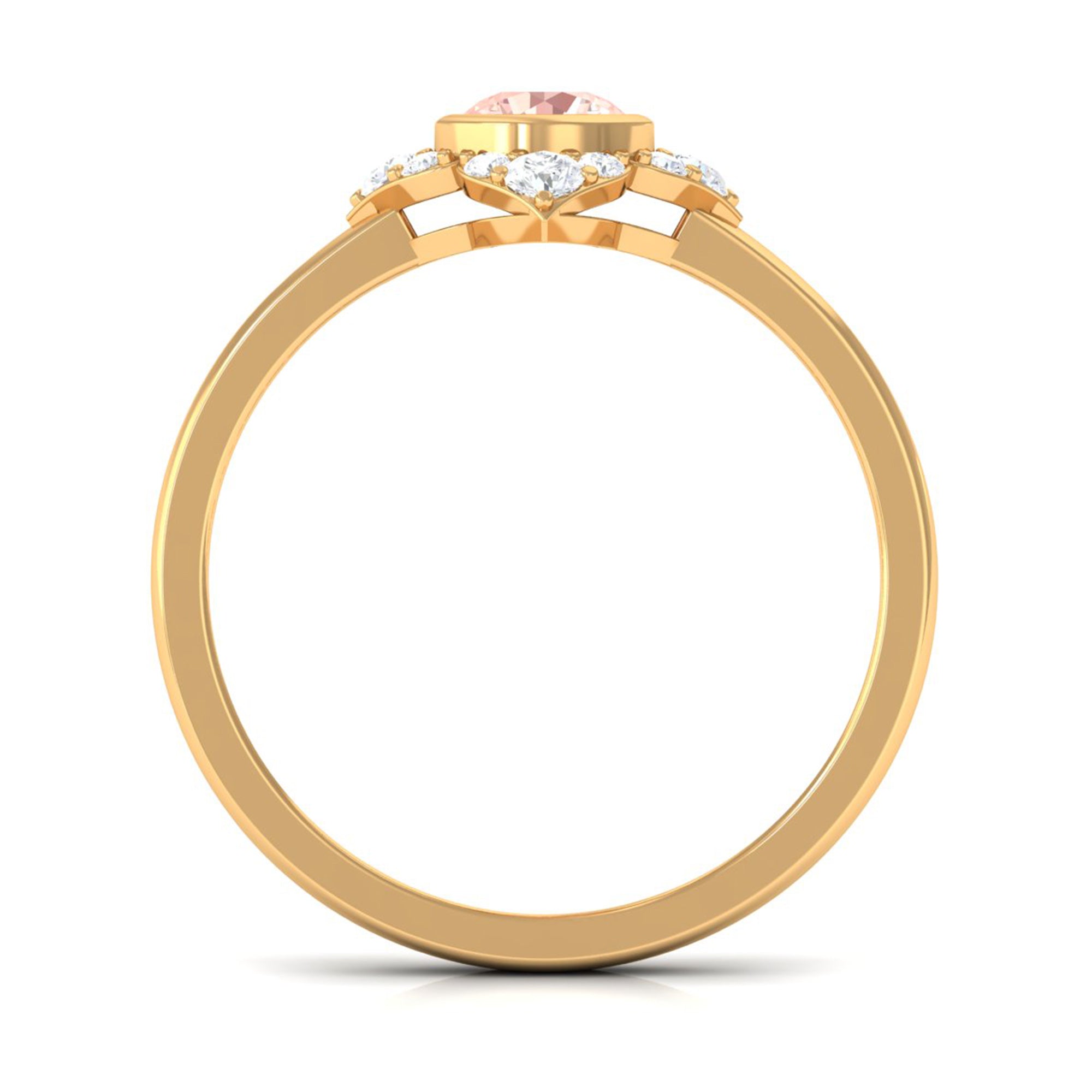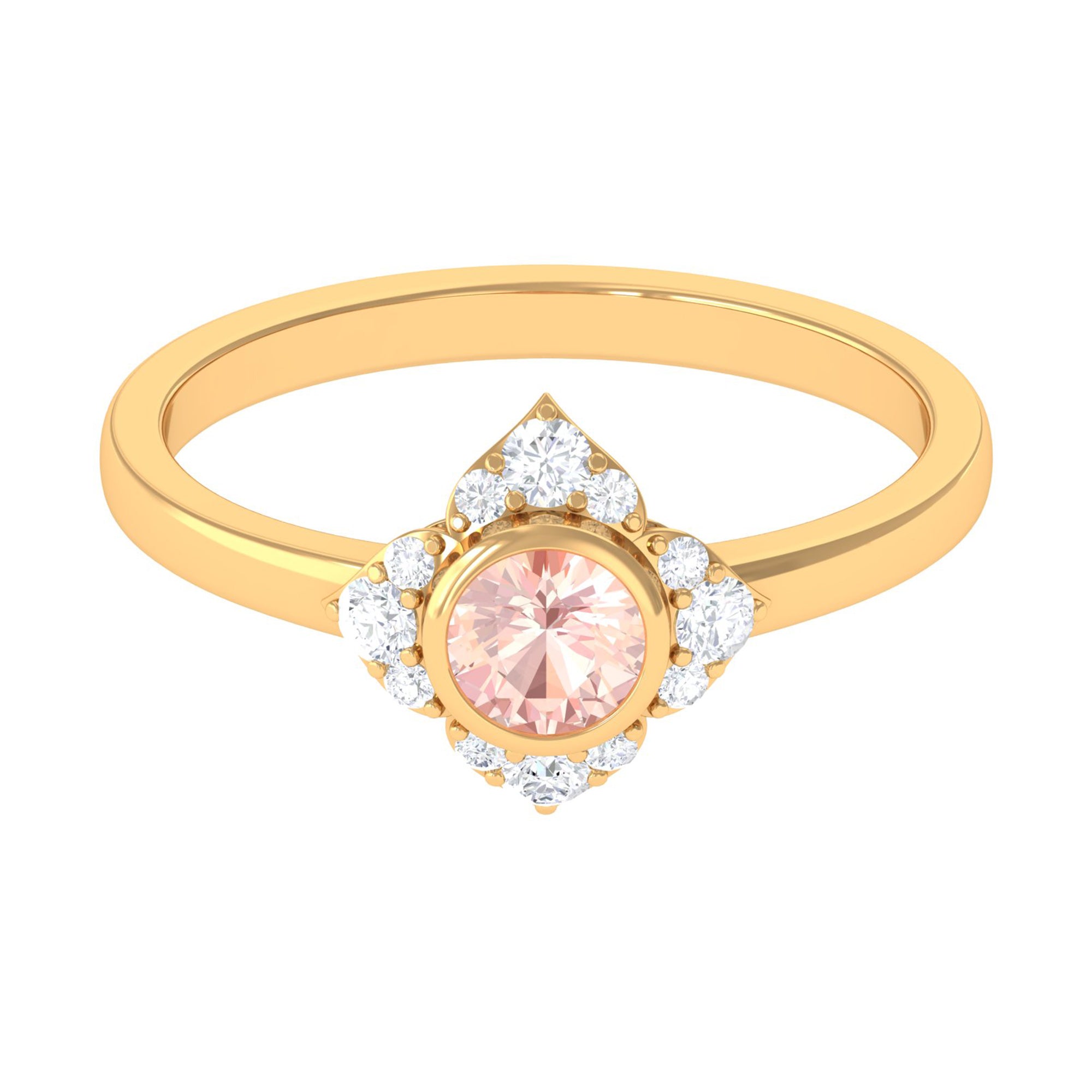Present this Vintage Inspired Engagement Ring to your lady love. This Floral Engagement Ring is embellished with Round Shape Morganite in the center in a bezel setting with Round Shape Diamond Accent. This Morganite and Diamond Ring is crafted in gold metal.