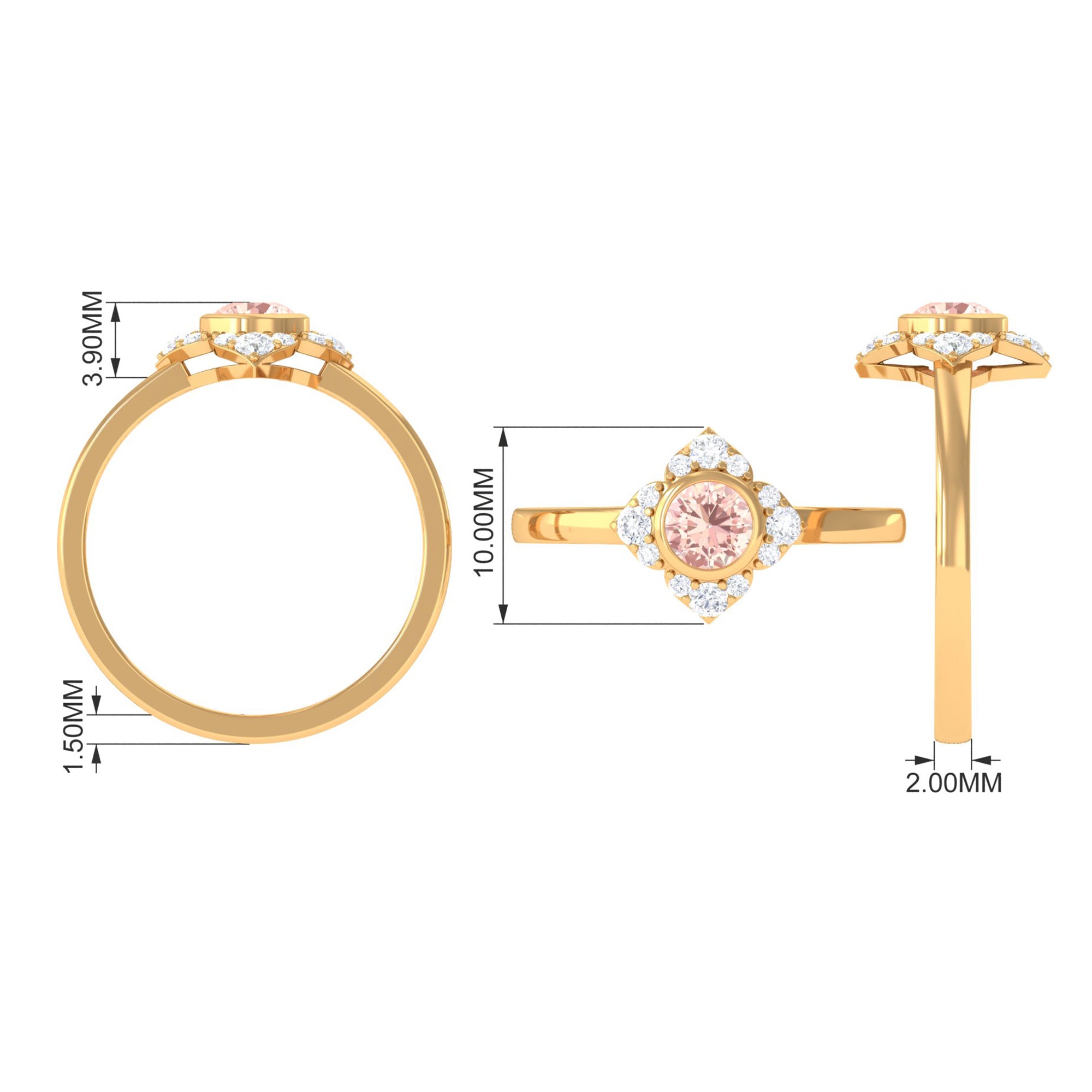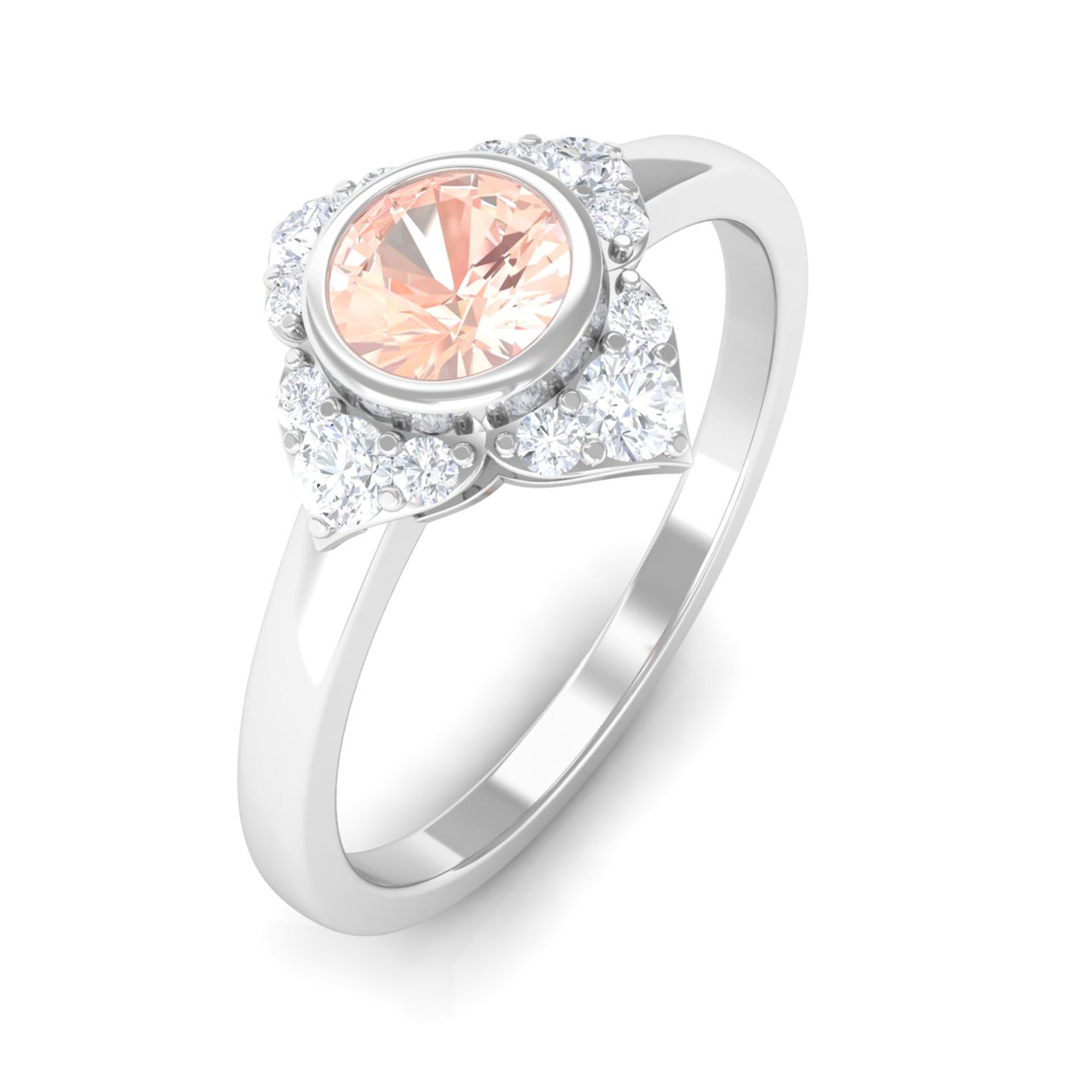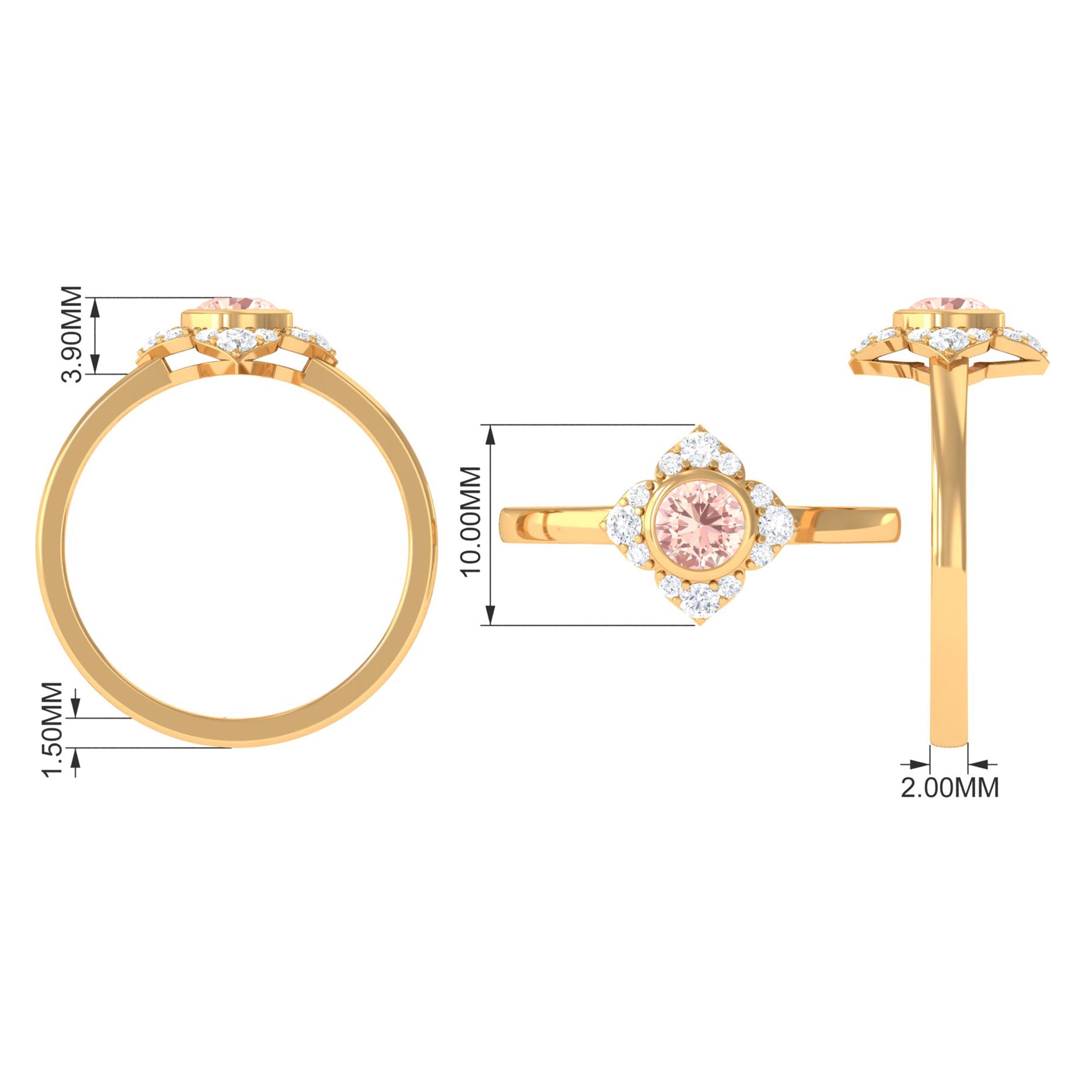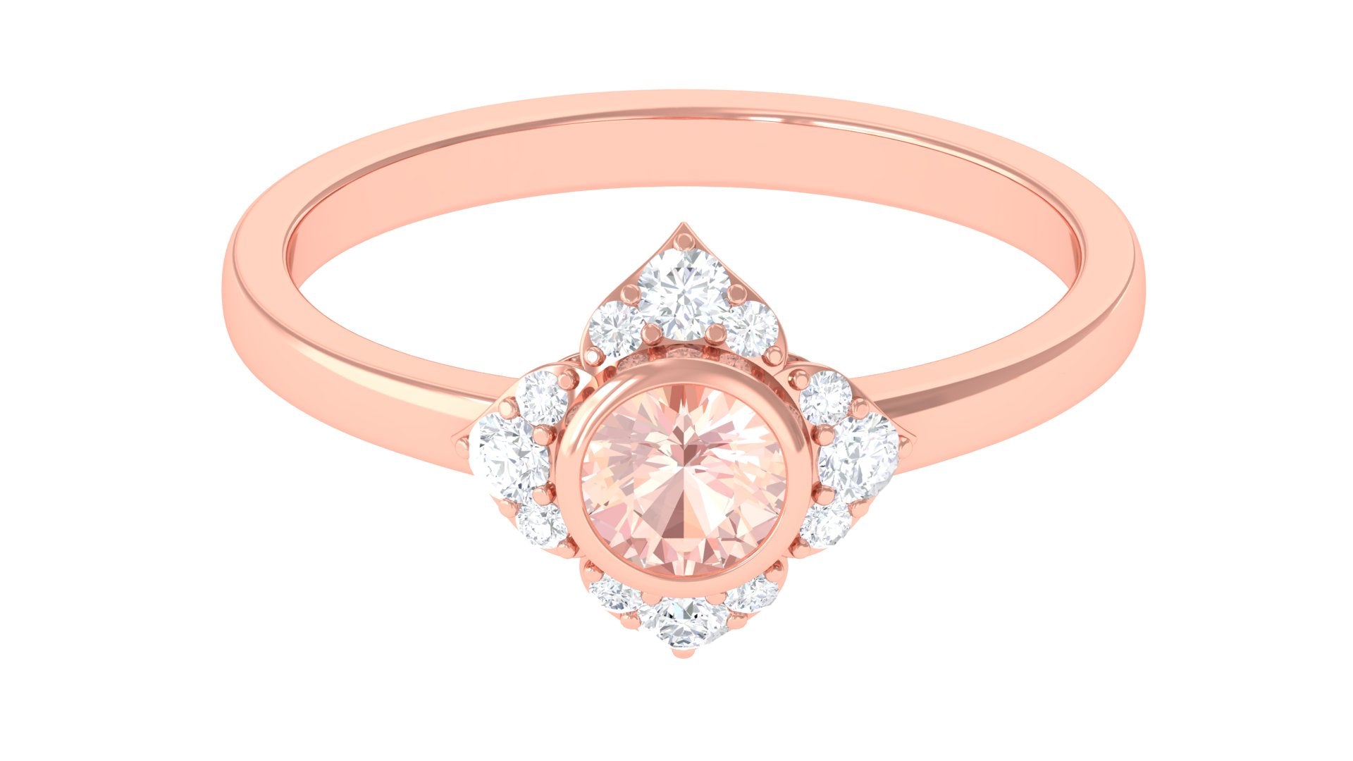 Present this Vintage Inspired Engagement Ring to your lady love. This Floral Engagement Ring is embellished with Round Shape Morganite in the center in a bezel setting with Round Shape Diamond Accent. This Morganite and Diamond Ring is crafted in gold metal.